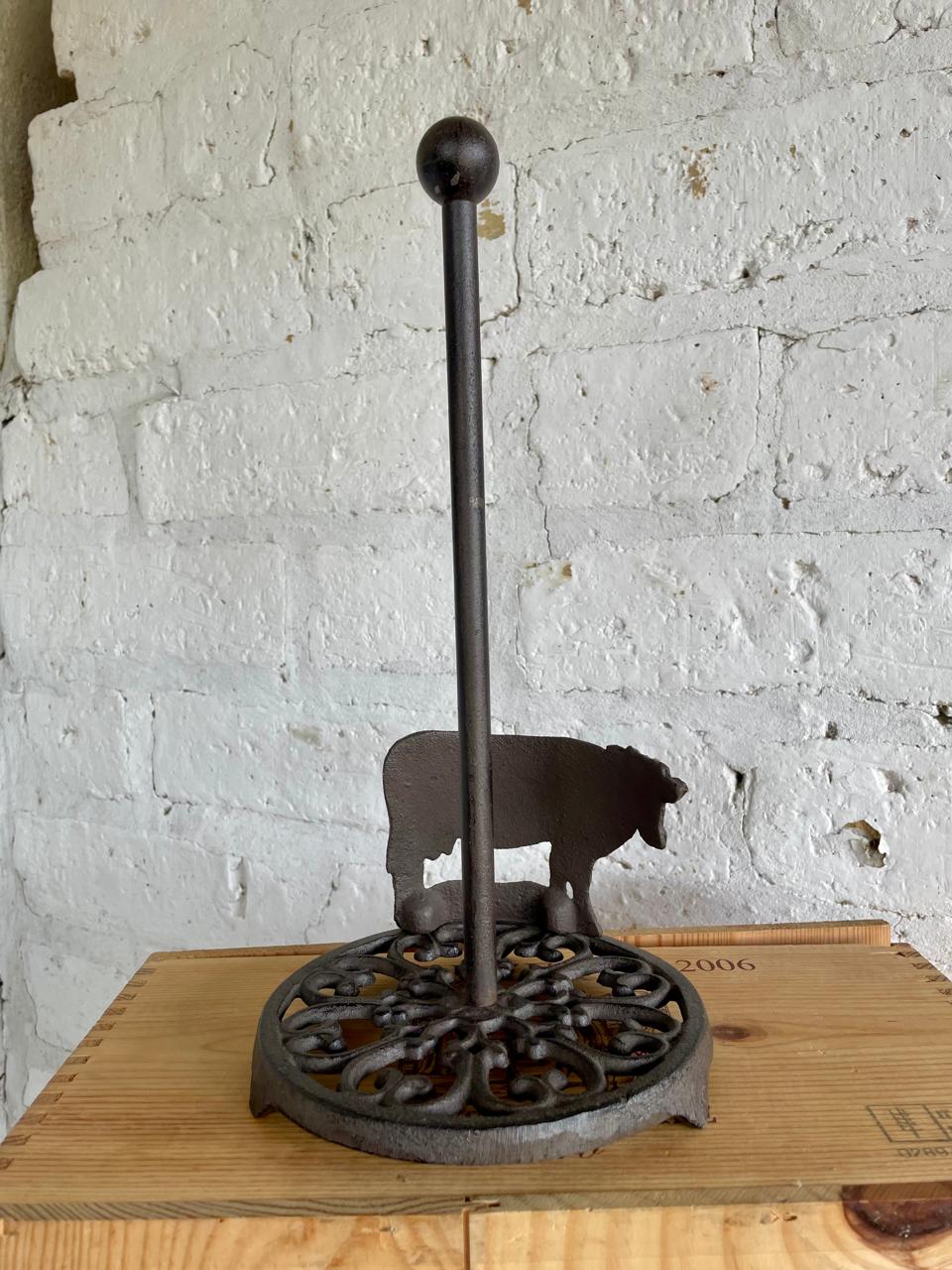 Dispensador de rollo de toallas en papel para cocina, elaborado en hierro fundido y decorada con una vaca en la base.