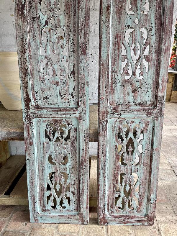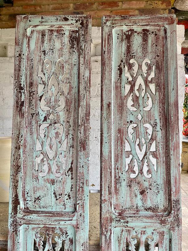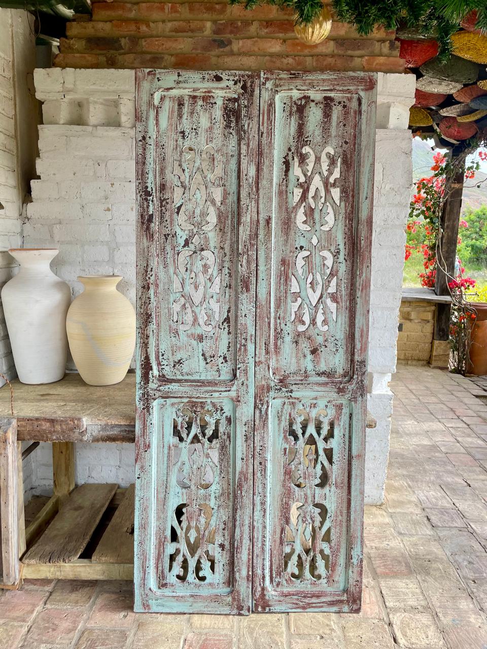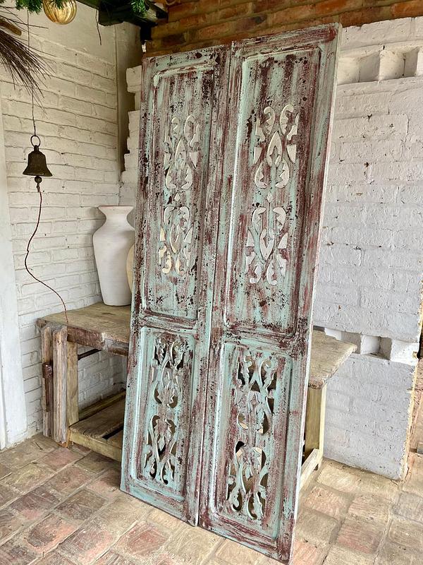 Puerta recuperada de una casa antigua de inicios del S. XX, conserva la pintura original desgastada por el paso del tiempo. La puerta se encuentra en buen estado, libre de termitas y gorgojos, presenta algunas desastilladuras, desgaste e imperfecciones generados a través de más de un siglo de existencia.