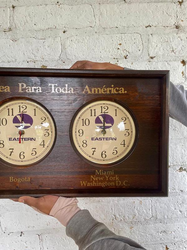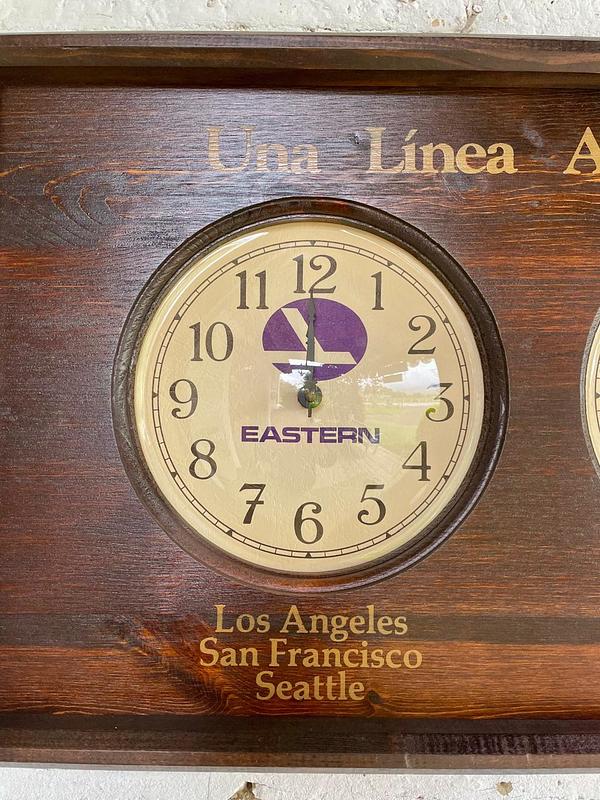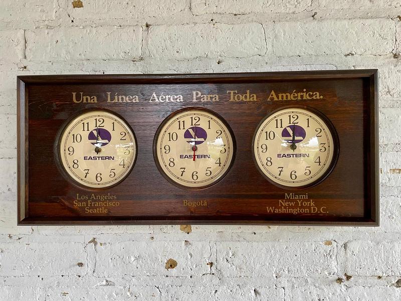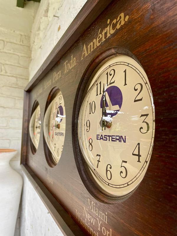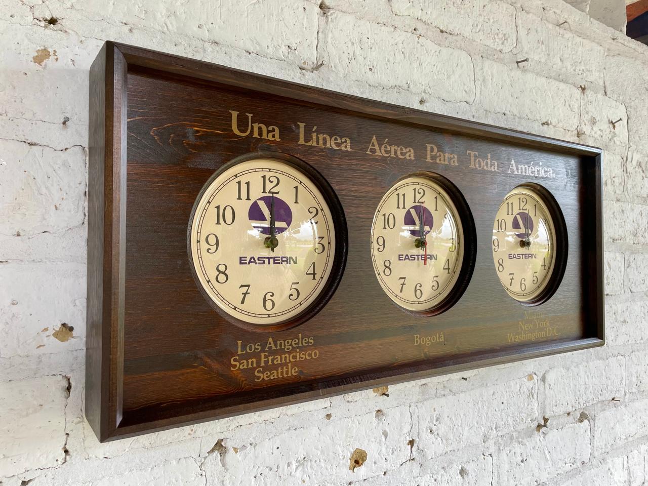 Reloj utilizado en diferentes aeropuertos de América para mostrar tres zonas horarias simultáneamente. Ensamblado en Estados Unidos en los años ochenta: la caja es en madera, los mecanismos de los relojes de pila AA son japoneses y los protectores cóncavos de acetato grueso. Pieza de colección con la publicidad "Una Línea Aérea Para Toda América", de la aerolinea Estern Air Line liquidada en 1991. Cuenta con tres esferas individuales que permiten seguir la hora en diferentes ciudades clave para la red de la aerolínea en ese momento: Los Ángeles, San Francisco y Seattle. Bogotá. Miami, Nueva York y Washington D.C. La madera de la caja se encuentra en buen estado y los mecanismos de cuarzo de los relojes funcionan bien.