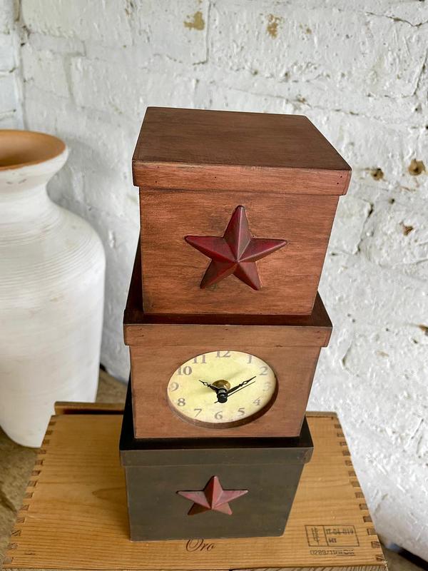 Reloj de mesa de diseño rústico de cajas en madera que evoca una estética de "country primitivo". Compuesto por tres cajas de diferentes tamaños apiladas en forma de torre decoradas con 2 estrellas metálicas, un símbolo común en la decoración de estilo American Vintage. En la caja central se encuentra el tablero y el mecanismo que funciona con una pila AA