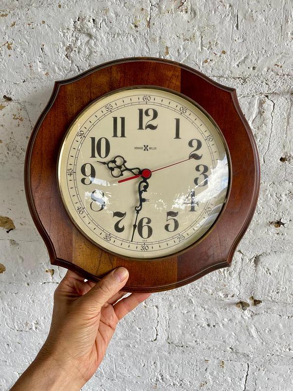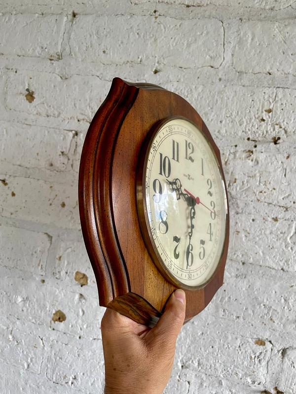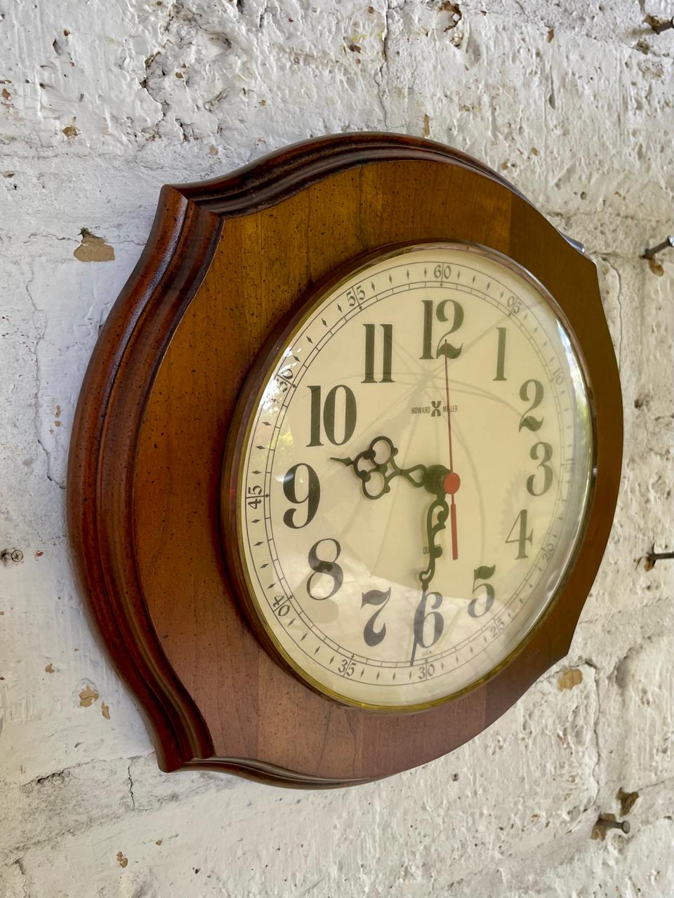 Reloj Howard Miller modelo 612-607, fabricado en Estados Unidos en los años noventa. El marco es en madera maciza biselada, el vidrio cóncavo tiene marco en bronce, funciona bien con una pila AA. Se encuentra en buen estado. MEDIDAS: Diámetro marco de madera: 31 cm. Diámetro del vidrio 20 cm.
