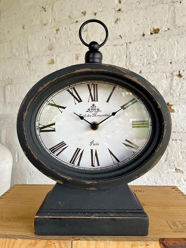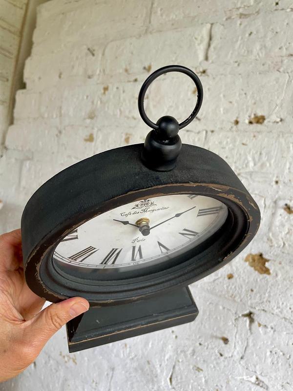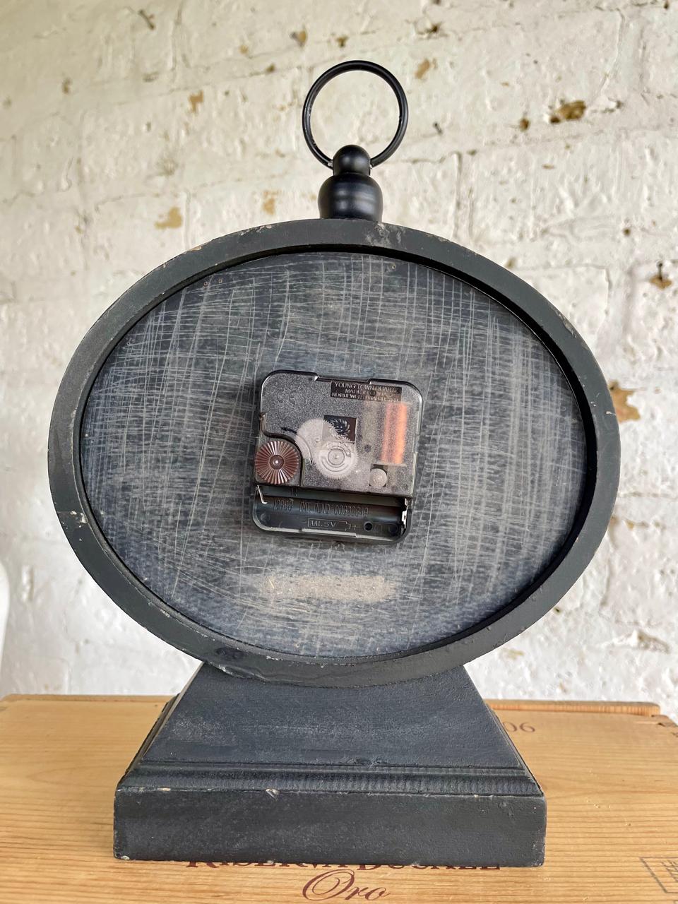 Reloj elaborado recientemente con apariencia antigua, funciona con una pila AA, la caparazón es de madera decorada con pintura negra desgastada, el tablero recrea un reloj frances de principio del S XX. MEDIDAS: Alto 25,5 cm. Frente 20 cm. Ancho 4,5 cm. Base 14 x 7,5 cm.