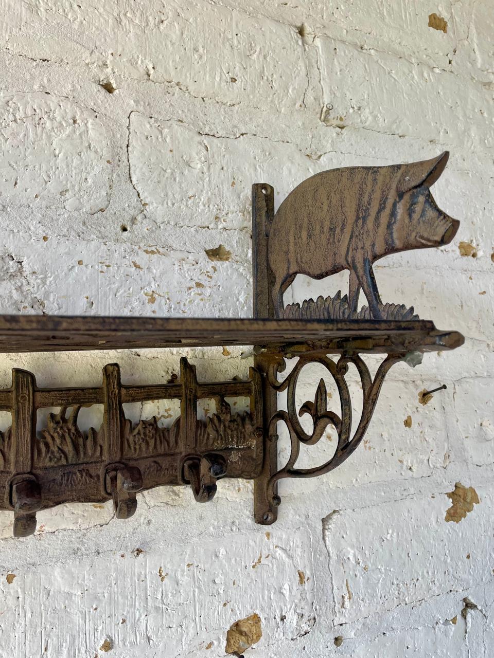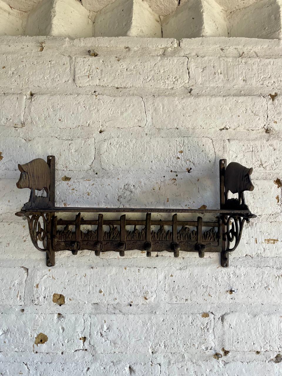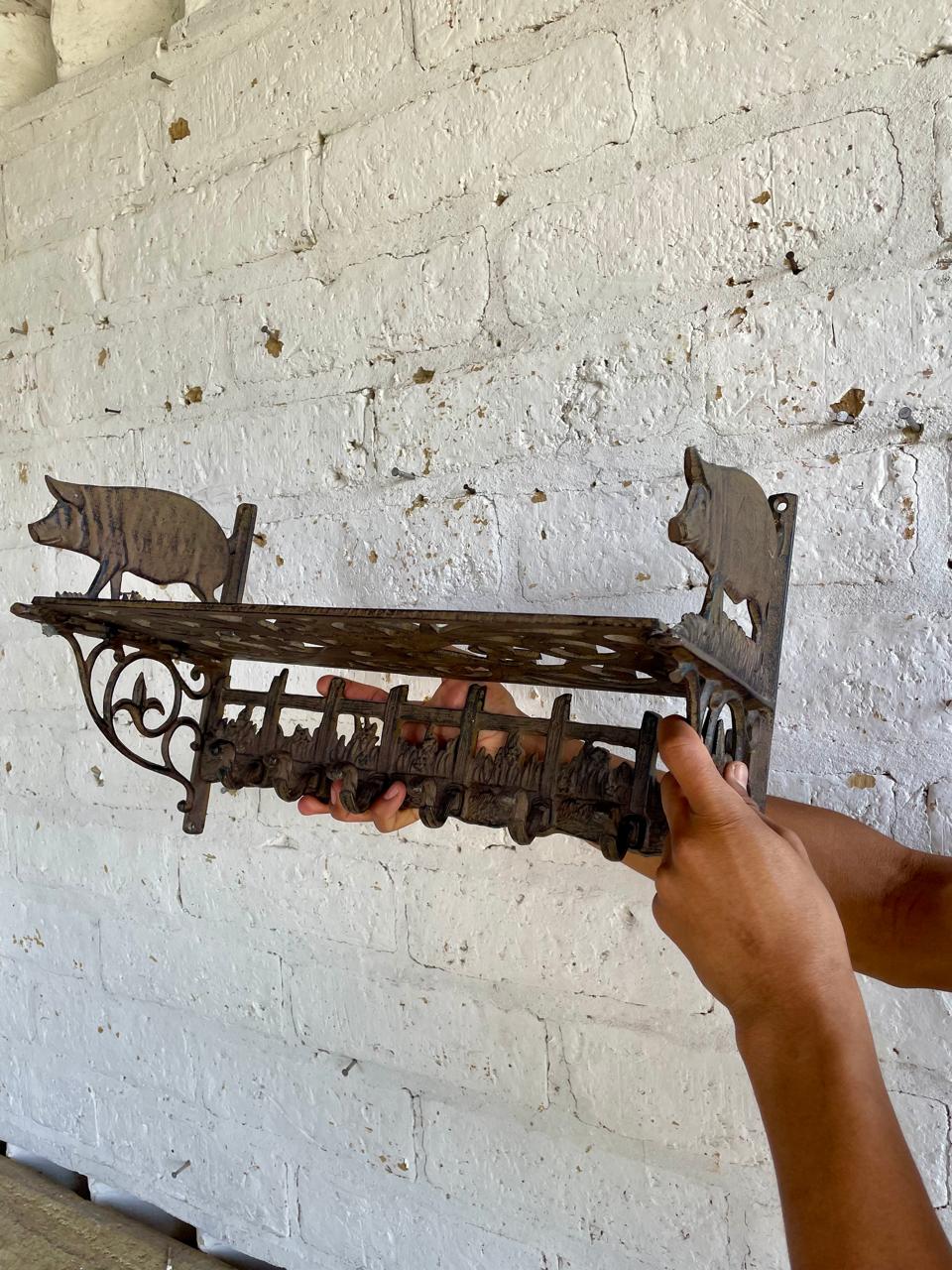 Repisa en hierro fundido con perchero de 6 ganchos en la base, los laterale estan decorados con cerdos, la repisa base está formada por arabescos. Una repisa funcional decorativa de estilo rustico.