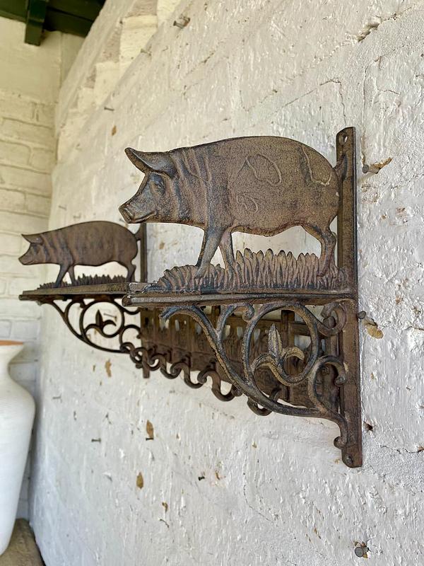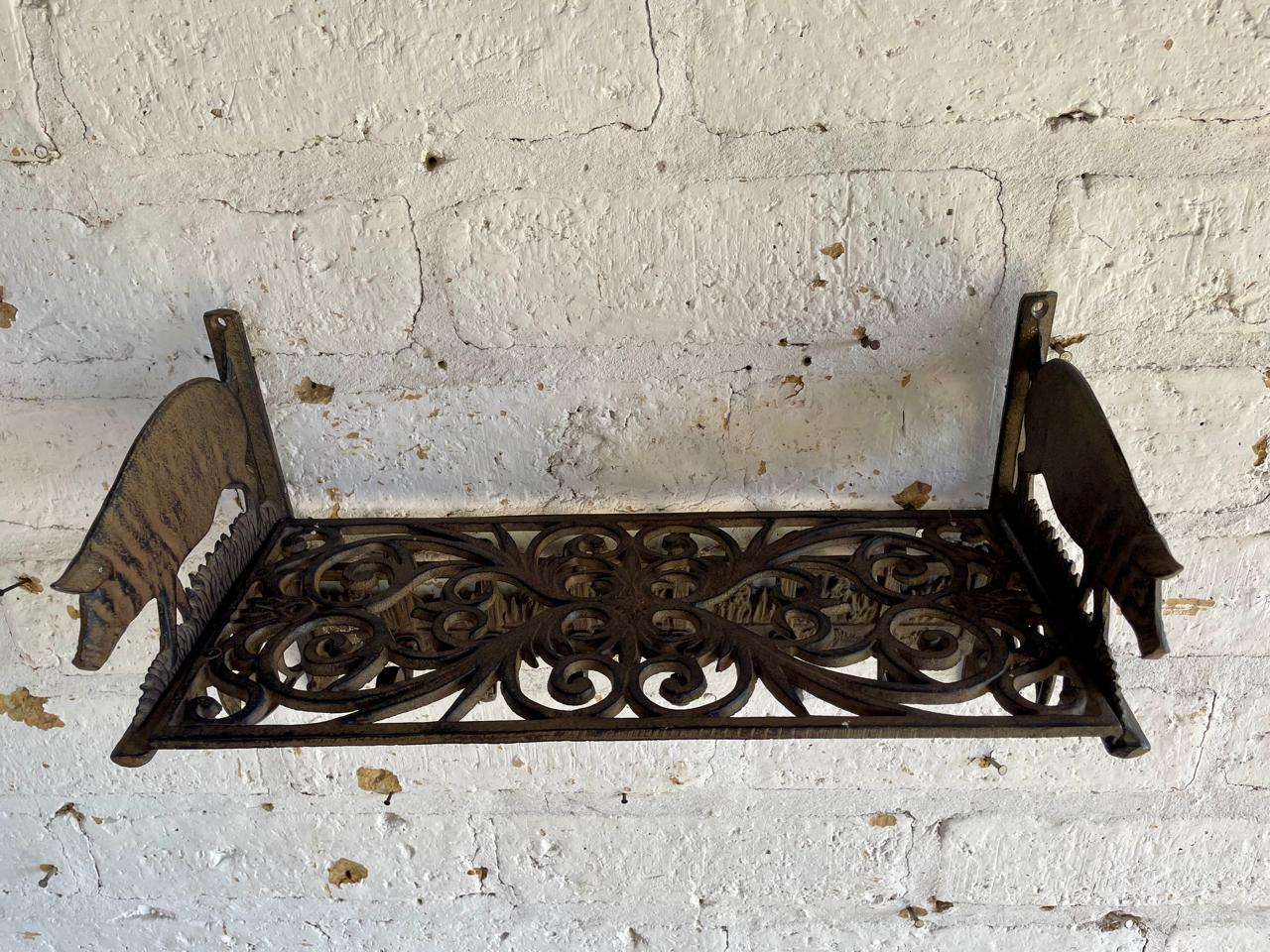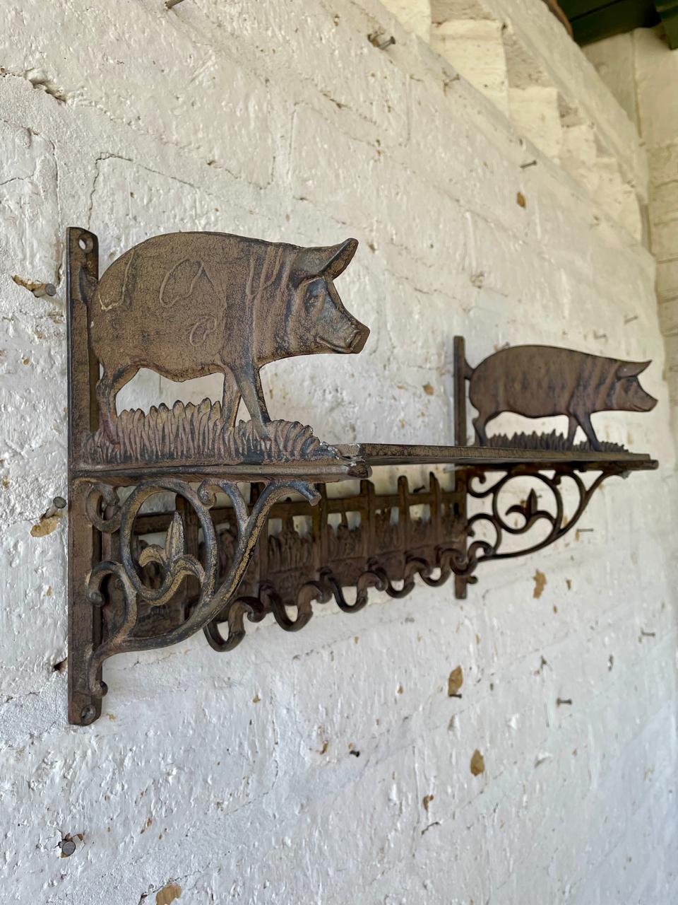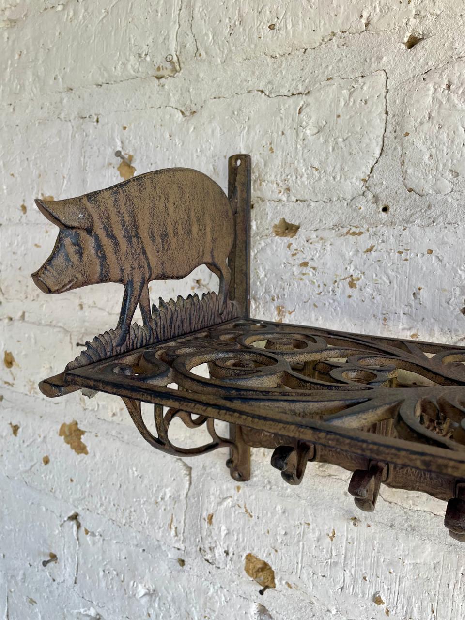 Repisa en hierro fundido con perchero de 6 ganchos en la base, los laterale estan decorados con cerdos, la repisa base está formada por arabescos. Una repisa funcional decorativa de estilo rustico.