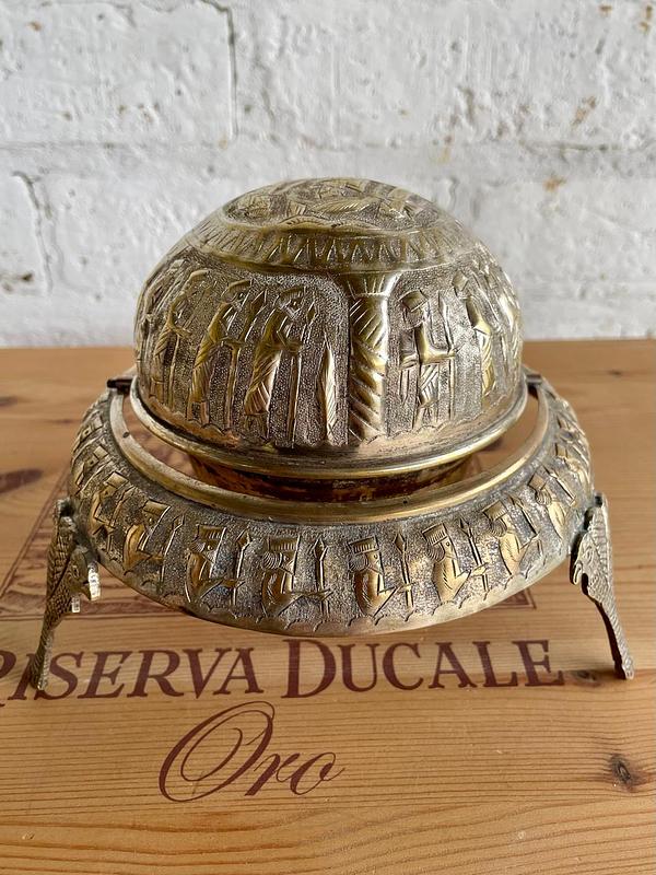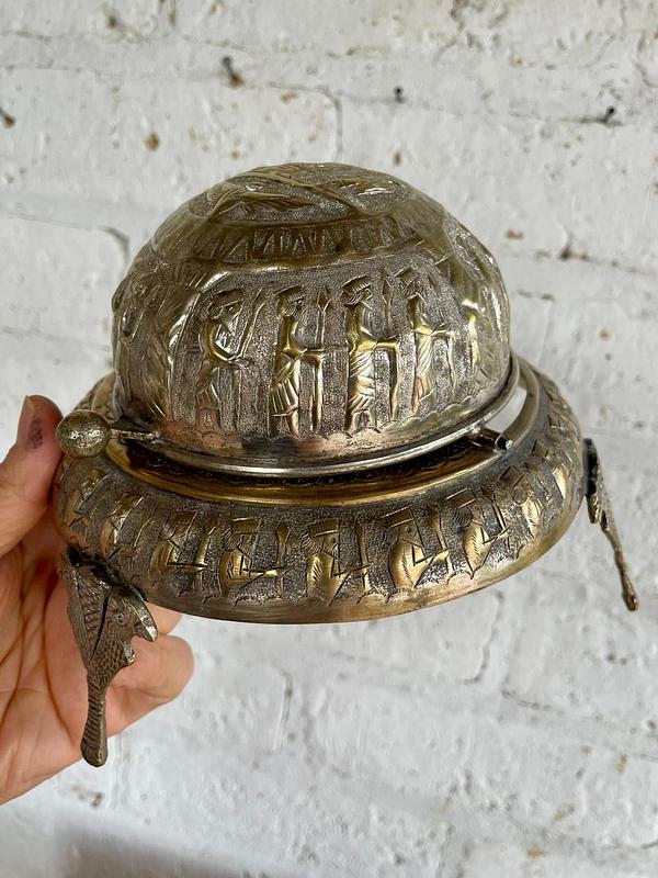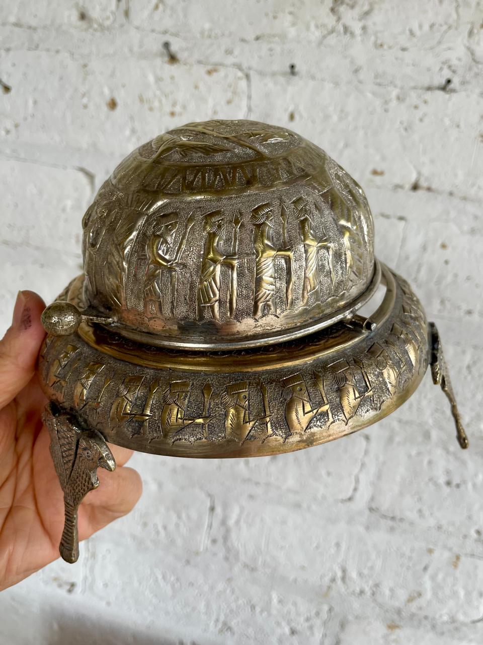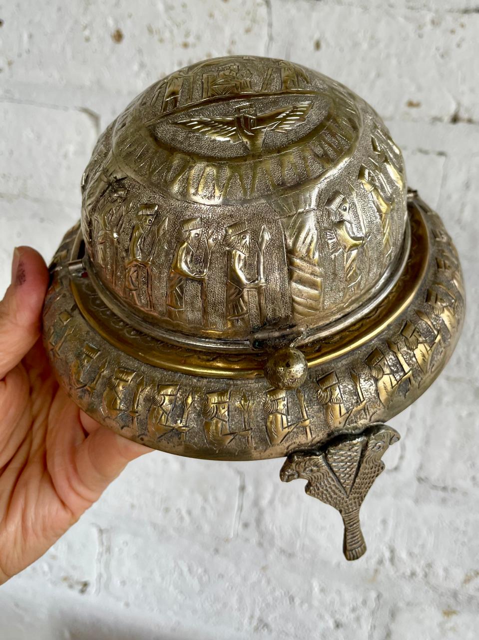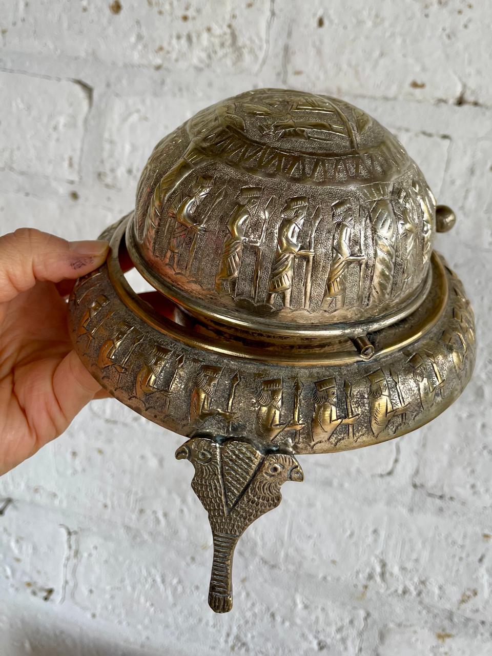 Servidor de caviar de los años veinte elaborado a mano en la antigua Persia (Irán). La tapa en forma de cúpula se puede enrollar por debajo de la base, repujado artesanalmente con figuras alusivas al imperio persa. Apoyado sobre 3 patas formadas por dos águilas. Se encuentra en buen estado.