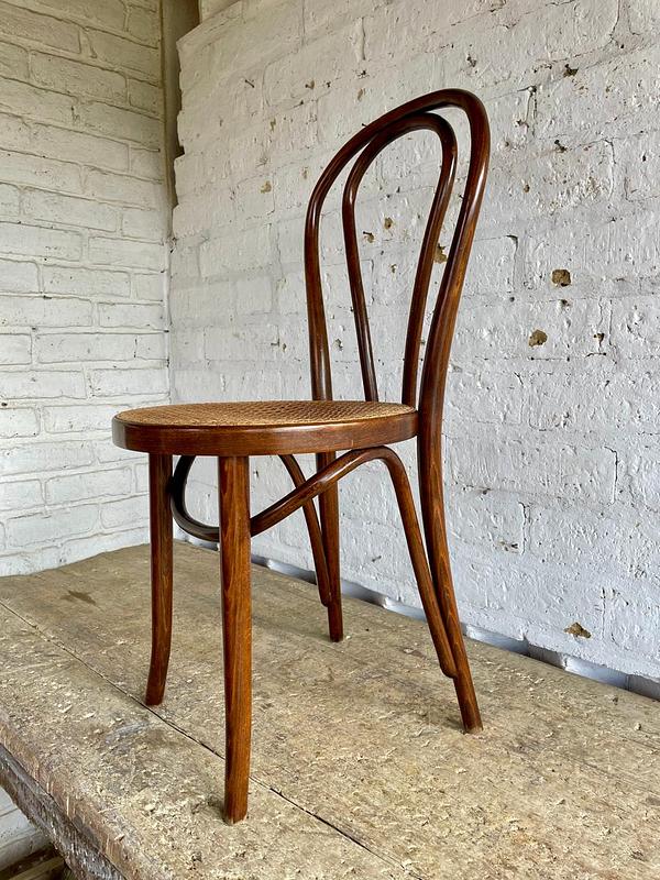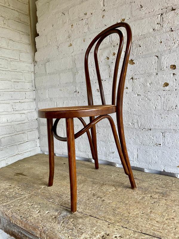 Silla fabricada por artesanos colombianos en los años ochenta con madera doblada al vapor técnica aprendida de maestros europeos, el asiento está tejido en ratán. Se encuentra en buen estado con los desgastes generados por el uso y el paso del tiempo.