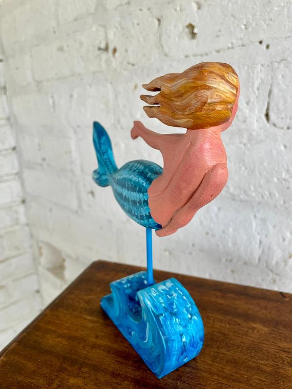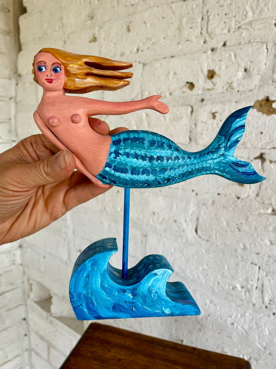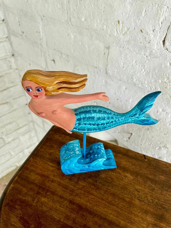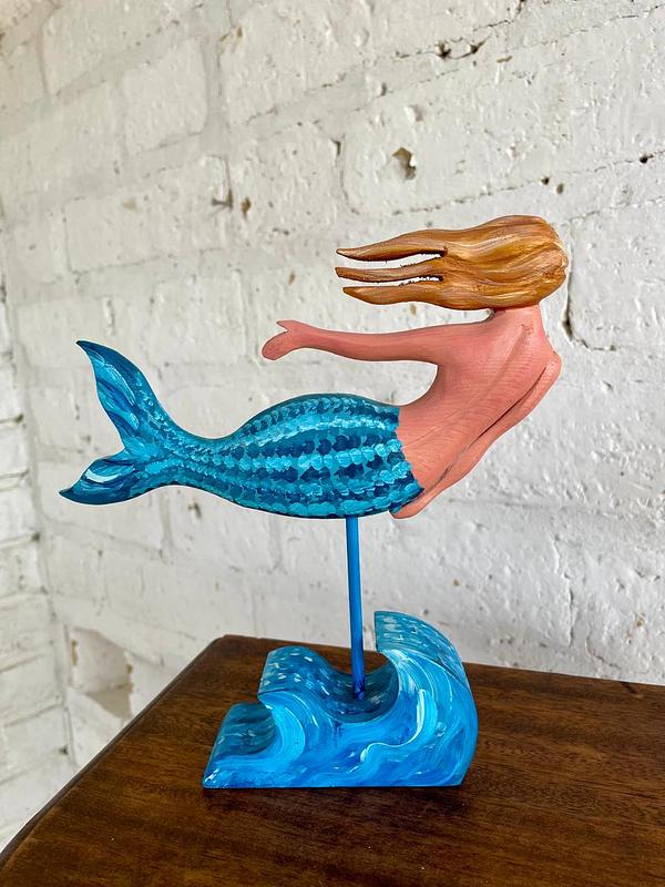 Figura de sirena tallada en madera y pintada a mano.