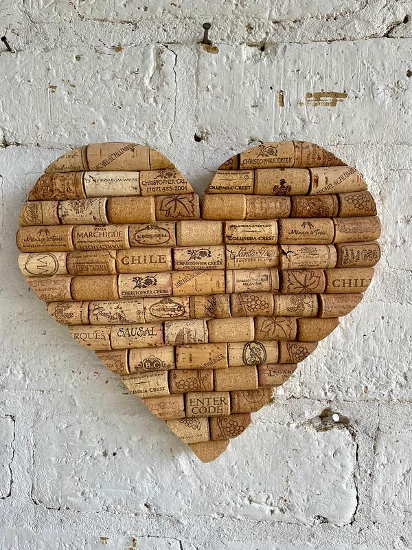 Sobre una base de madera MDF se armó un corazón con corchos reciclados de botellas de vino.