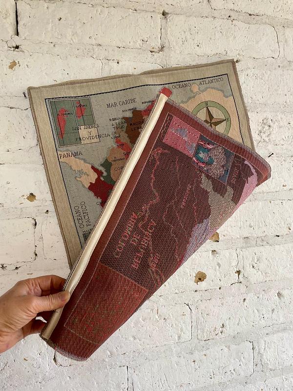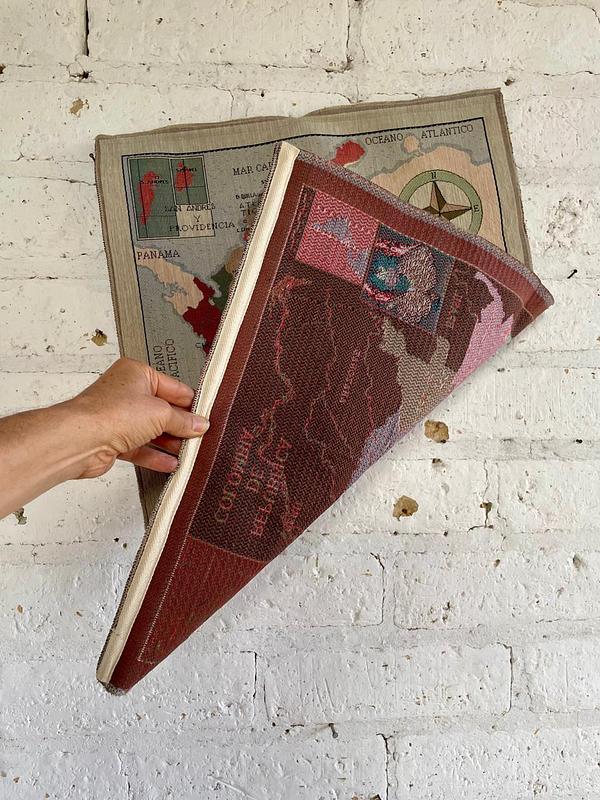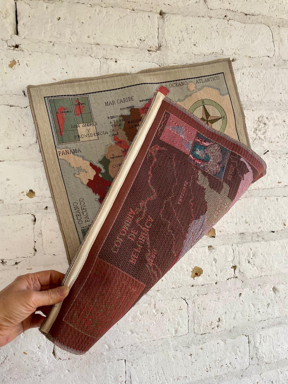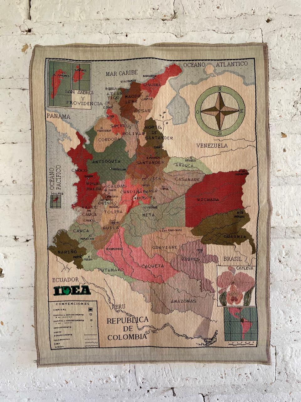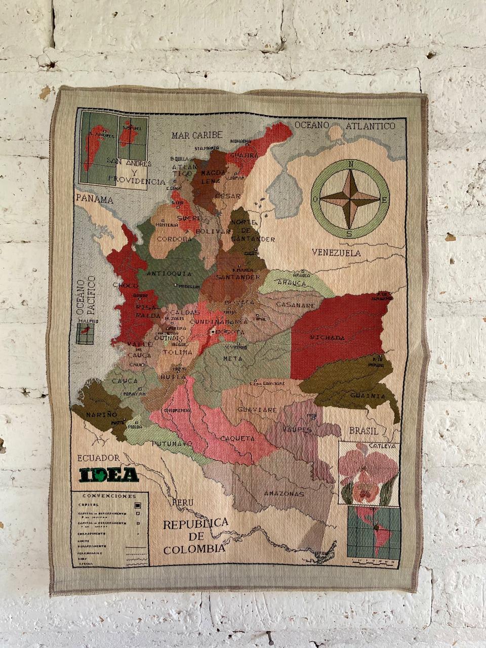 Tapíz decorativo del mapa de la República de Colombia con la división política y límites internacionales. Incluye elementos decorativos como la rosa de los vientos y la ilustración de la orquídea Cattleya, flor nacional de Colombia. Tiene bordado el sello del Instituto para el Desarrollo de Antioquia (IDEA). Se encuentra en buen estado.
