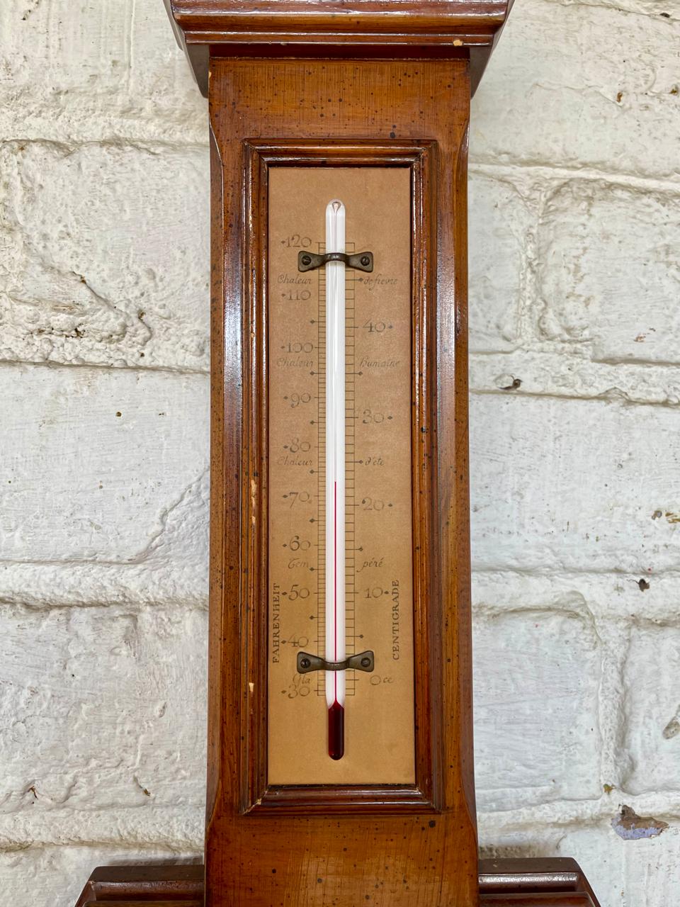 El tablero del barómetro tiene indicaciones en francés como "Tempête" (Tormenta), "Pluie" (Lluvia), "Variable", "B. Temps" (Buen tiempo) y "Très sec" (Muy seco). El termómetro está funcionando, registra grados centígrados y fahrenheit. El barómetro se ve en buen estado, pero se recomienda hacerlo revisar y calibrar por un experto. MEDIDAS: Alto 71 cm. Largo 35 cm. Espesor 5cm.