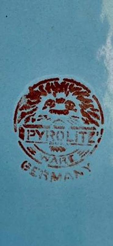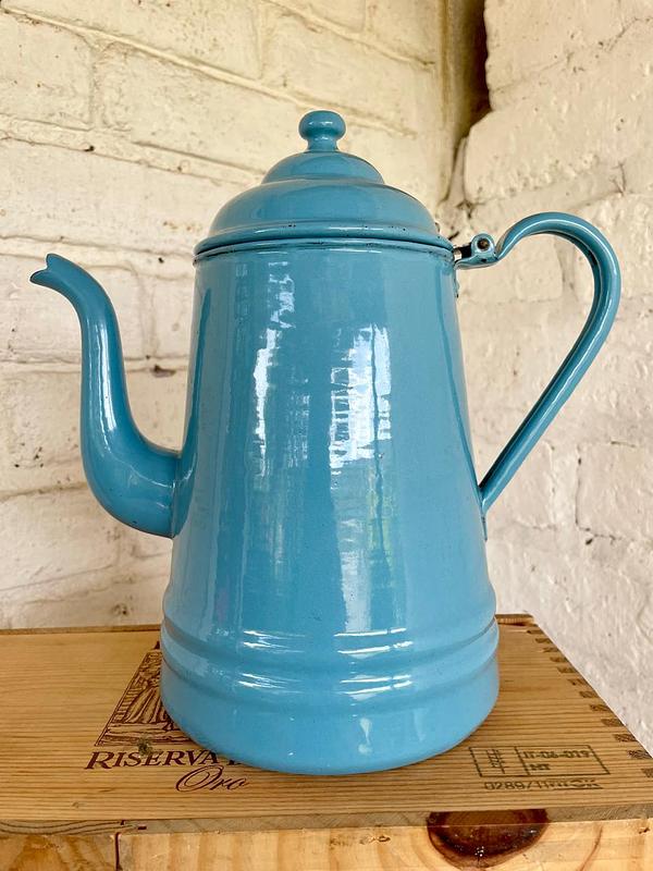 Cafetera de esmalte azul y cuello de cisne de mediados de siglo, década de 1940, fabricada en Alemania. La base tiene estampado el sello PYROLITE WARE GERMANY. Presenta algunas desportilladuras en el esmalte.