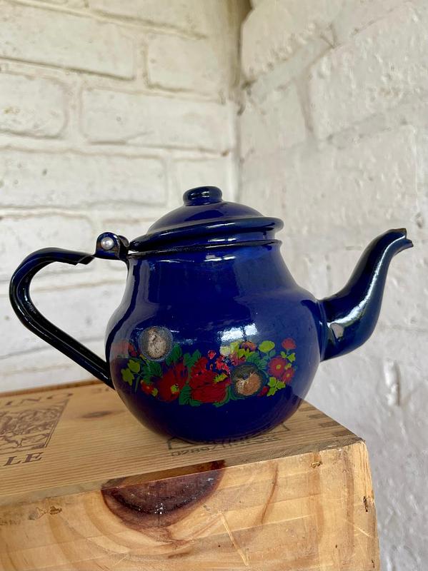 Pequeña tetera metálica recubirerta con esamalte horneado azul y decorada con flores de los años 60. Presenta desmaltaduras.