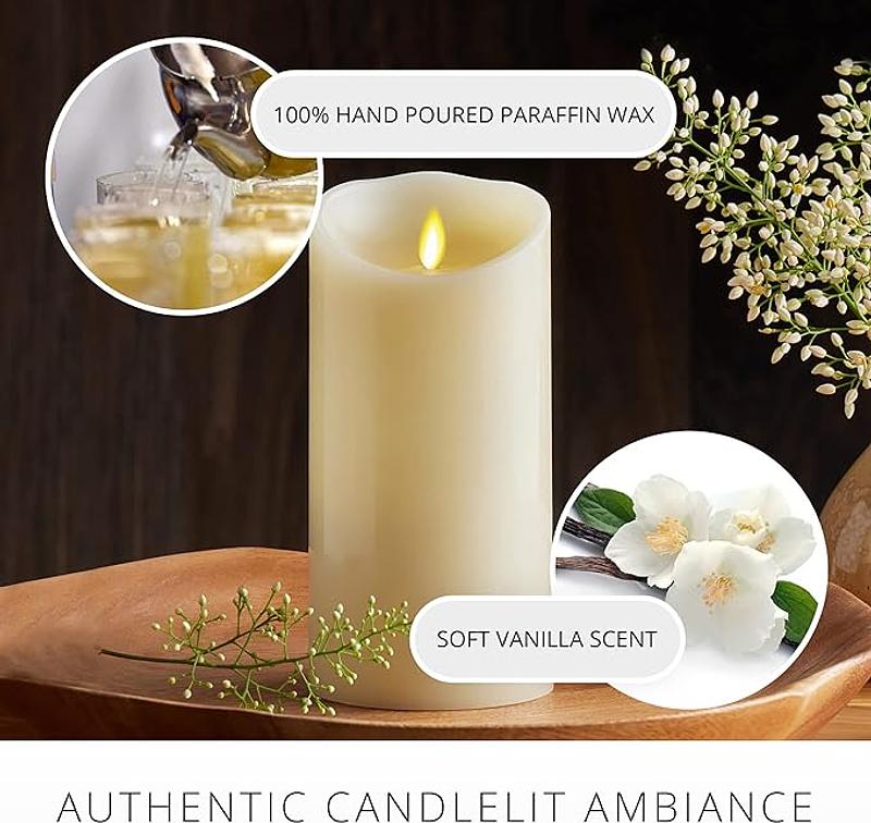Vela de luz led, de la marca Luminara, funciona con dos pilas D2, está recubierta con parafina 100% pura dando apariencia de una vela real con efecto de llama titilante. Son más seguras de usar que las velas tradicionales, no se produce combustión real o consumo de cera, no se libera hollín ni productos químicos en el aire, lo que las hace perfectas para su uso en interiores. No incluye las pilas