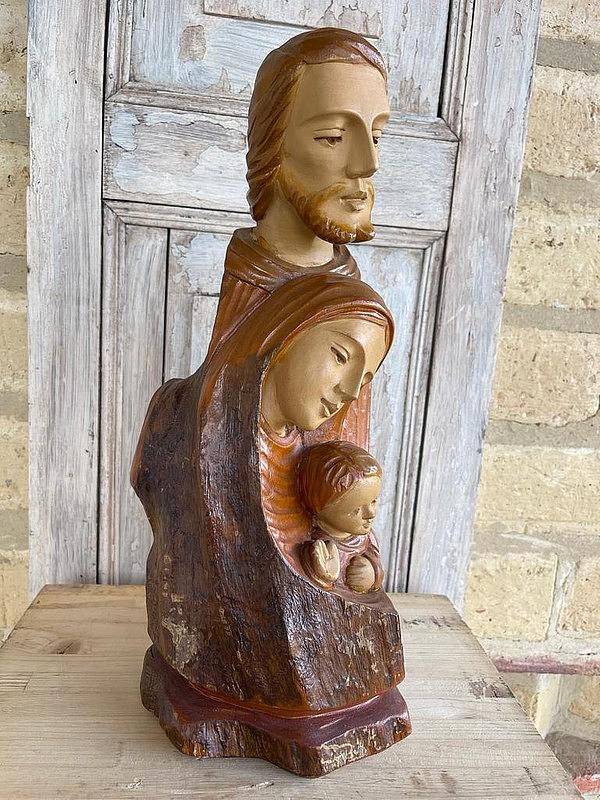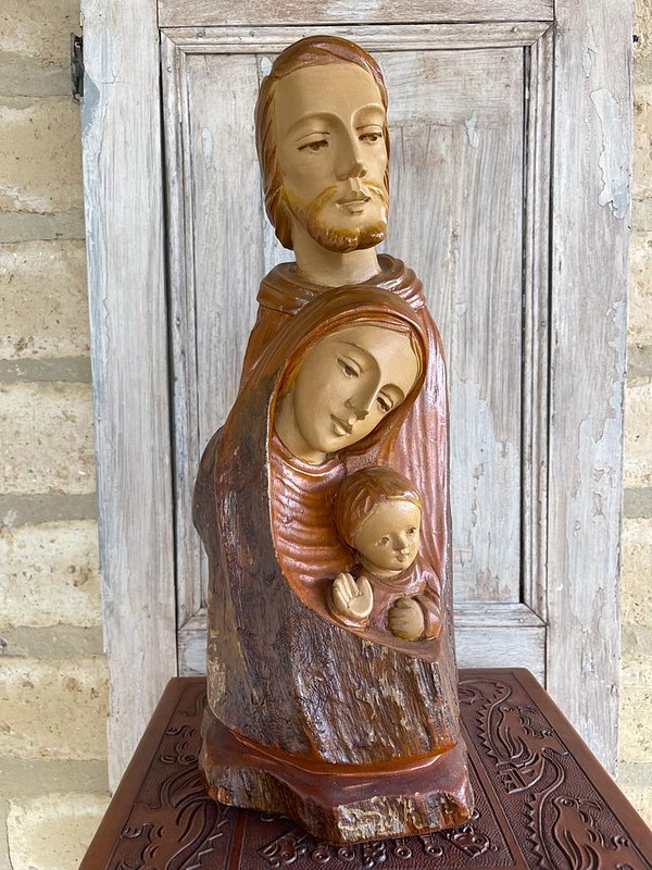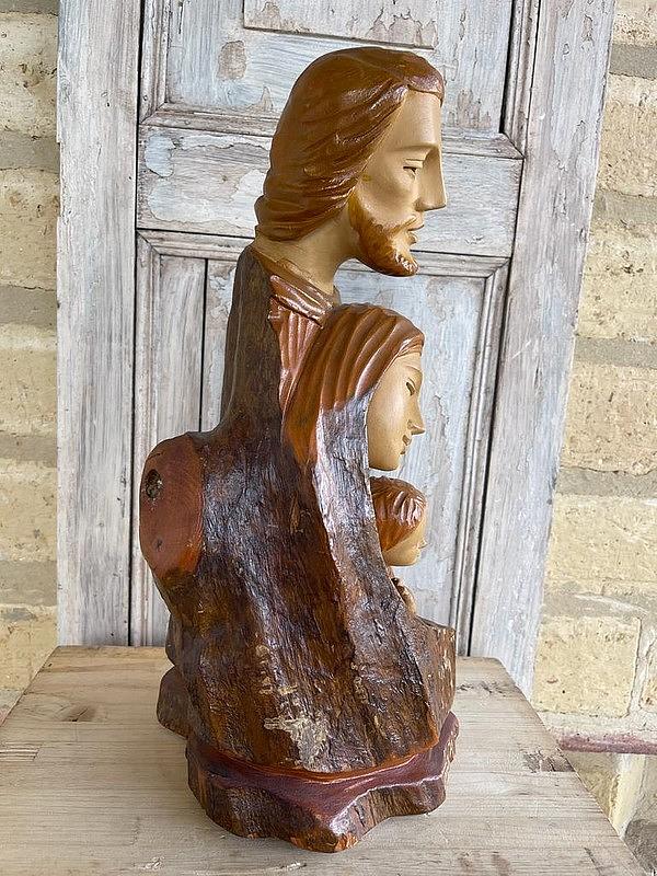 Sobre un tronco rústico el artista talló delicadamente los rostros de San José, María y el Niño Jesús.