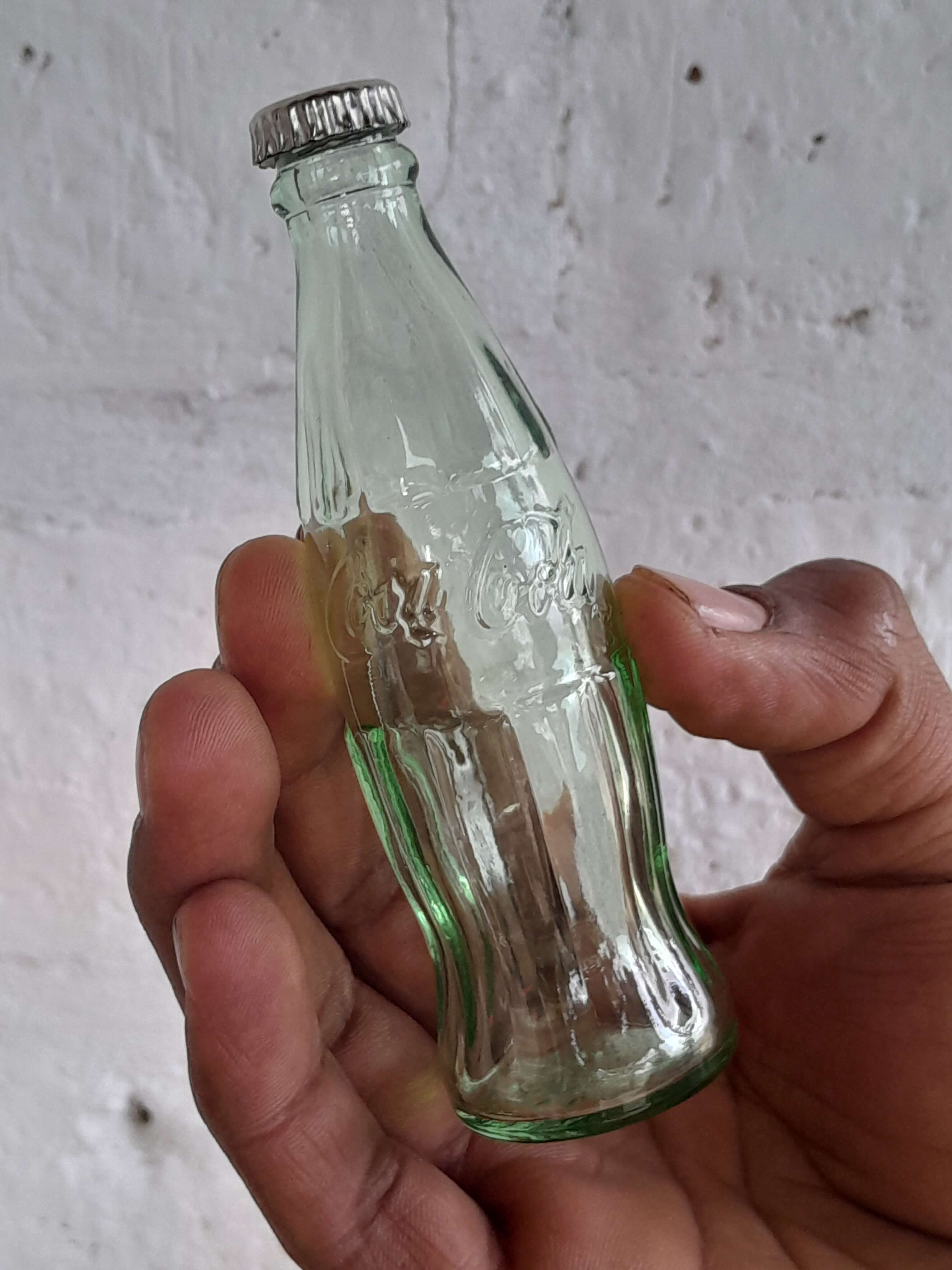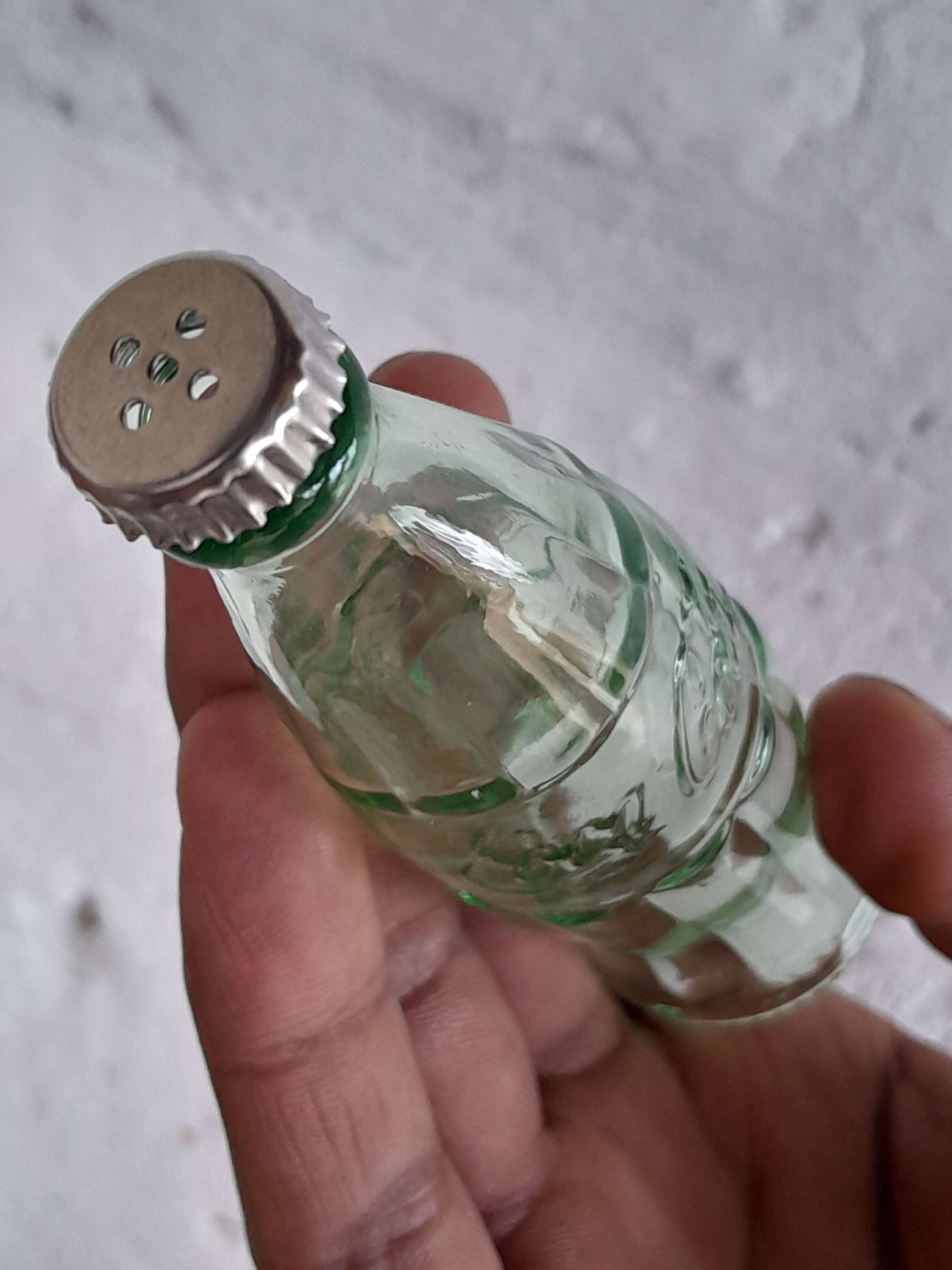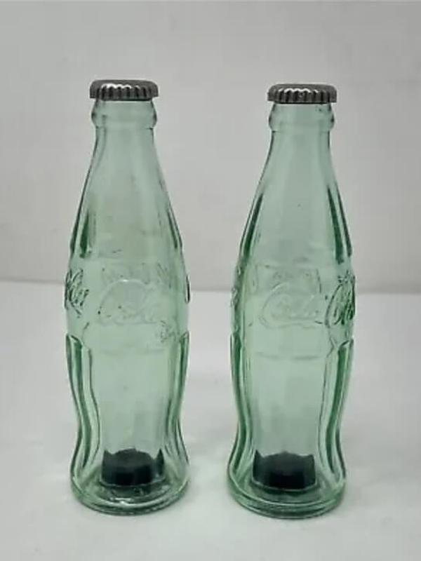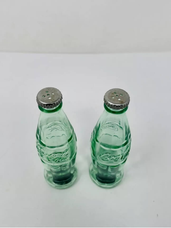 Pareja de saleros con la forma clásica de las botellitas de coca cola decoradas en alto relieve y tapa metálica. Producida por Coca cola company.