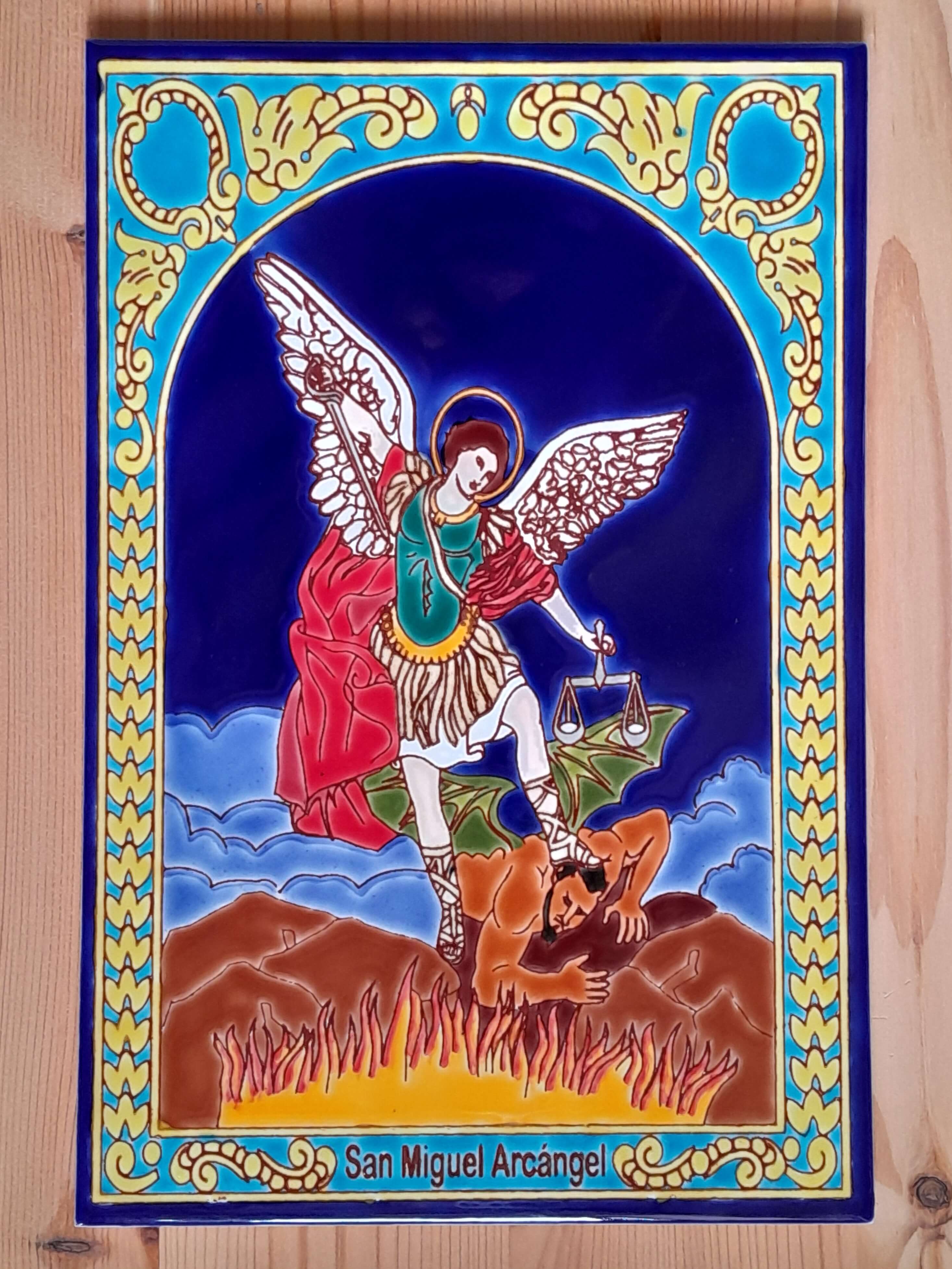 Pintada a mano sobre baldosa y quemadas a alta temperatura. Apta para exteriores. Elaborada con barnices de calidad para garantizar su exposición a la intemperie, sol, lluvia, etc., sin desteñirse. Colores garantizados de por vida. Ideal para empotrar en la pared, decorar fachadas y portales.