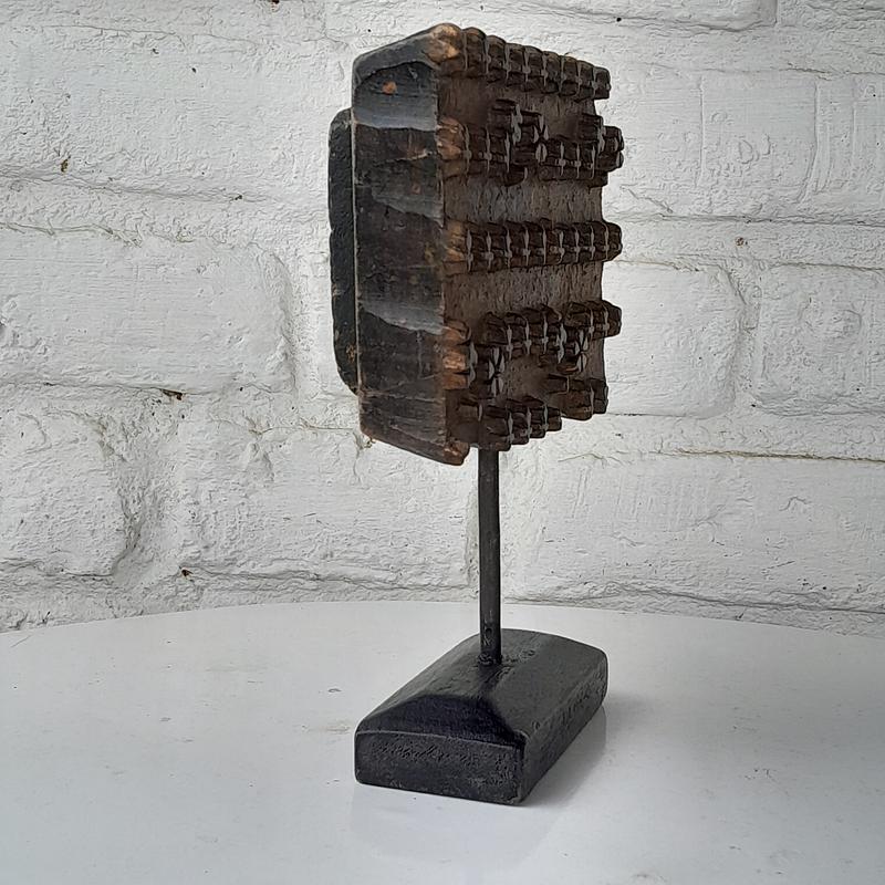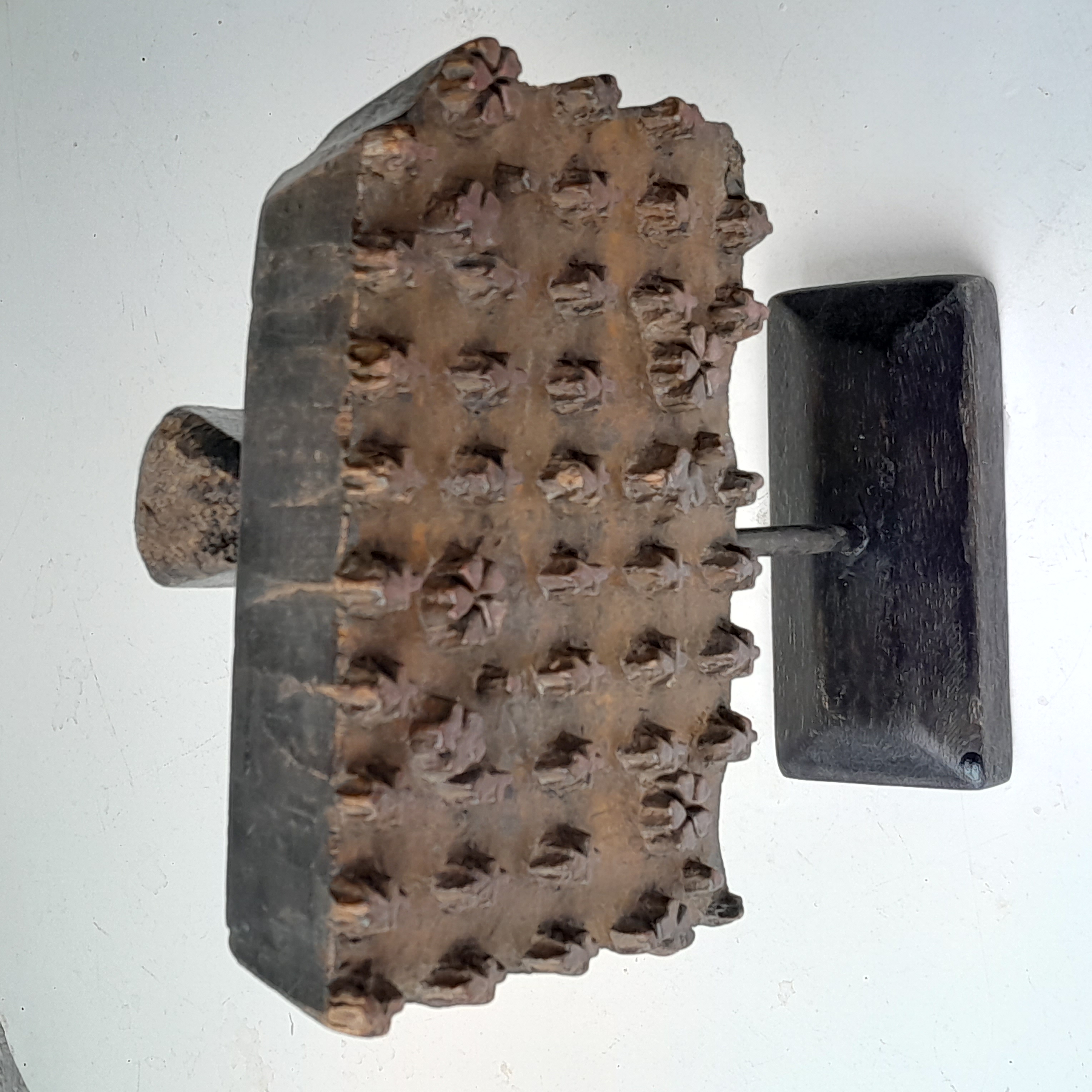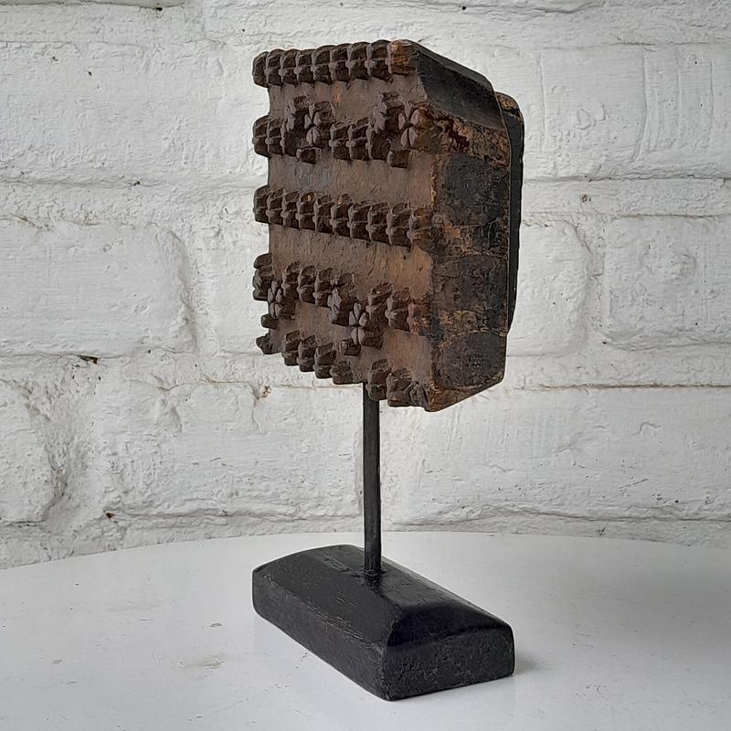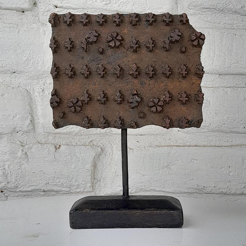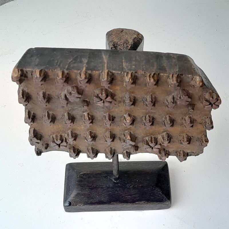 Bloque de madera tallada con flores, hojas y petálos, fabricado y utilizado en la India en 1890 para estampar tela, en la parte trasera tiene un asa para sujetarlo. Se le adicionó una base de madera como exhibidor. Se encuentra en buen estado con desgastes por el uso, tiene rastros de la pintura utilizada en el proceso de estampado.