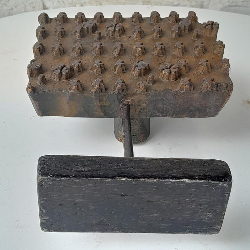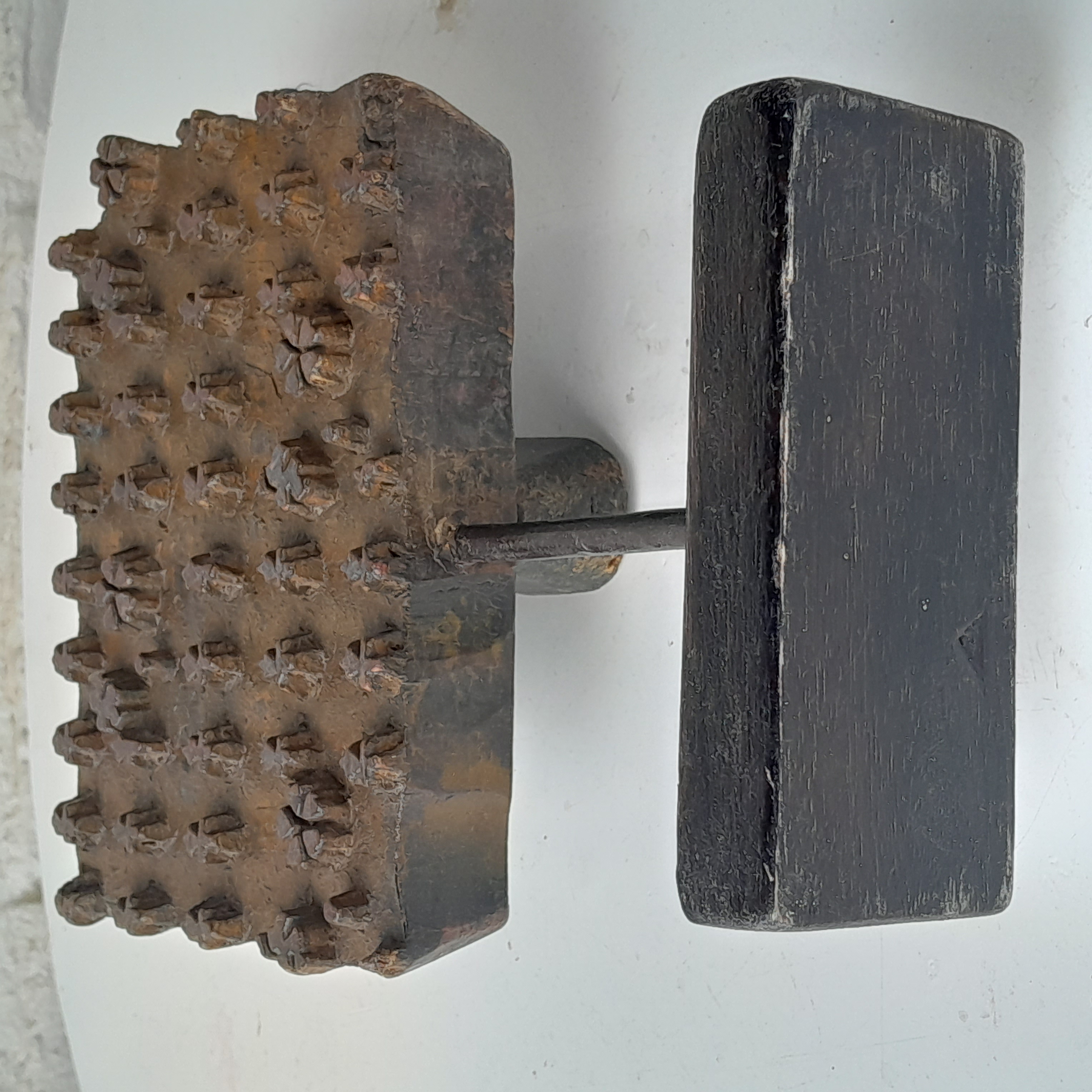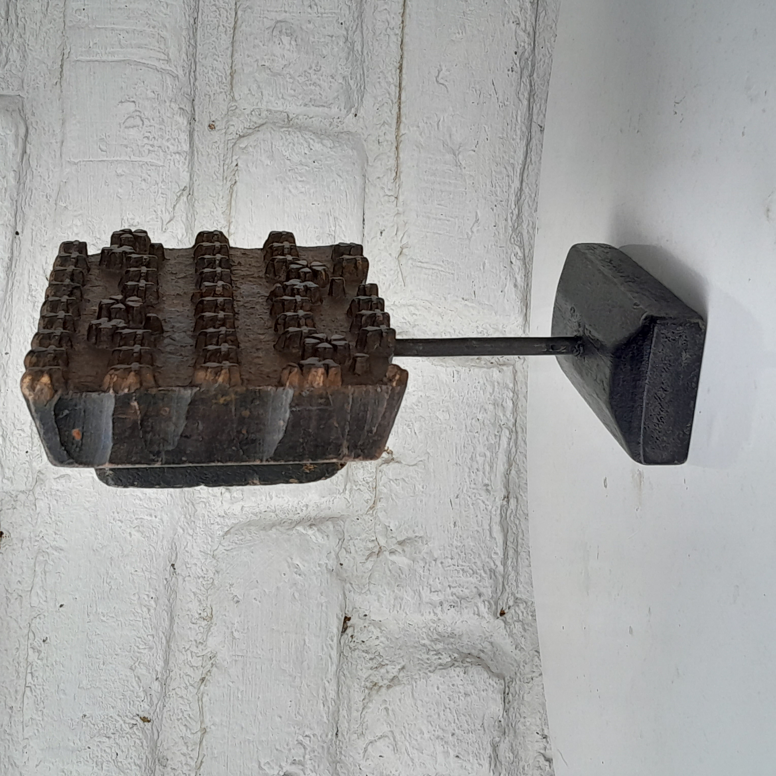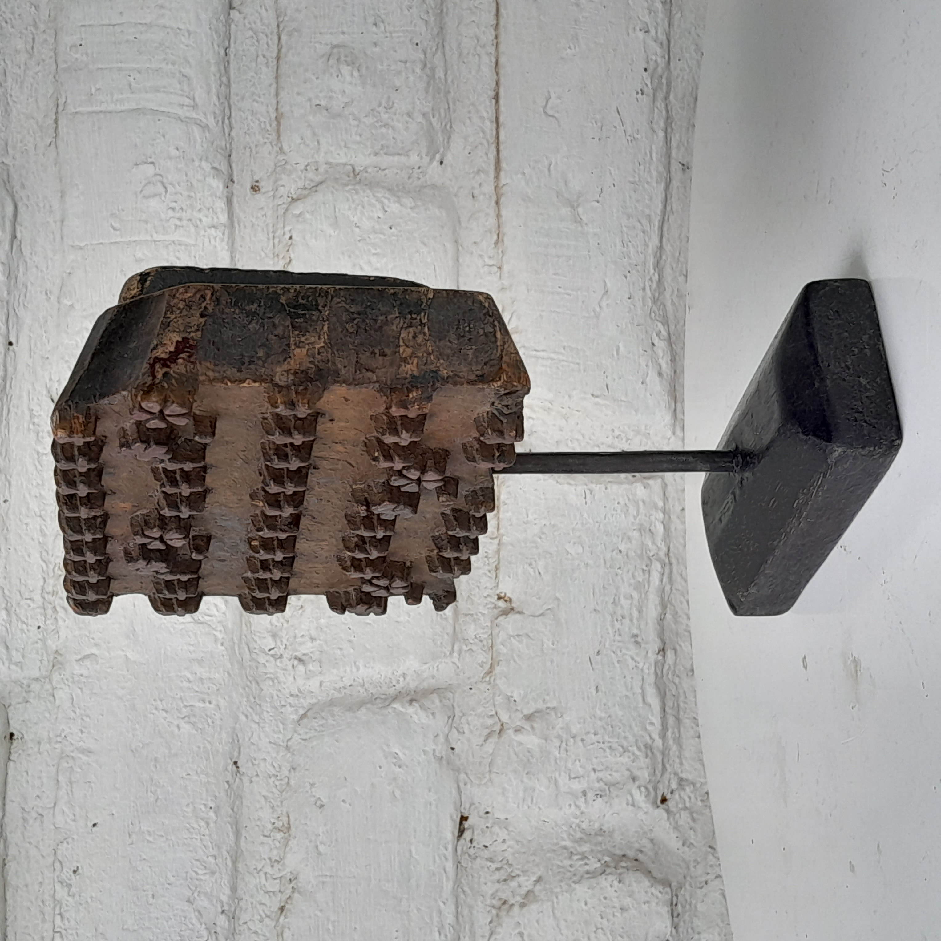 Bloque de madera tallada con flores, hojas y petálos, fabricado y utilizado en la India en 1890 para estampar tela, en la parte trasera tiene un asa para sujetarlo. Se le adicionó una base de madera como exhibidor. Se encuentra en buen estado con desgastes por el uso, tiene rastros de la pintura utilizada en el proceso de estampado.