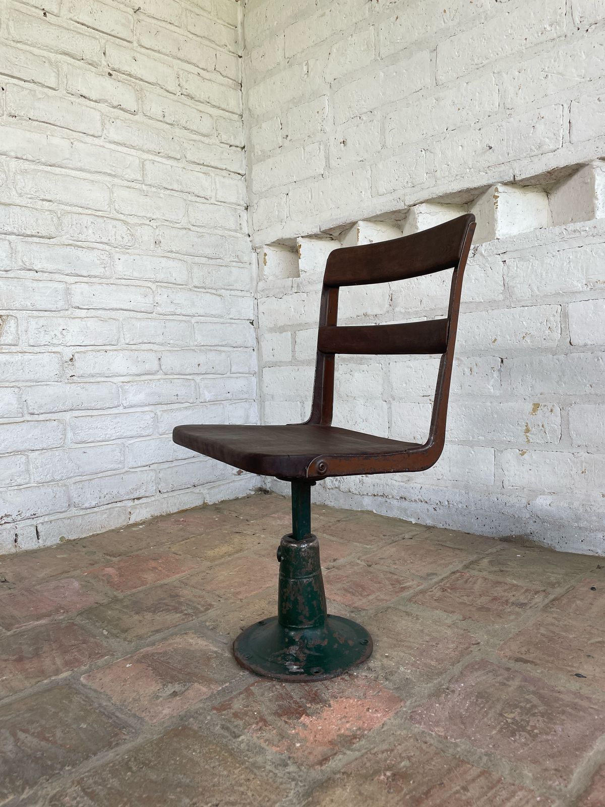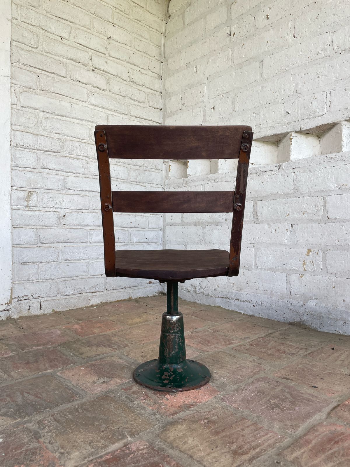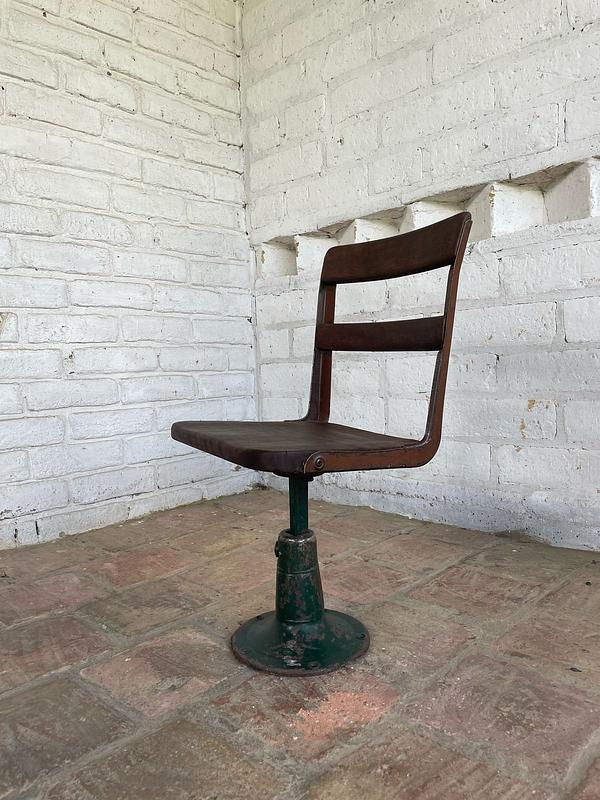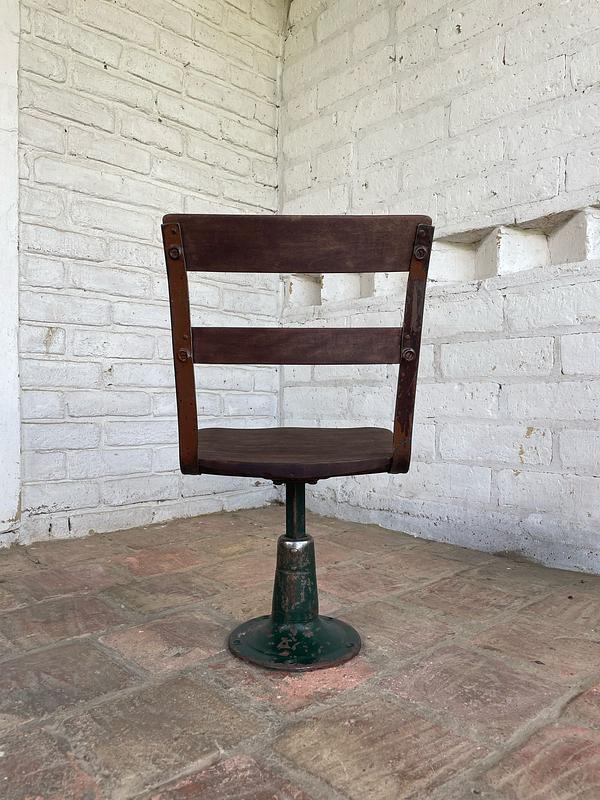 Esta silla hacía parte de un pupitre escolar de principio del S XX. La base y soportes son en hierro y la superficie y respaldar de madera. La base es giratoria.