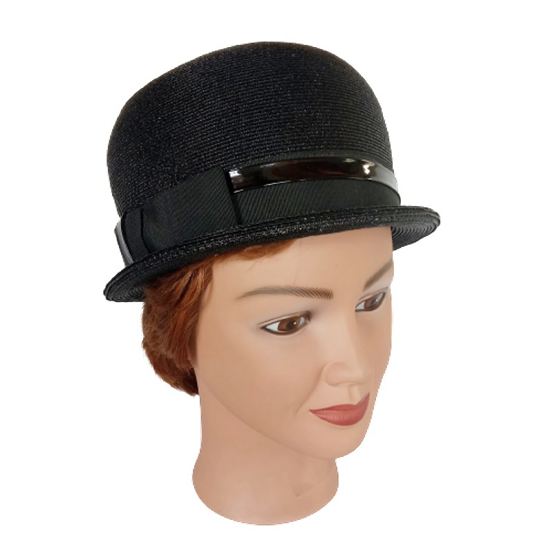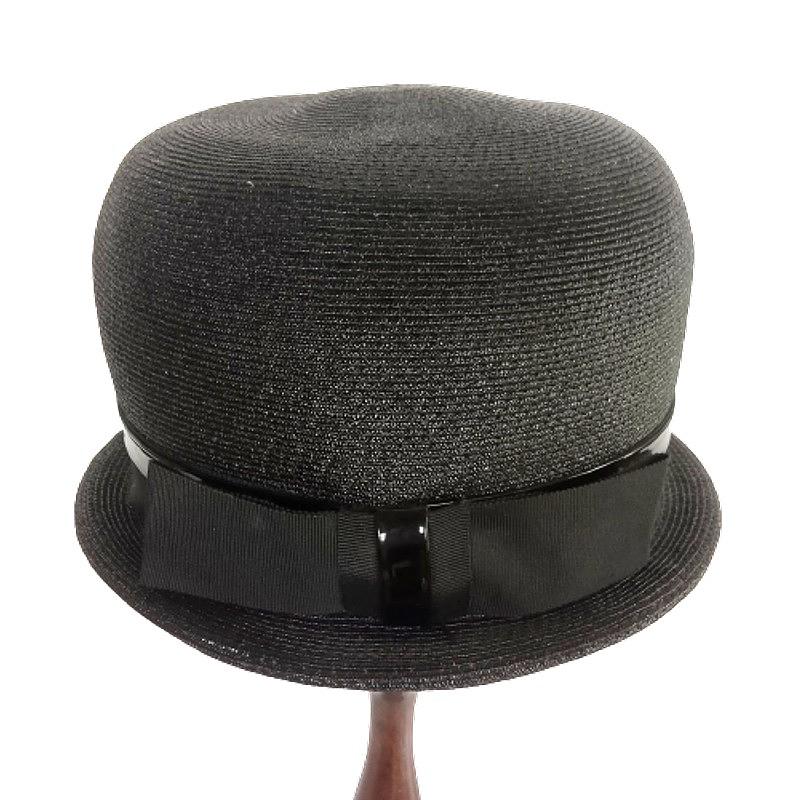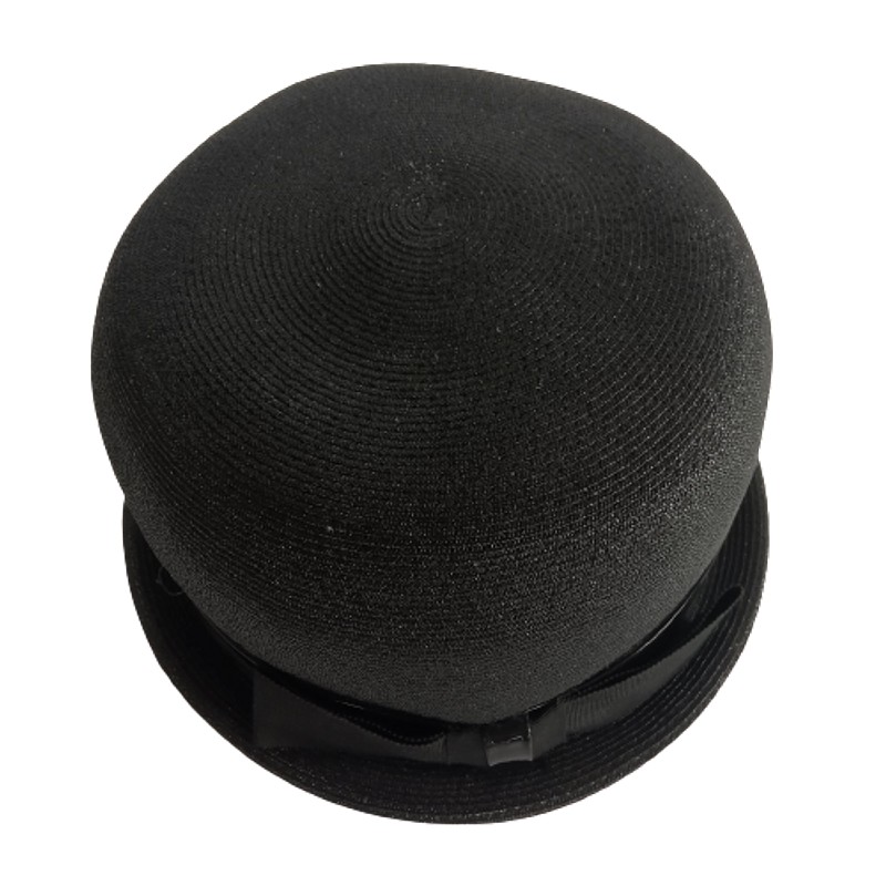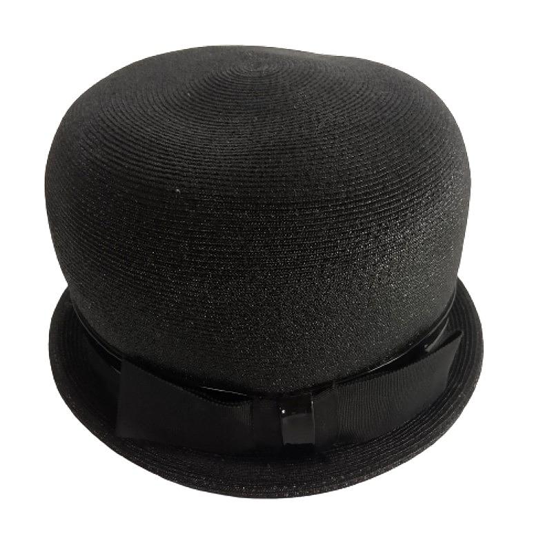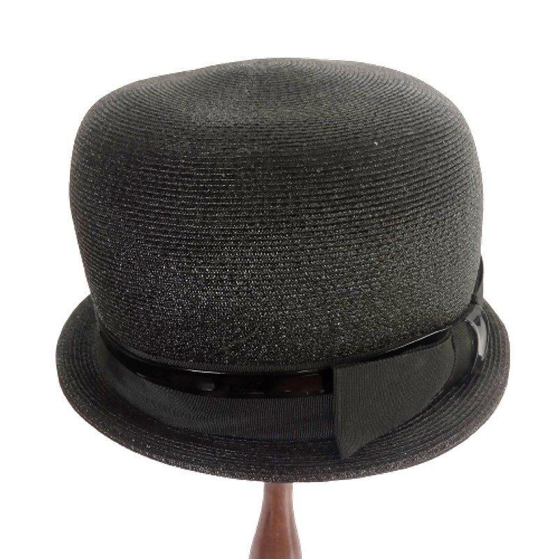 Sombrero de cubo alto tipo hongo con cinta grosgrain y ribete superpuesto de charol, producido por la firma Valerie modes a mediados del S XX. Se encuentra en buen estado.