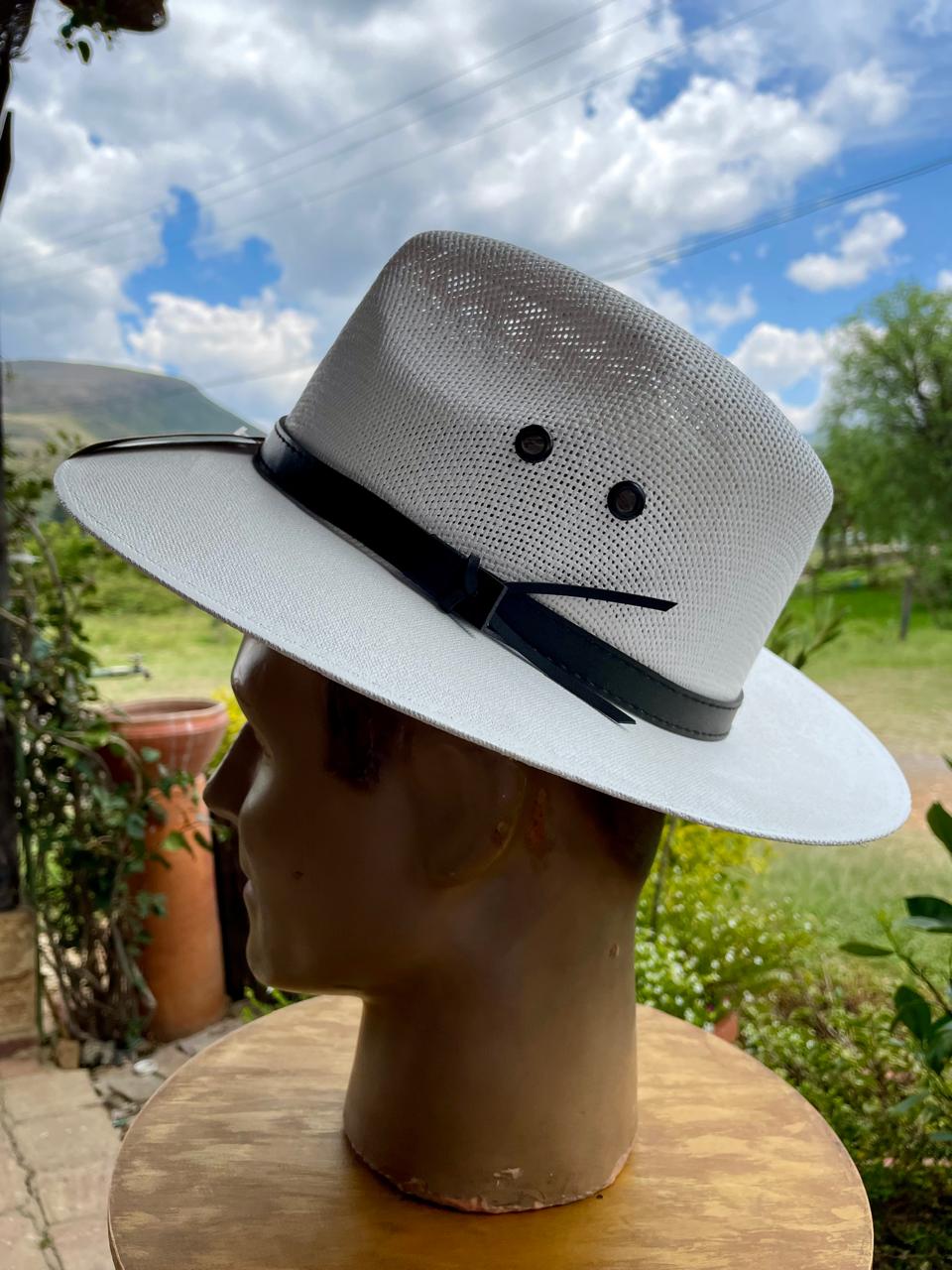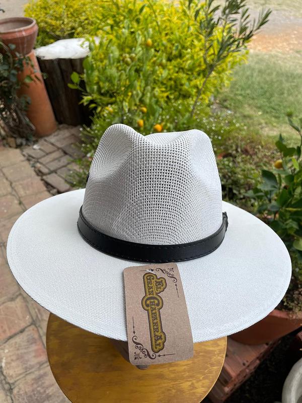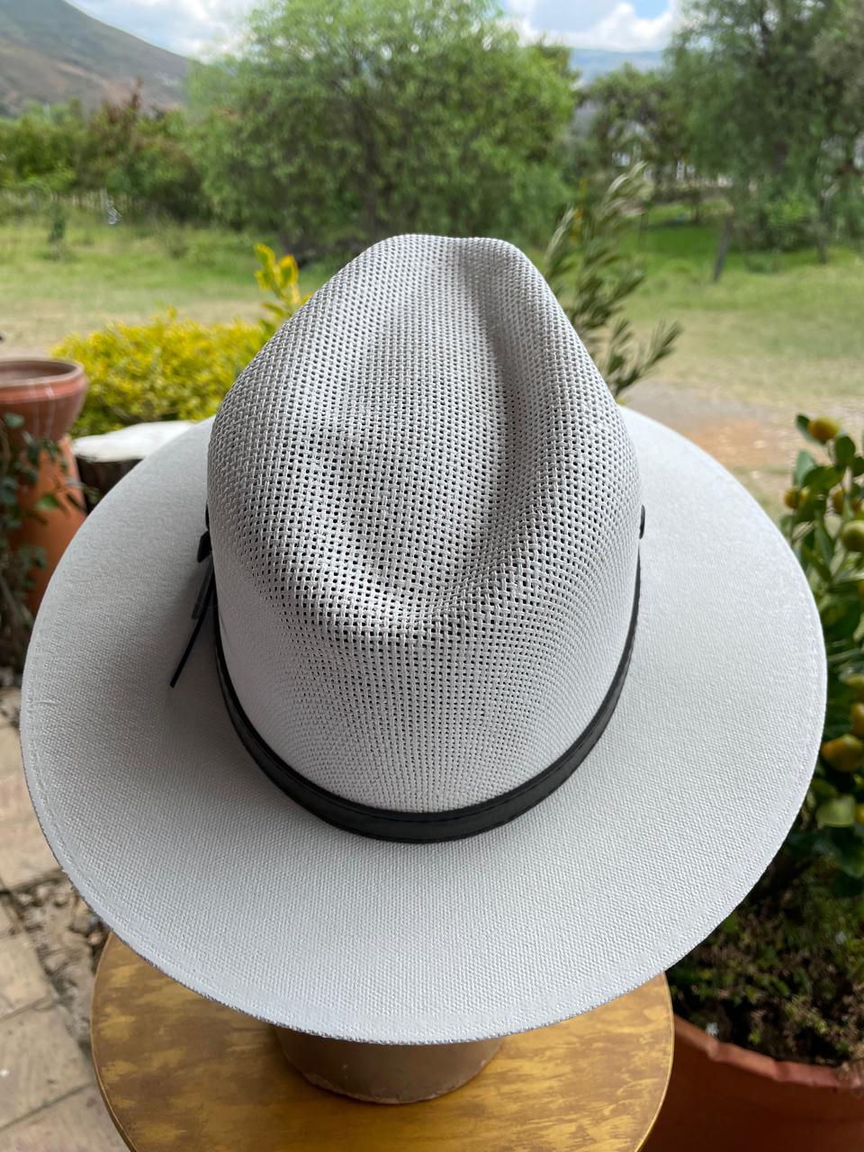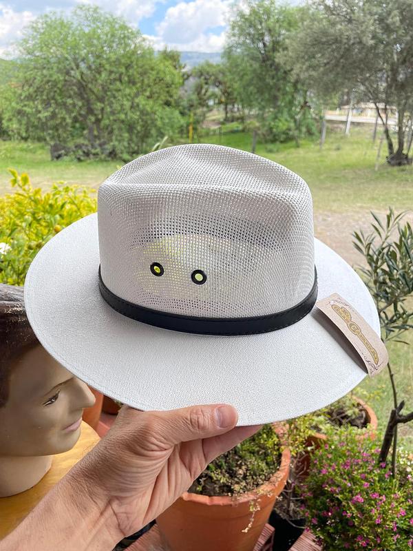Sombrero unisexo de paja natural recubierta con pintura sintética elaborado en México, el interior tiene una banda elástica ajustable, lo adorna una cinta de cuero negro. Producto nuevo.