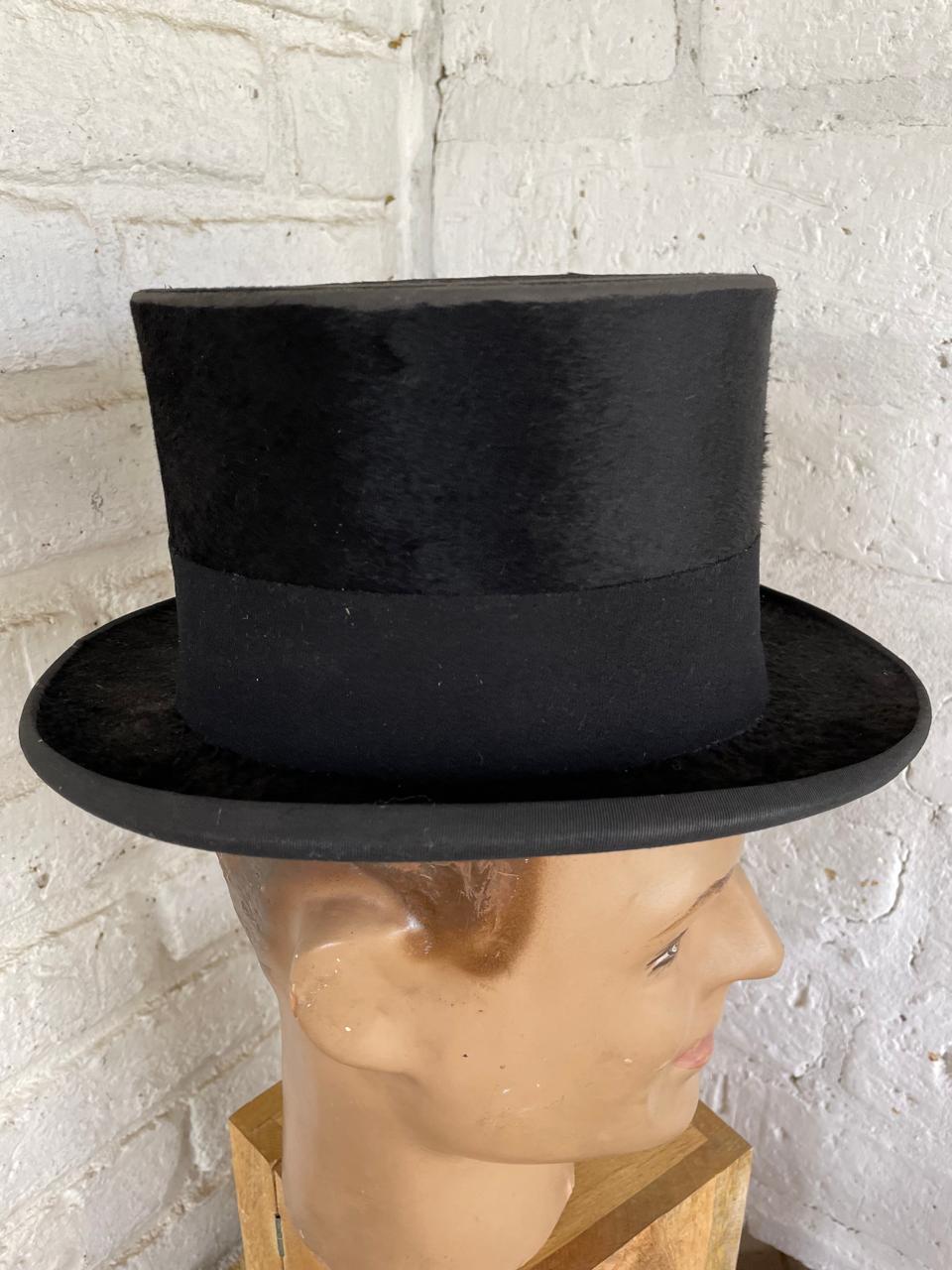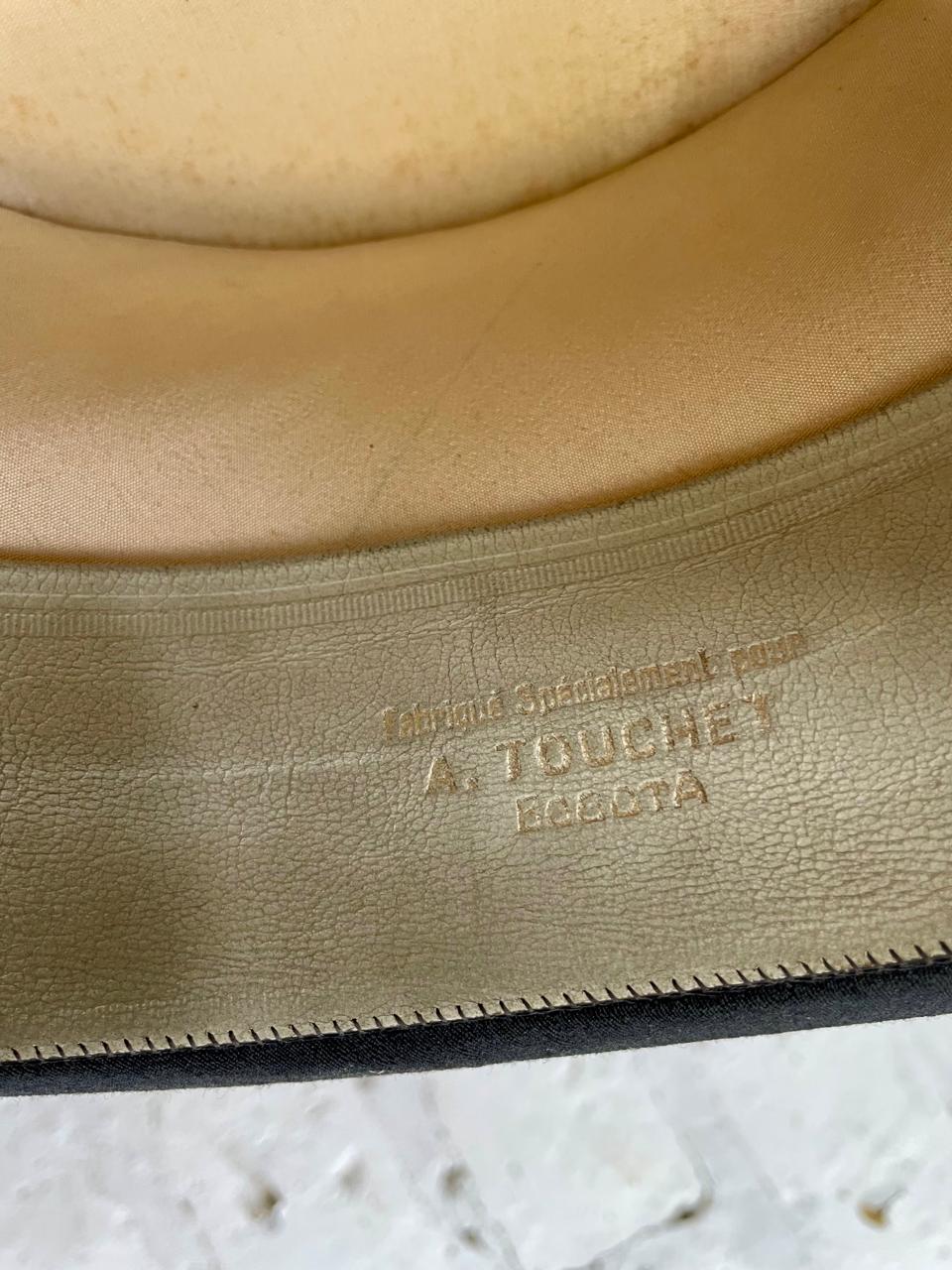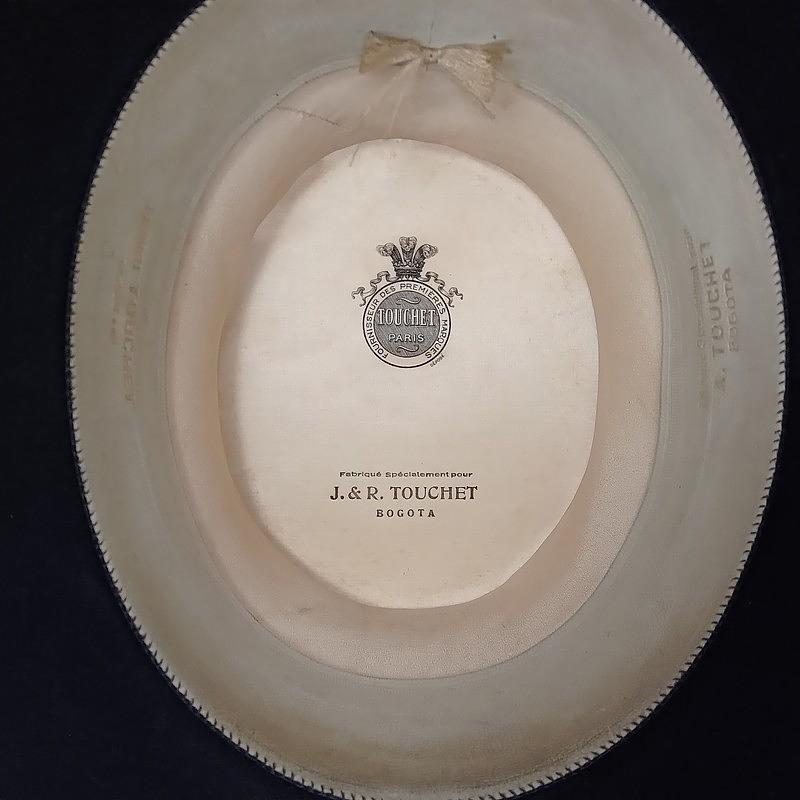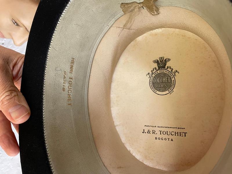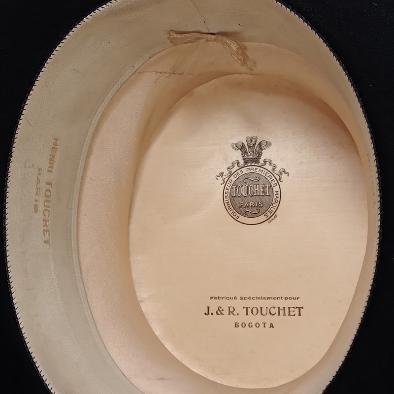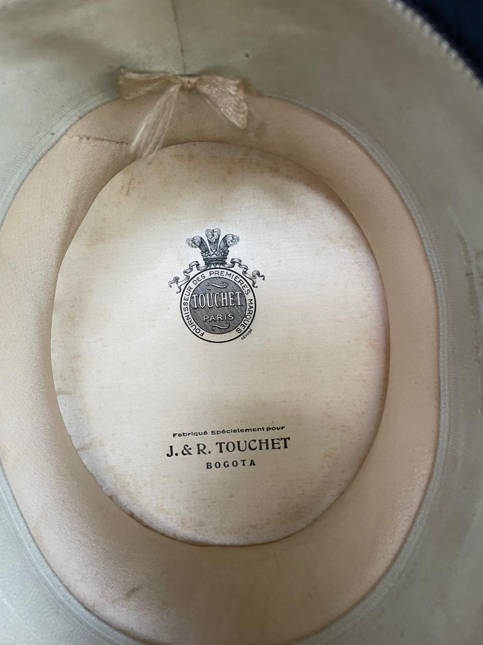 Sombrero de cubilete de los años cuarenta elaborado en Bogotá por J. & R. especialmente para la firma Parisina de sombreros Henry Touchet. Fabricado en fieltro de pelo fino y cinta de tela con borde en grosgrain, el interior forrado en seda tiene los sellos del fabricante. Se encuentra en buen estado con desgastes por el uso.