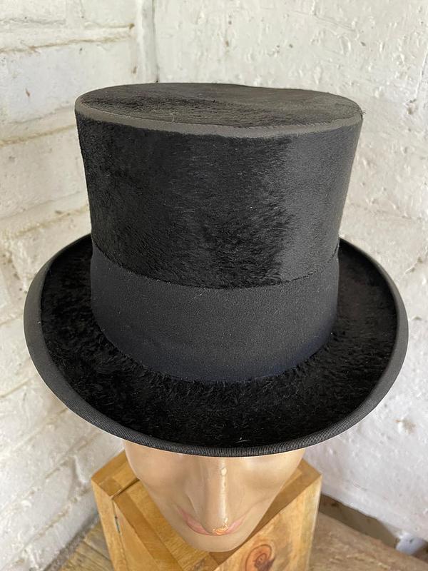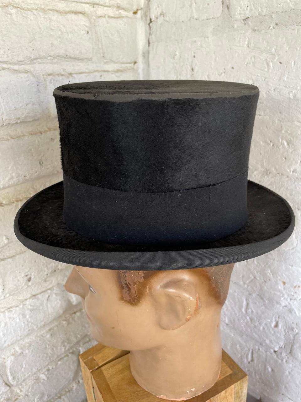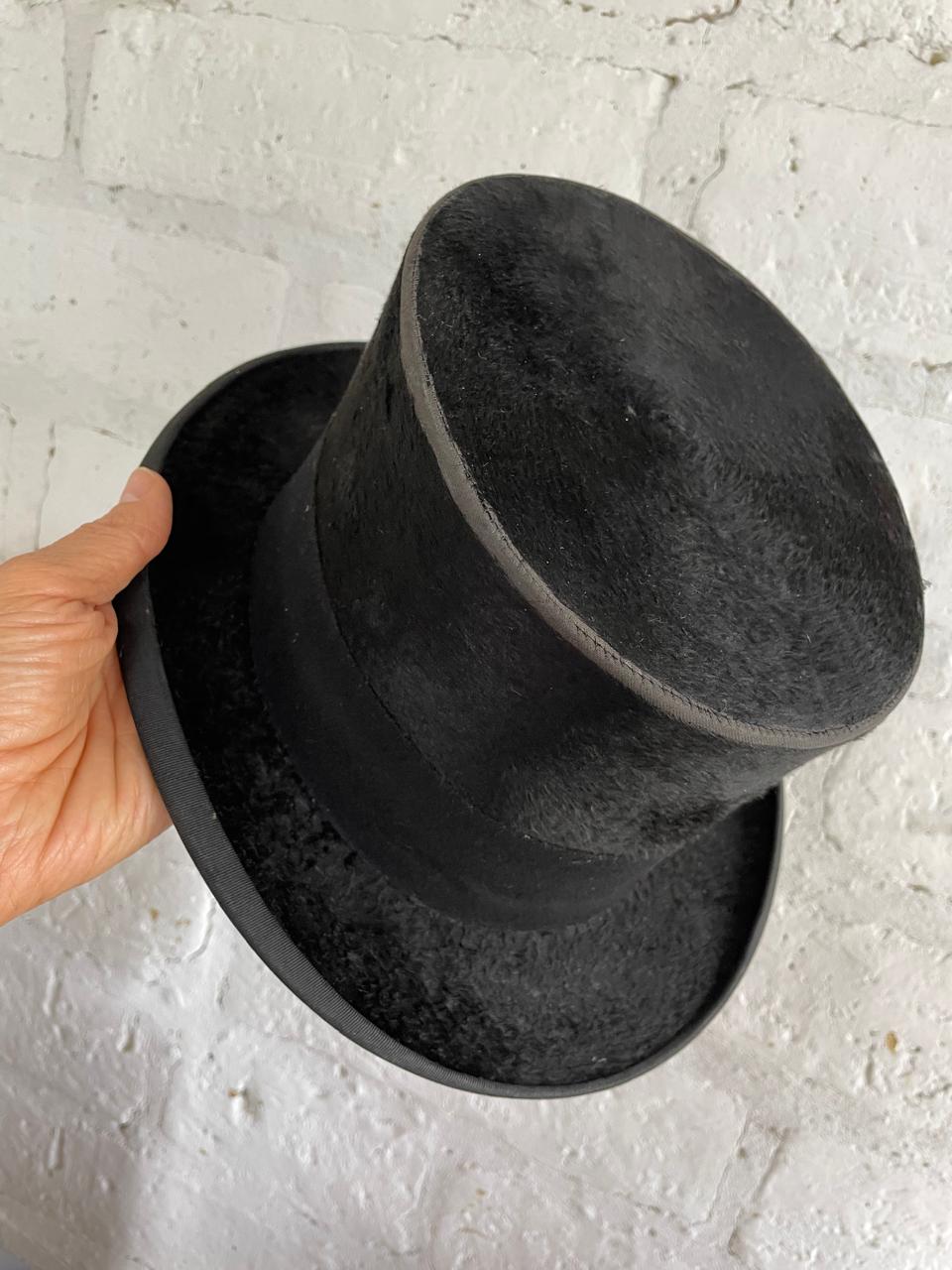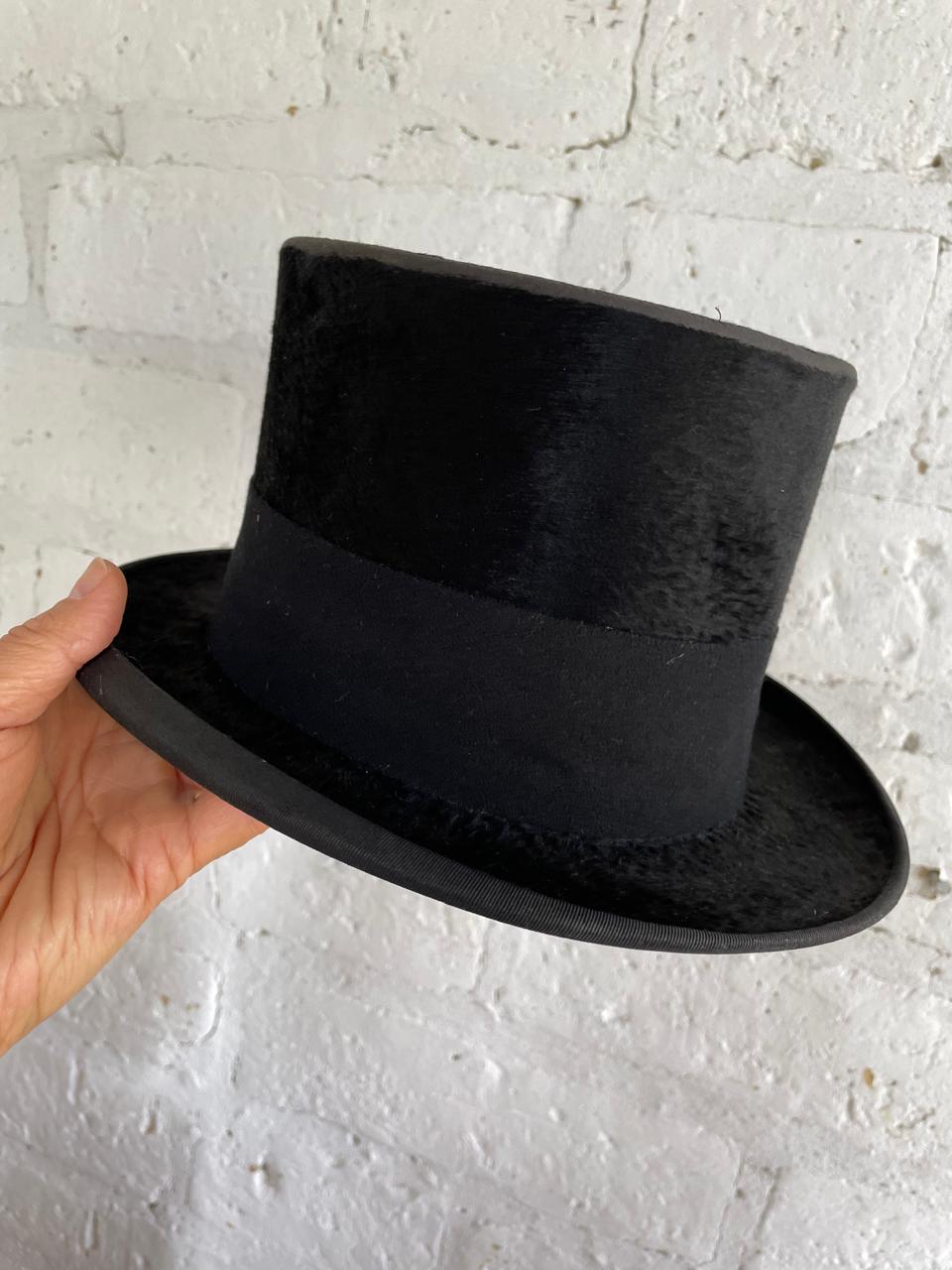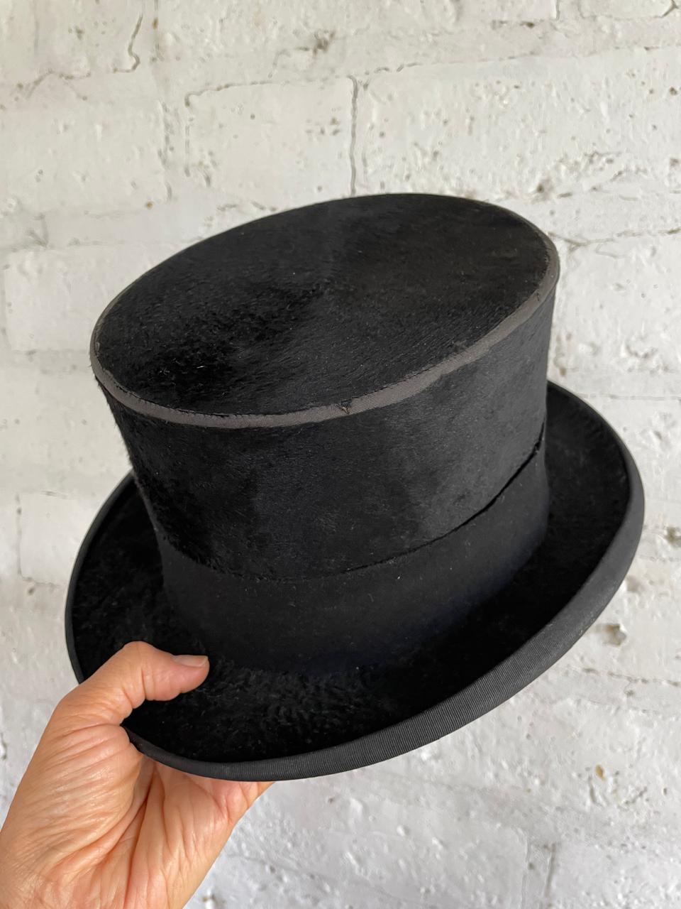 Sombrero de cubilete de los años cuarenta elaborado en Bogotá por J. & R. especialmente para la firma Parisina de sombreros Henry Touchet. Fabricado en fieltro de pelo fino y cinta de tela con borde en grosgrain, el interior forrado en seda tiene los sellos del fabricante. Se encuentra en buen estado con desgastes por el uso.