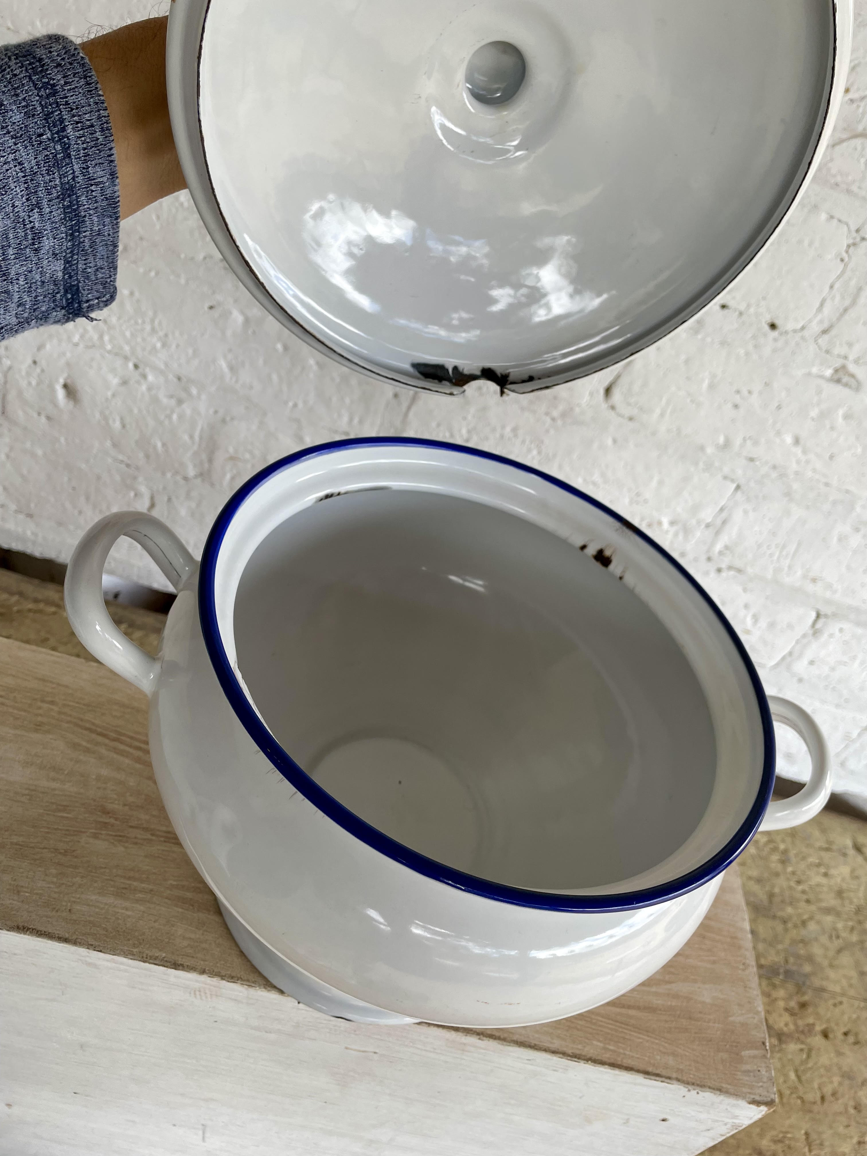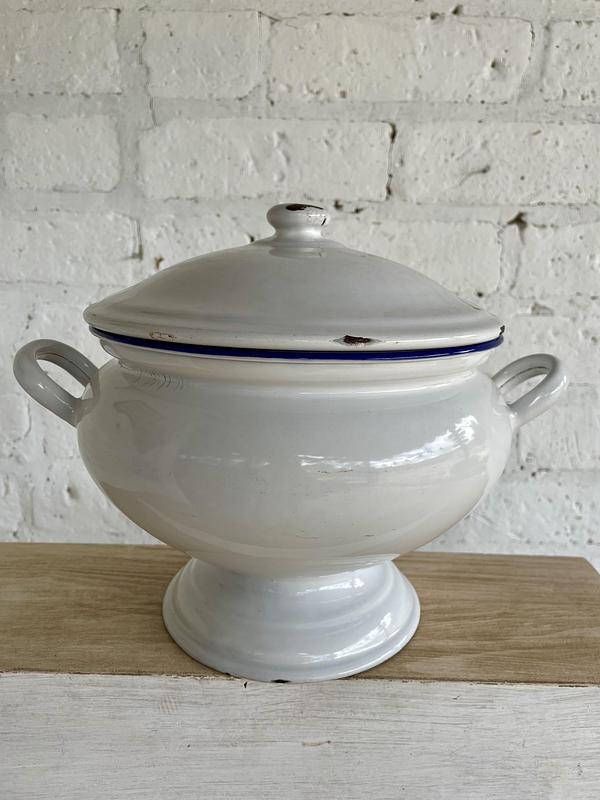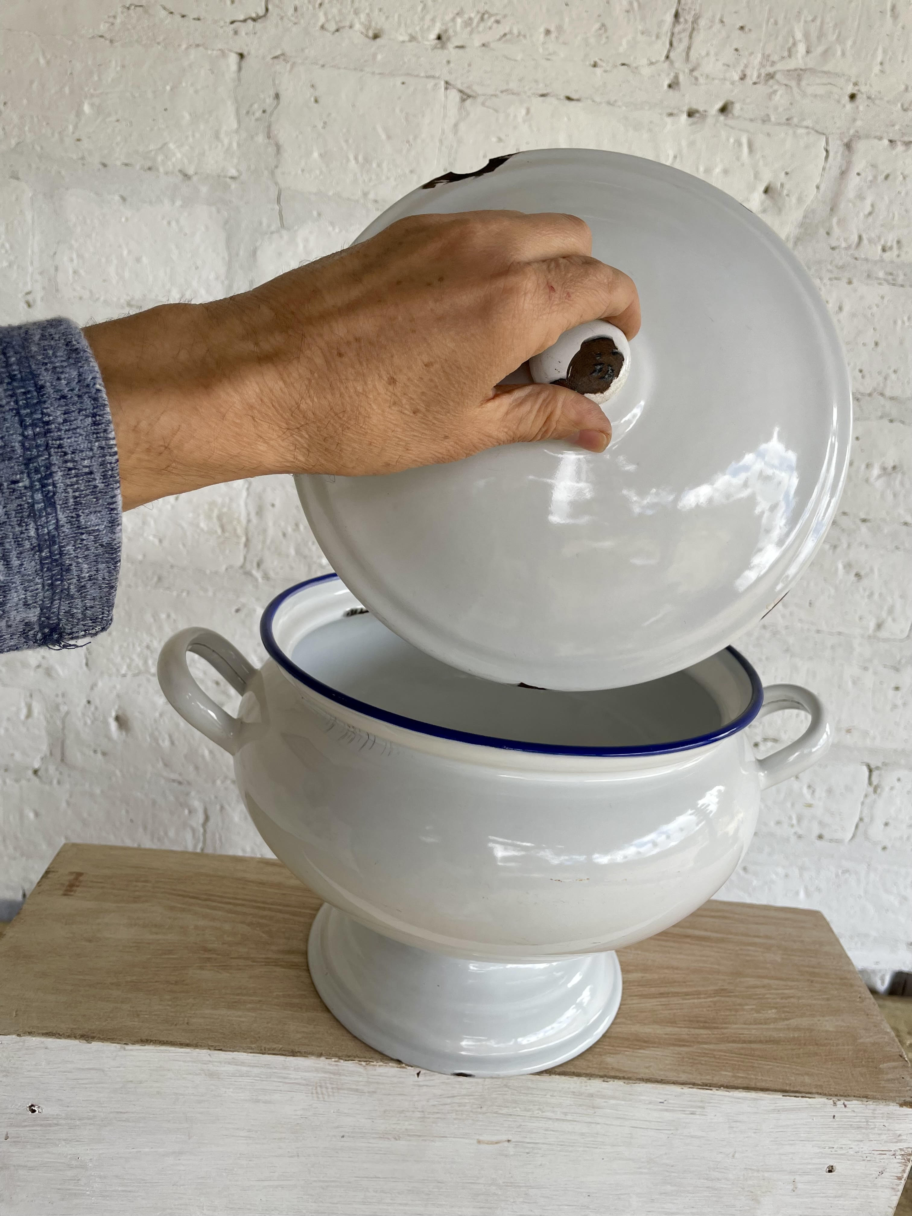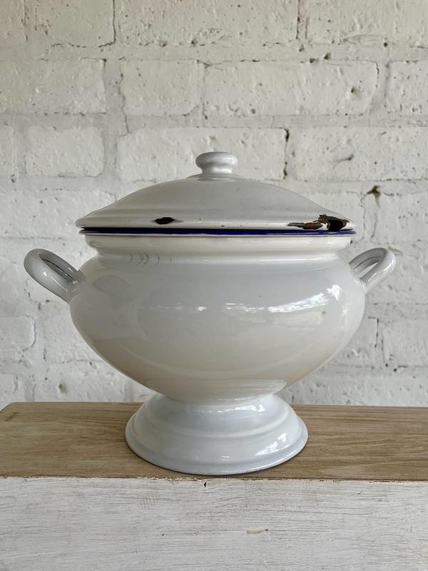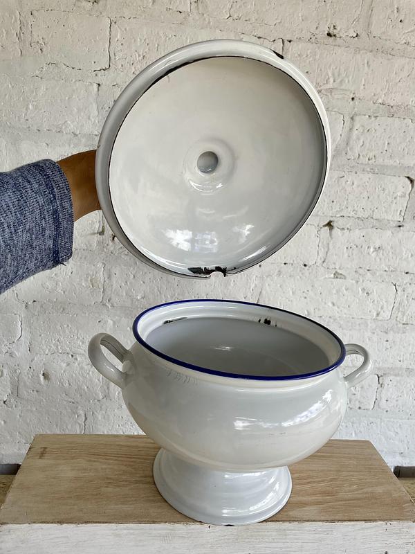 Sopera esmaltada de los años cuarenta, la base está marcada Kockums Ker Sweden 24 cm. Presenta esmaltaduras.