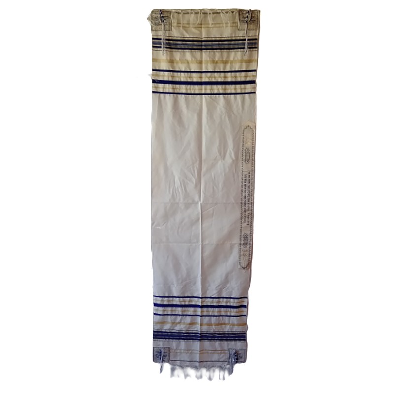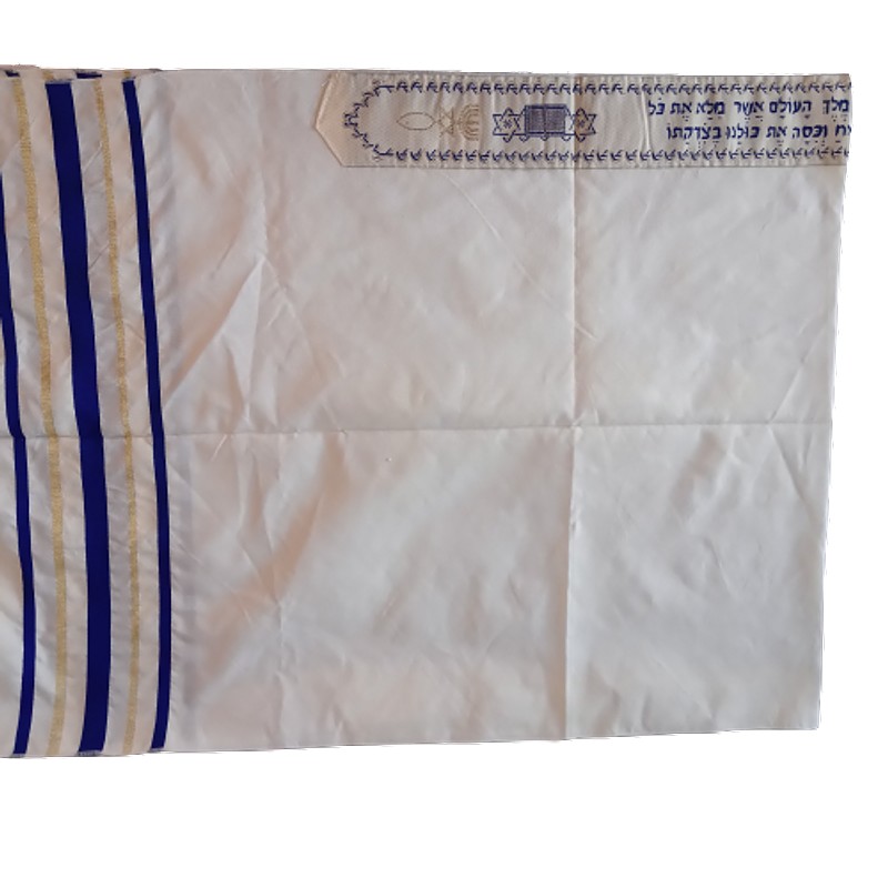 El talit es un accesorio religioso en forma de chal utilizado en los servicios religiosos del judaísmo. Elaborado en poliéster bordado en tonos azules e hilos dorados. Hecho en Jerusalén.