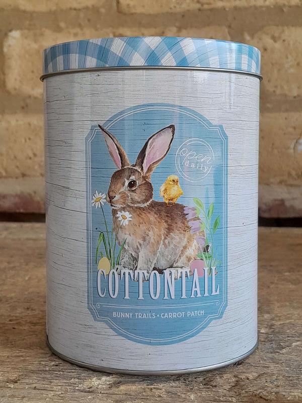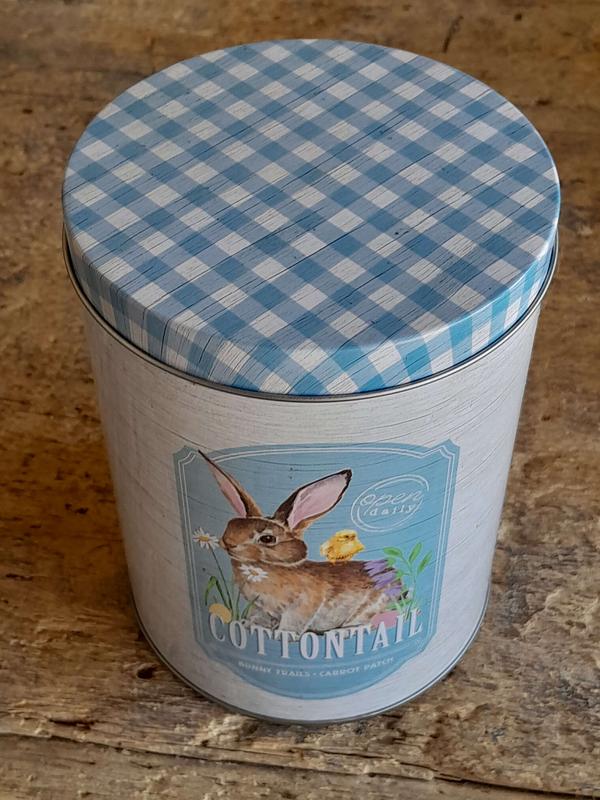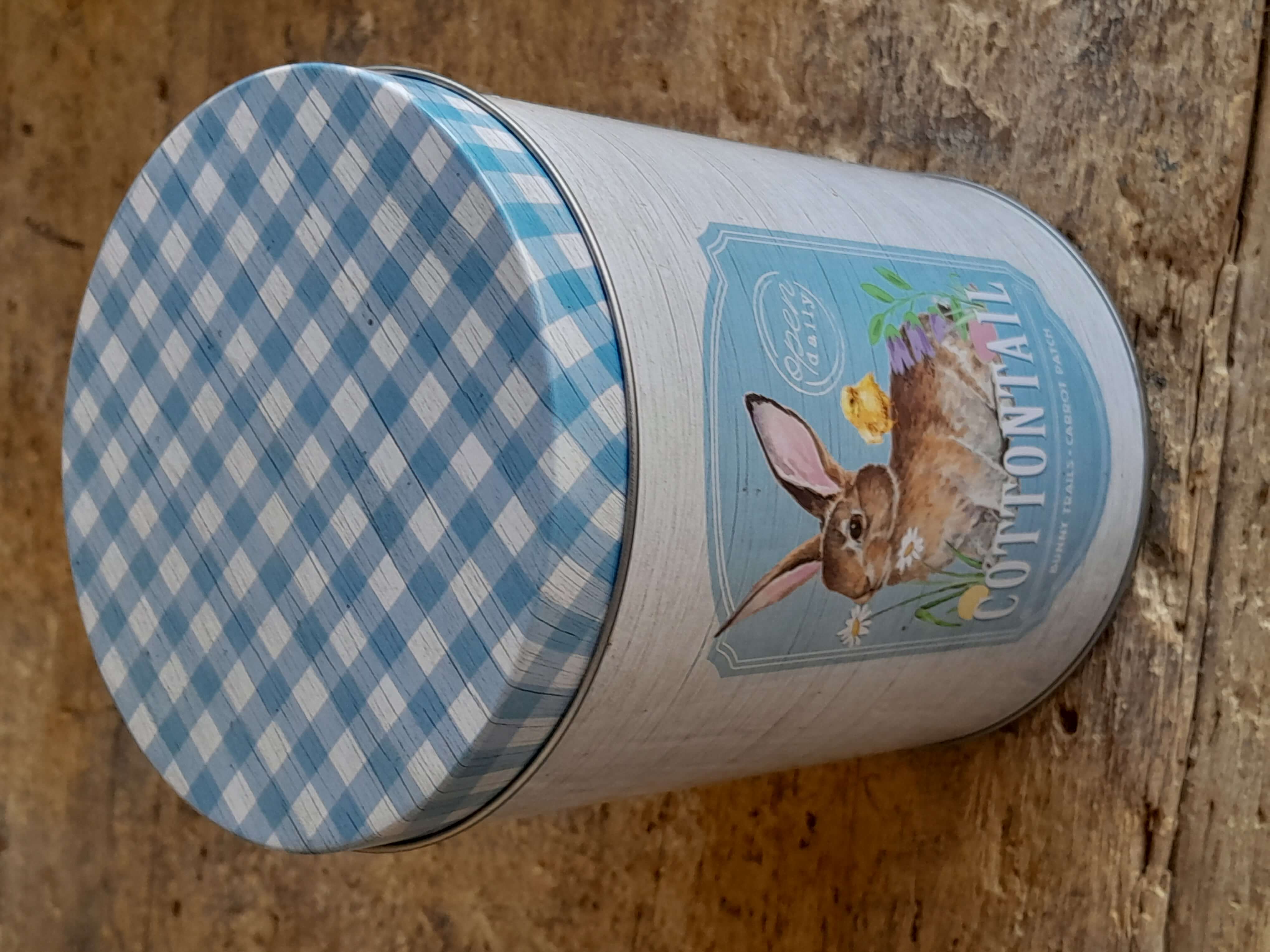 Tarro metálico retro decorado con motivos antiguos de un conejo de pascua.