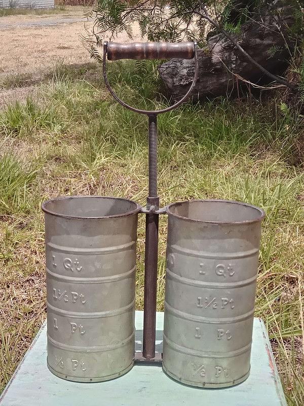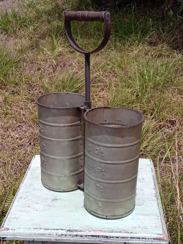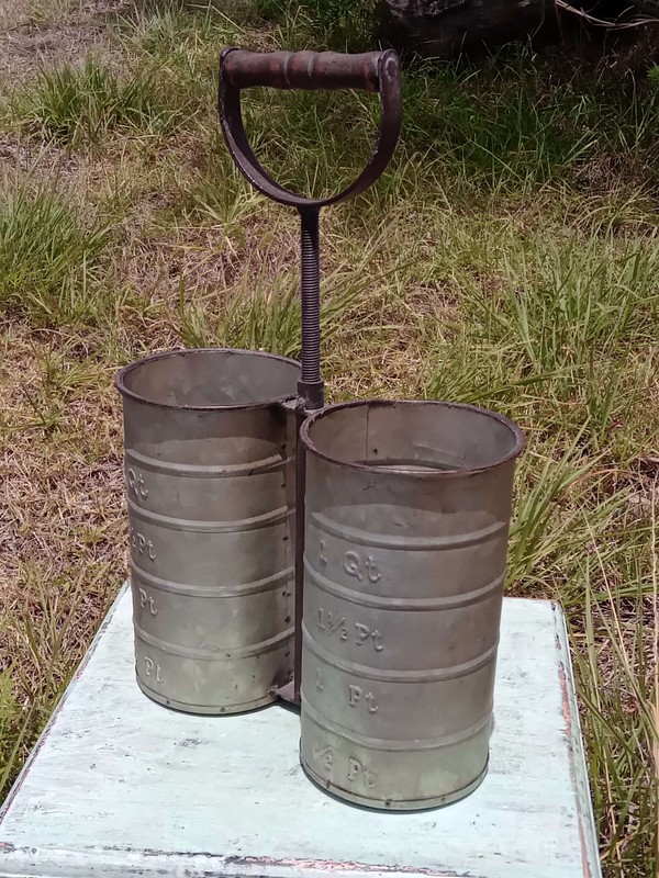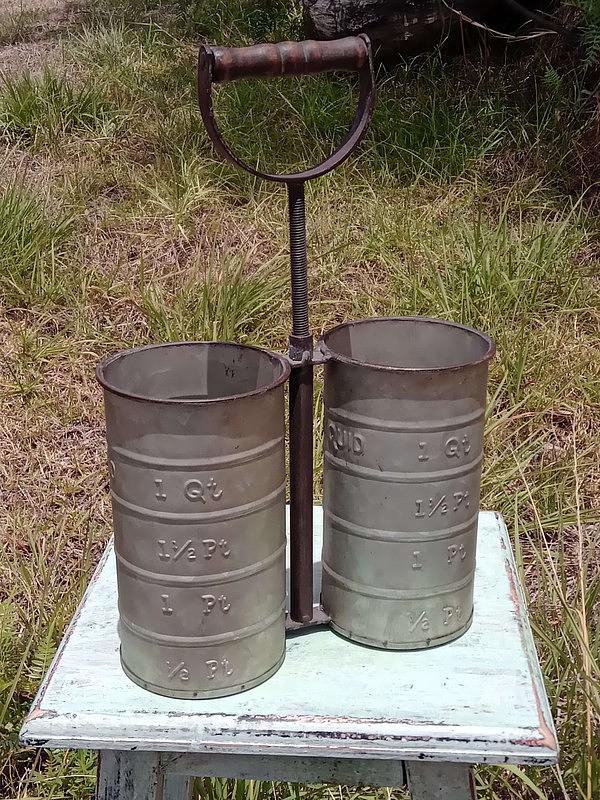 A dos tarros vintaje medidores de aceite de cuarto de galos de los años ochenta se le adiciono un tornillo y una manija de madera recuperada formando creativamente un recipiente que se puede utilizar como florero,organizador de pinceles o herramientas etc.