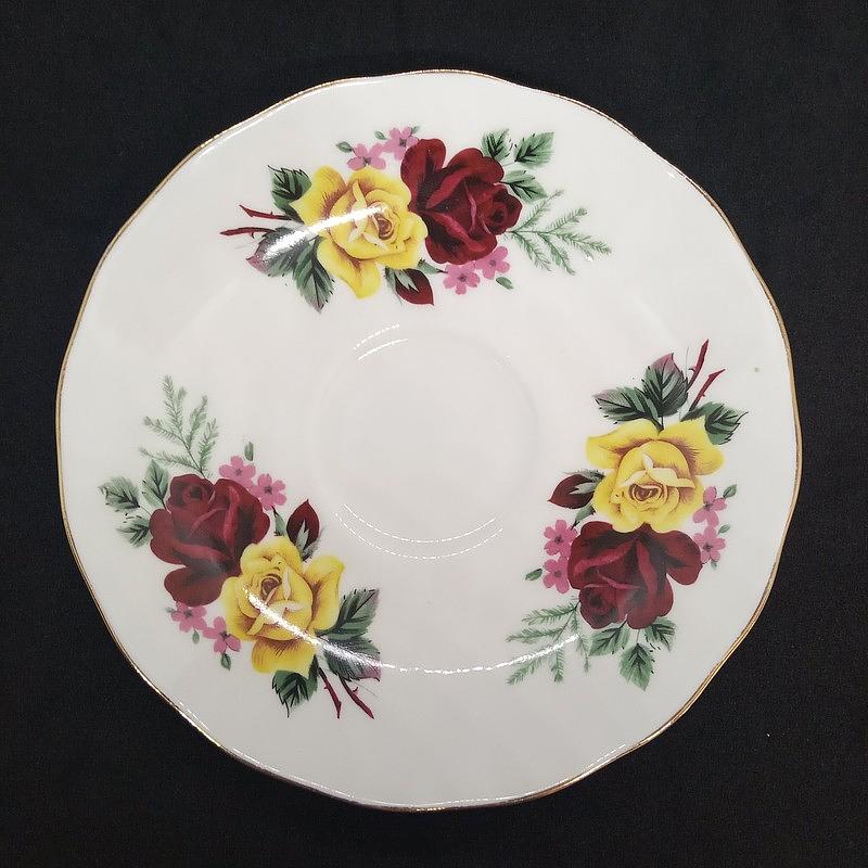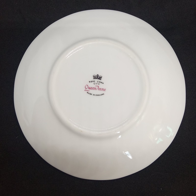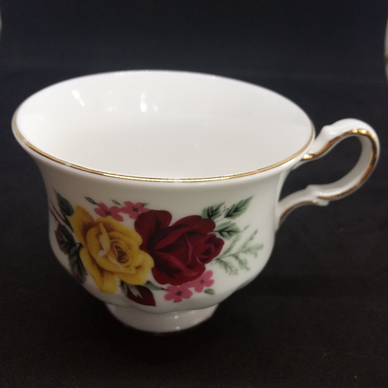 Taza con plato ingleses, "bone china", producidos por Queen Anne Pat No 8630 en la década de los 60, decorados con rosas, flores y bordes oro.