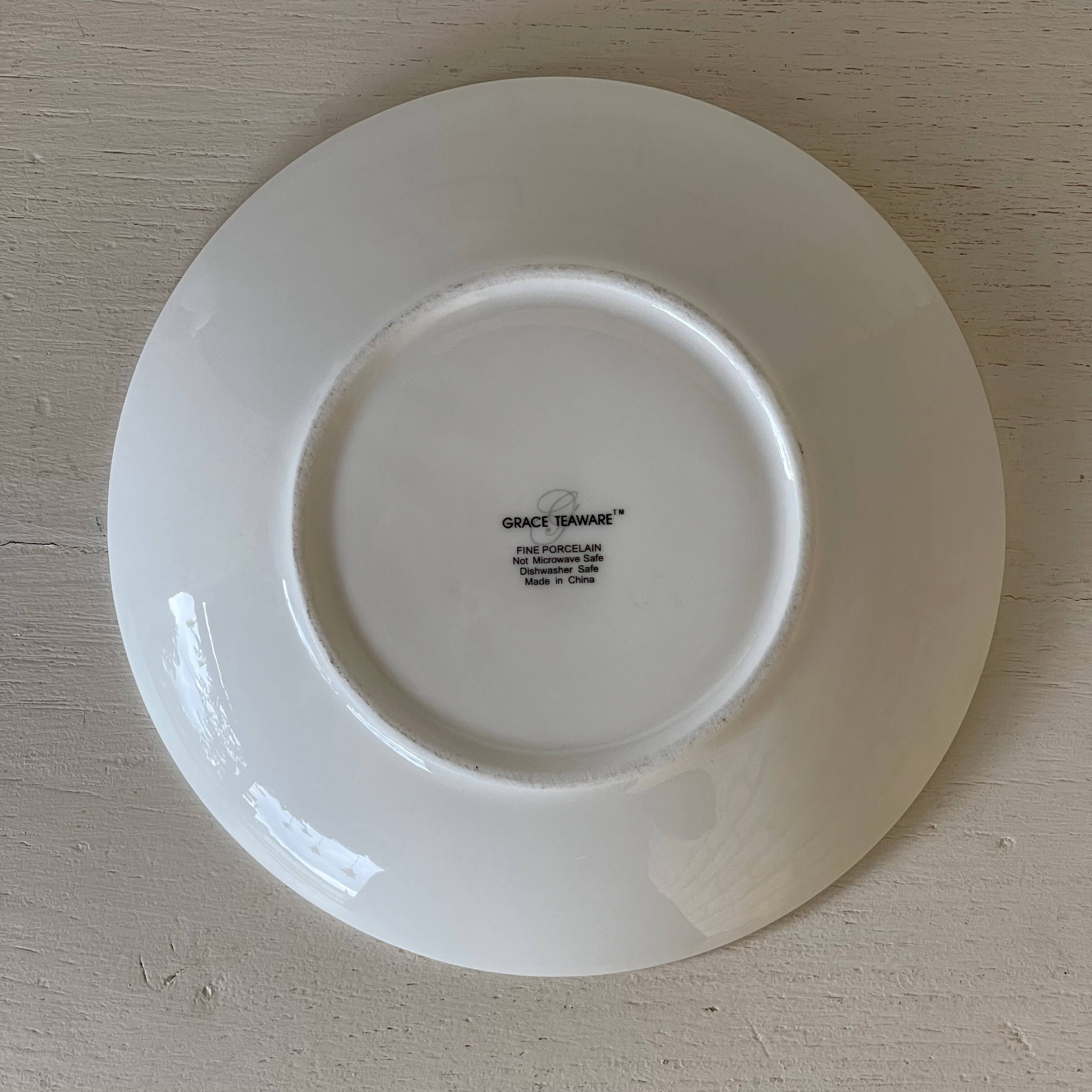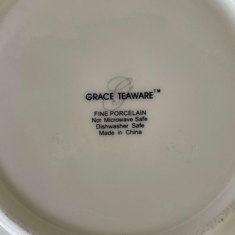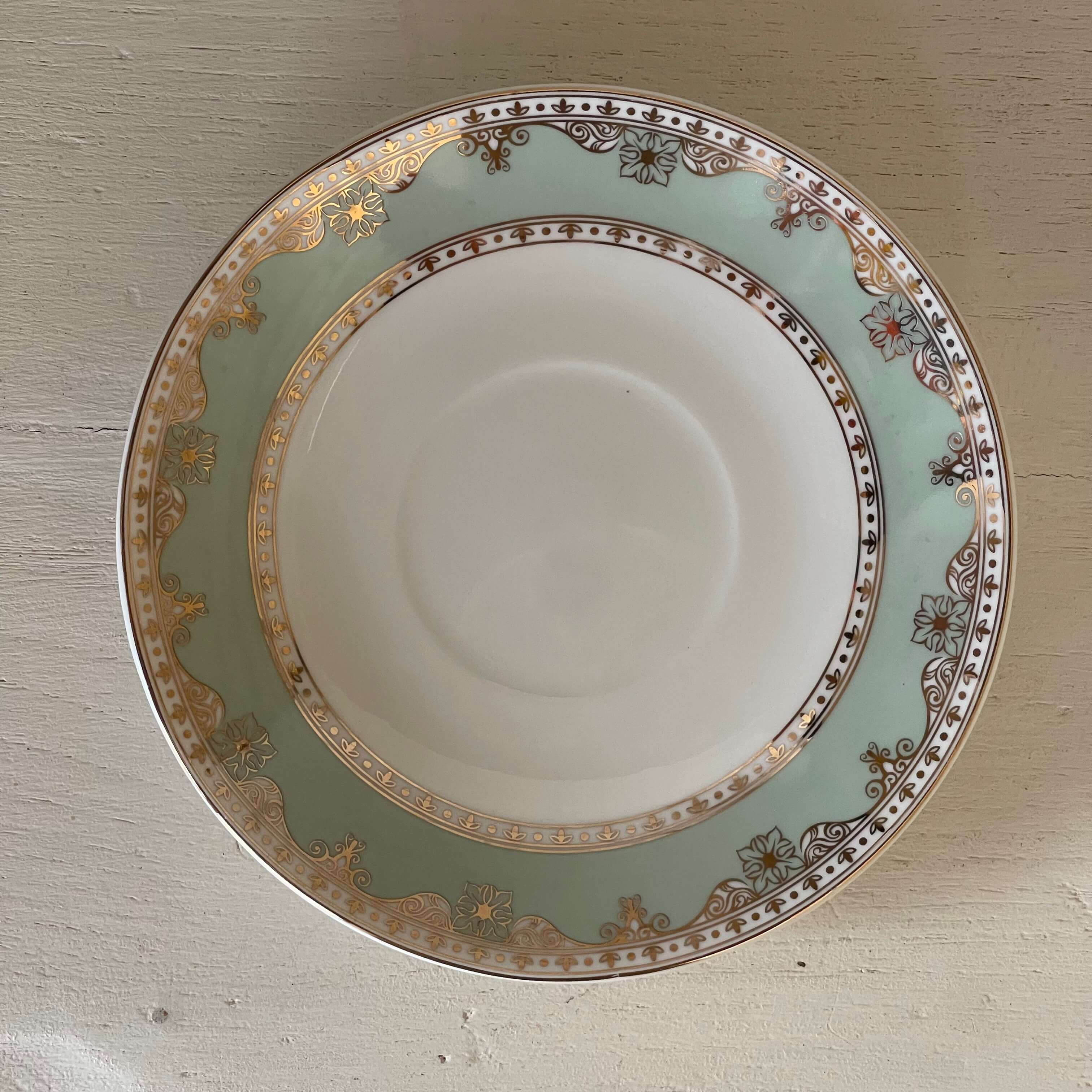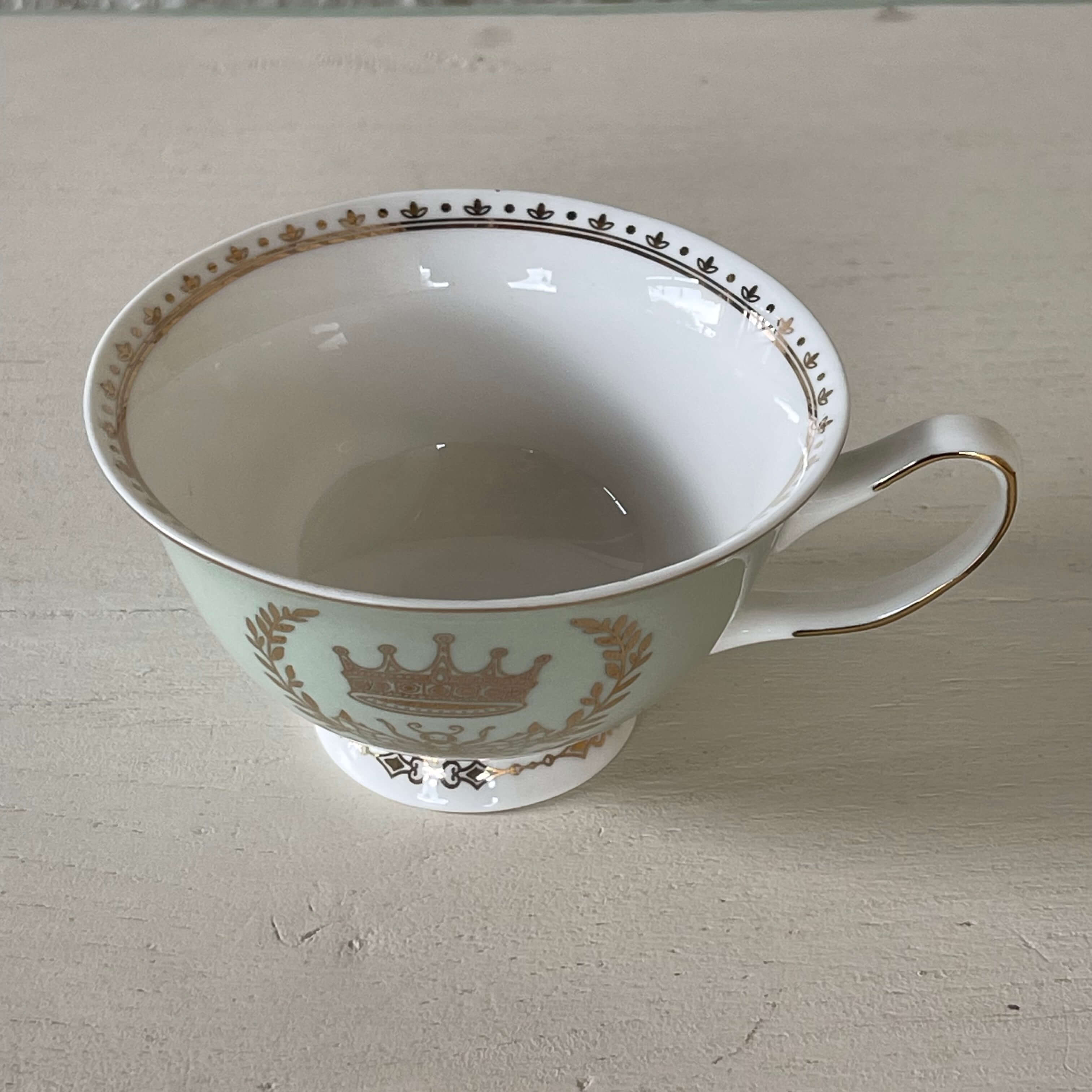 Taza y plato de porcelana fina fabricado en china para la marca Grace Teaware con apariencia de antiguos en color verde menta y decorados en oro.
