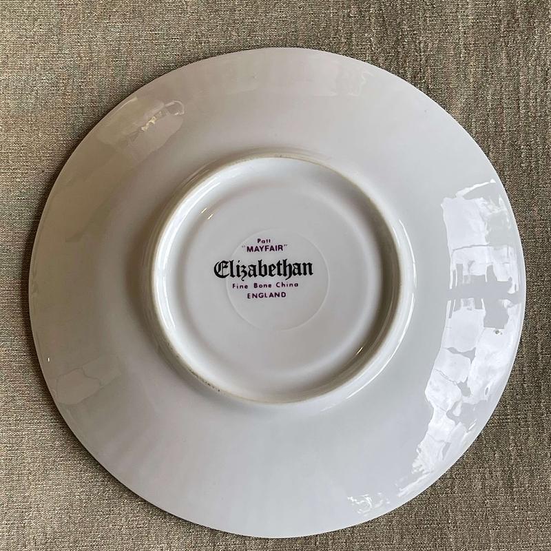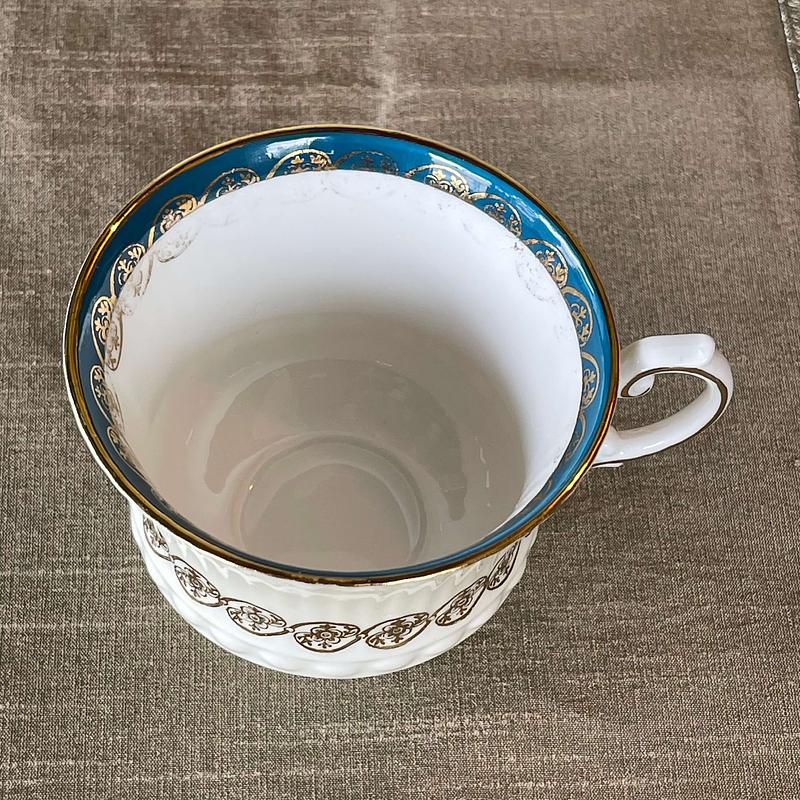 Taza para te vintage de porcelana con plato producida en Inglaterra en la década de los setenta decorada en tonos azules y dorados, se encuentra en buen estado de conservación, la base está marcada con el sello del fabricante Elizabethan.