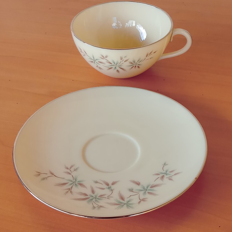 Taza de te con plato en porcelana fabricados en USA por Wyndcrest para Lenox, pertenecía a una vajilla de los años cincuenta.