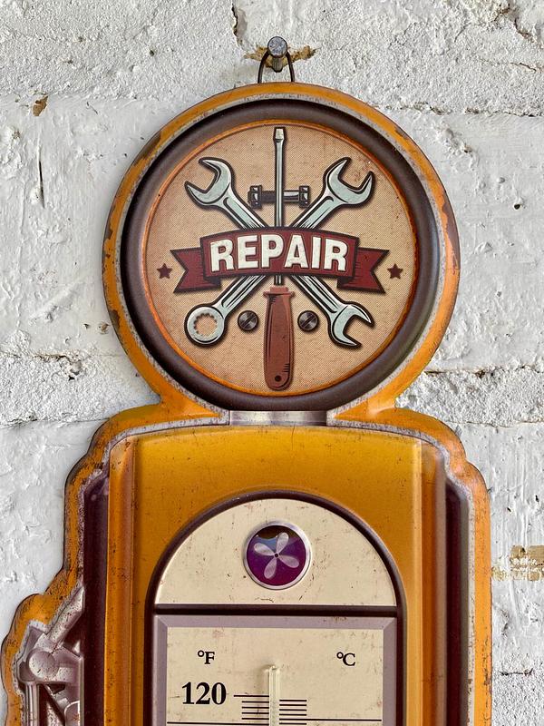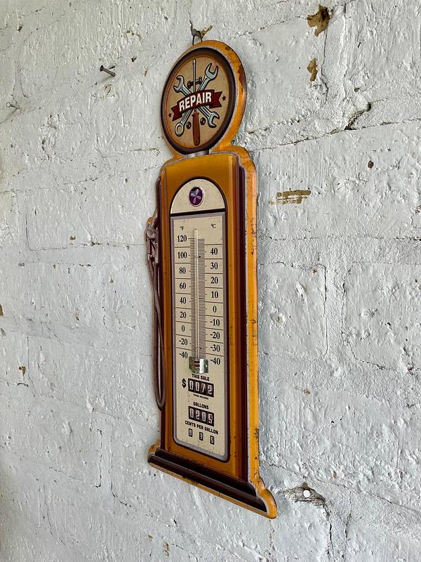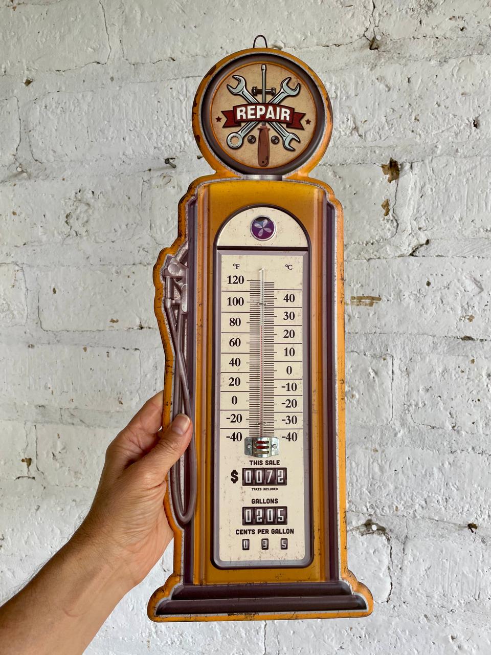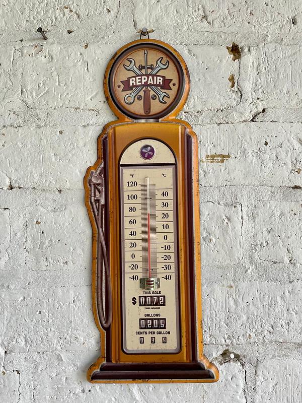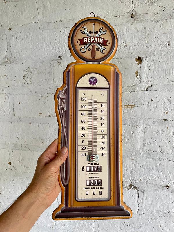 Termómetro de pared con base metálica decorado con pintura dando la apariencia de una antiguo surtidor de gasolina.