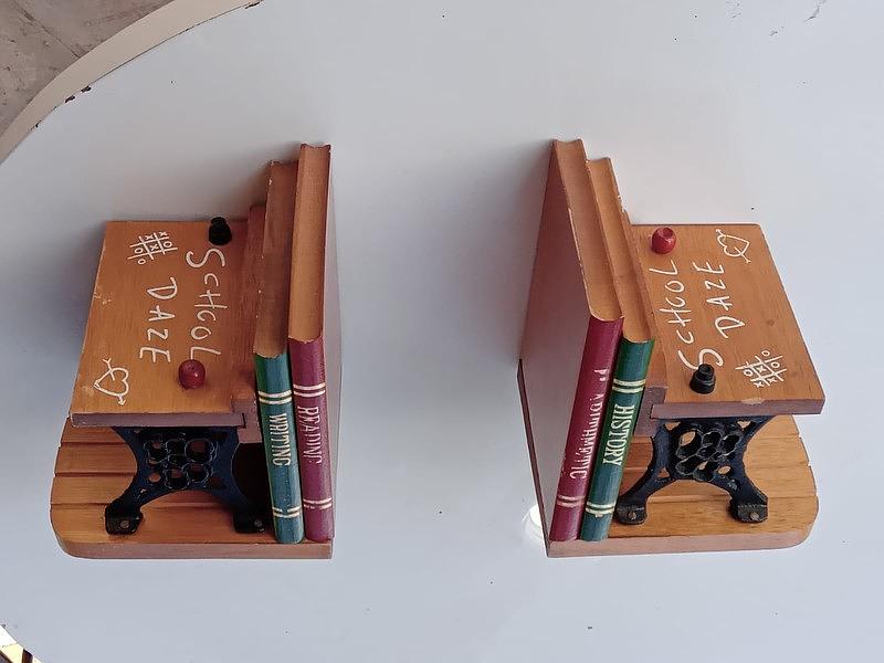 Pareja de tranca libros vintage elaborados en Taiwan en la decada de los ochenta, réplica de dos pupitres antiguos de escuela trancados contra dos libros. Elaborados en madera y las patas de los pupitres son en hierro.