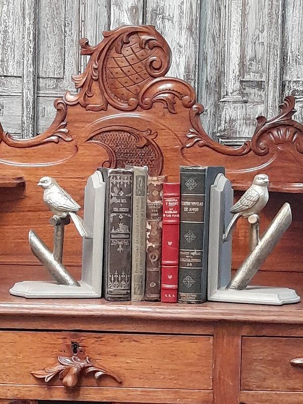 Pareja de trancalibros en resina decorados con pájaros.