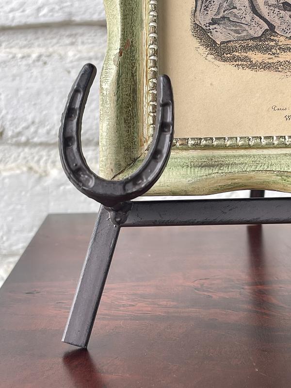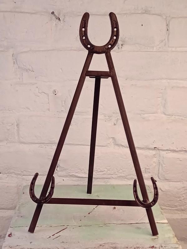 Atril, caballete o trípode metálico la base decorado con tres herraduras. Se puede utilizar como soporte para cuadros o platos con diámetro de 25 cm. a 40 cm.