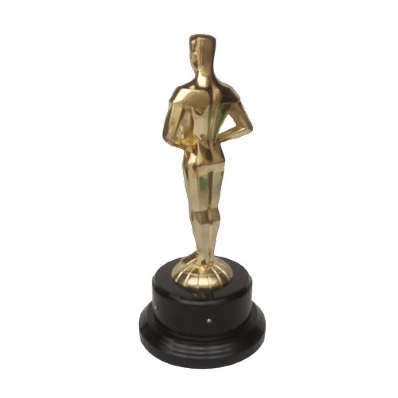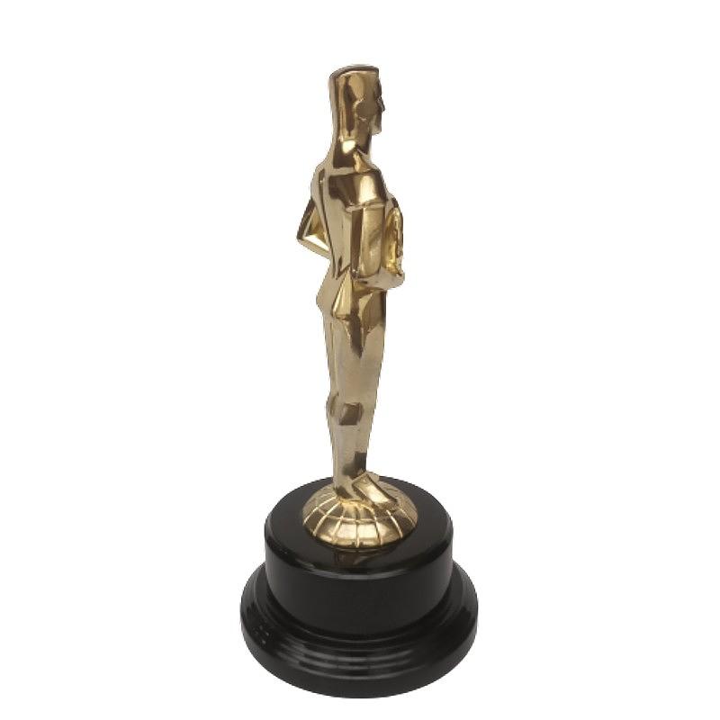 Elaborada en metal dorado, la base es de madera lacada con características similares al famoso premio.