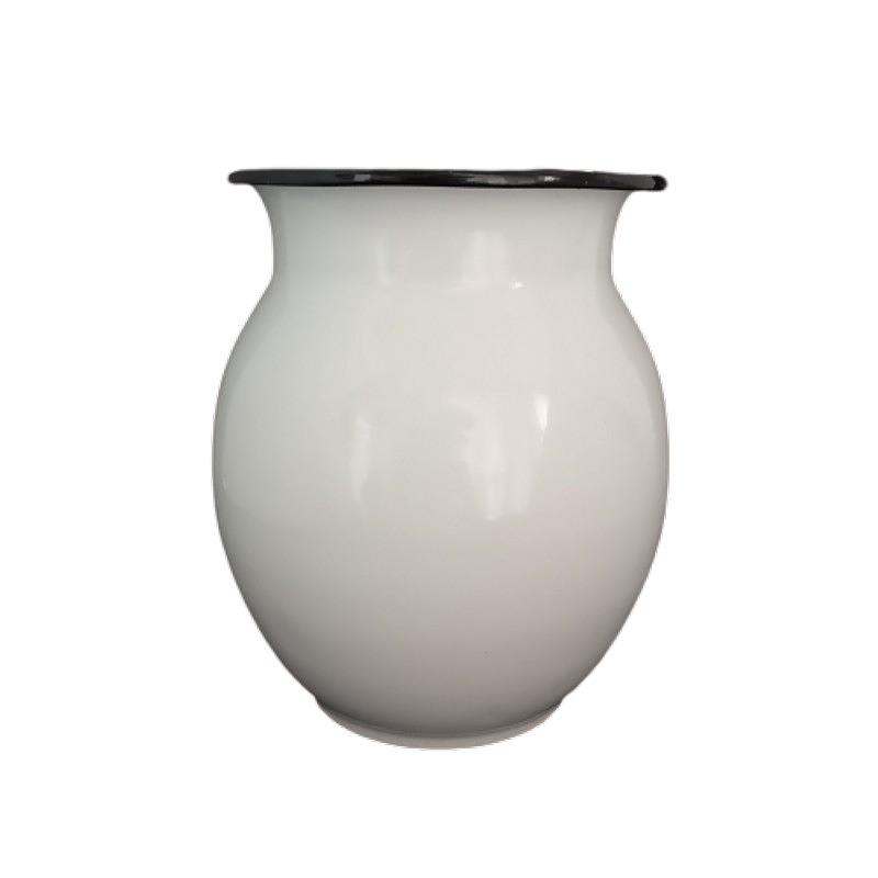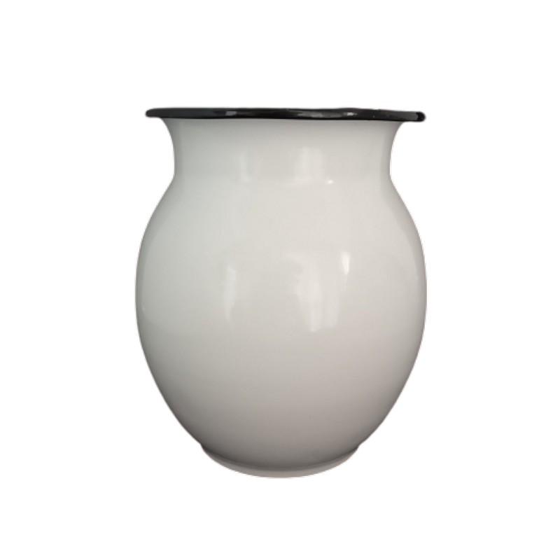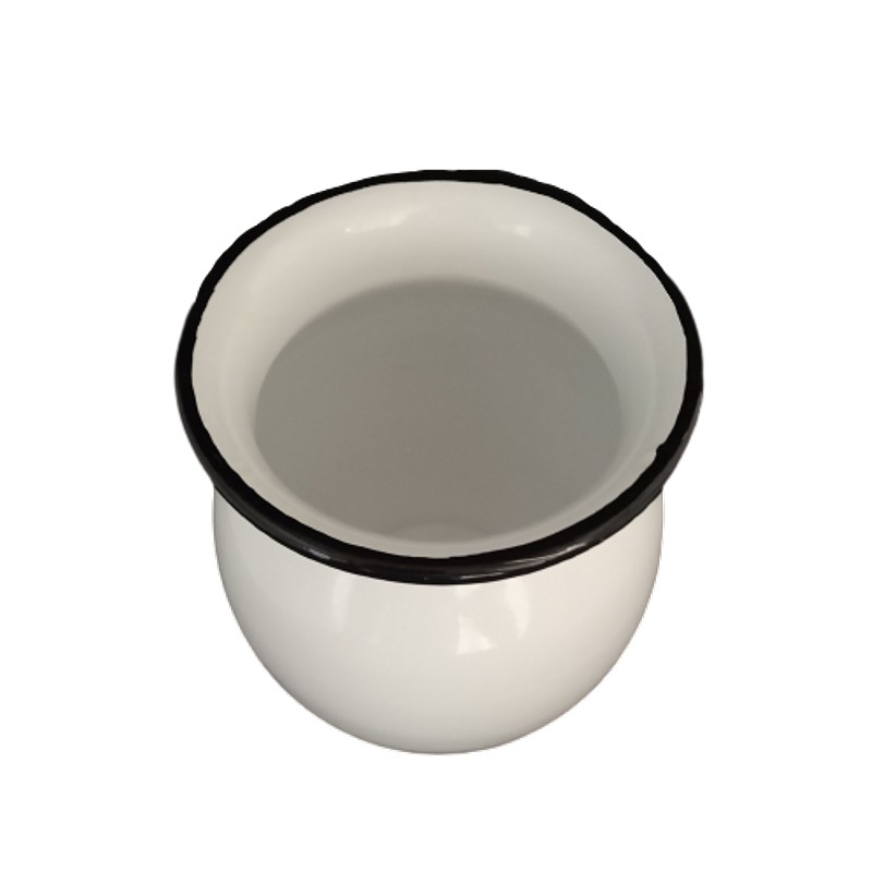 Recipiente metálico esmaltado en color blanco y borde negro.