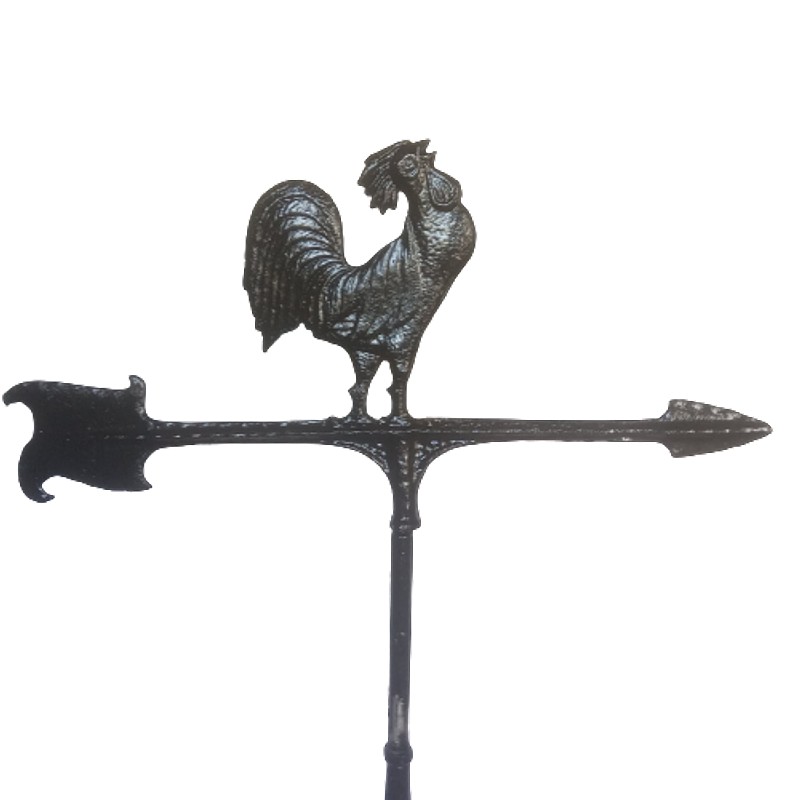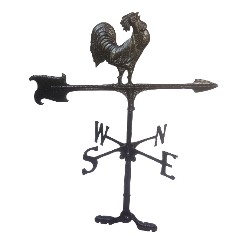 Veleta y rosa de los vientos para tejados y jardines. Elaborada en fundición de aluminio. Compuesta por una base, una flecha giratoria que indica la dirección del viento, una cruz horizontal que marca los puntos cardinales o rosa de los vientos y la silueta ornamentada de un gallo.