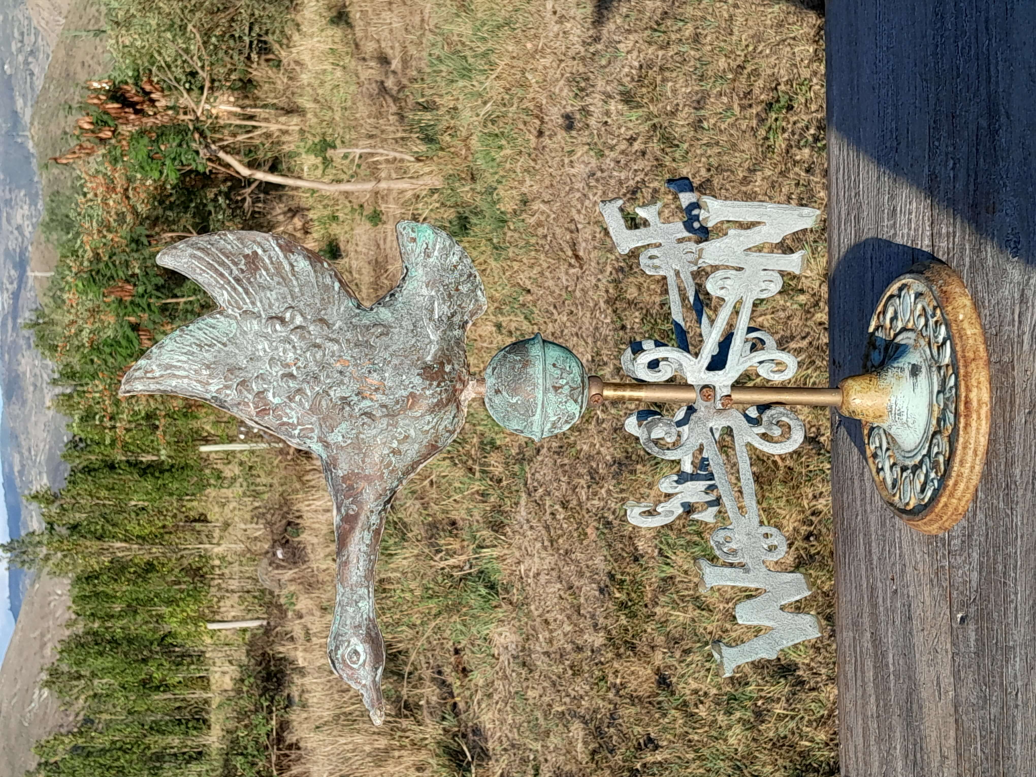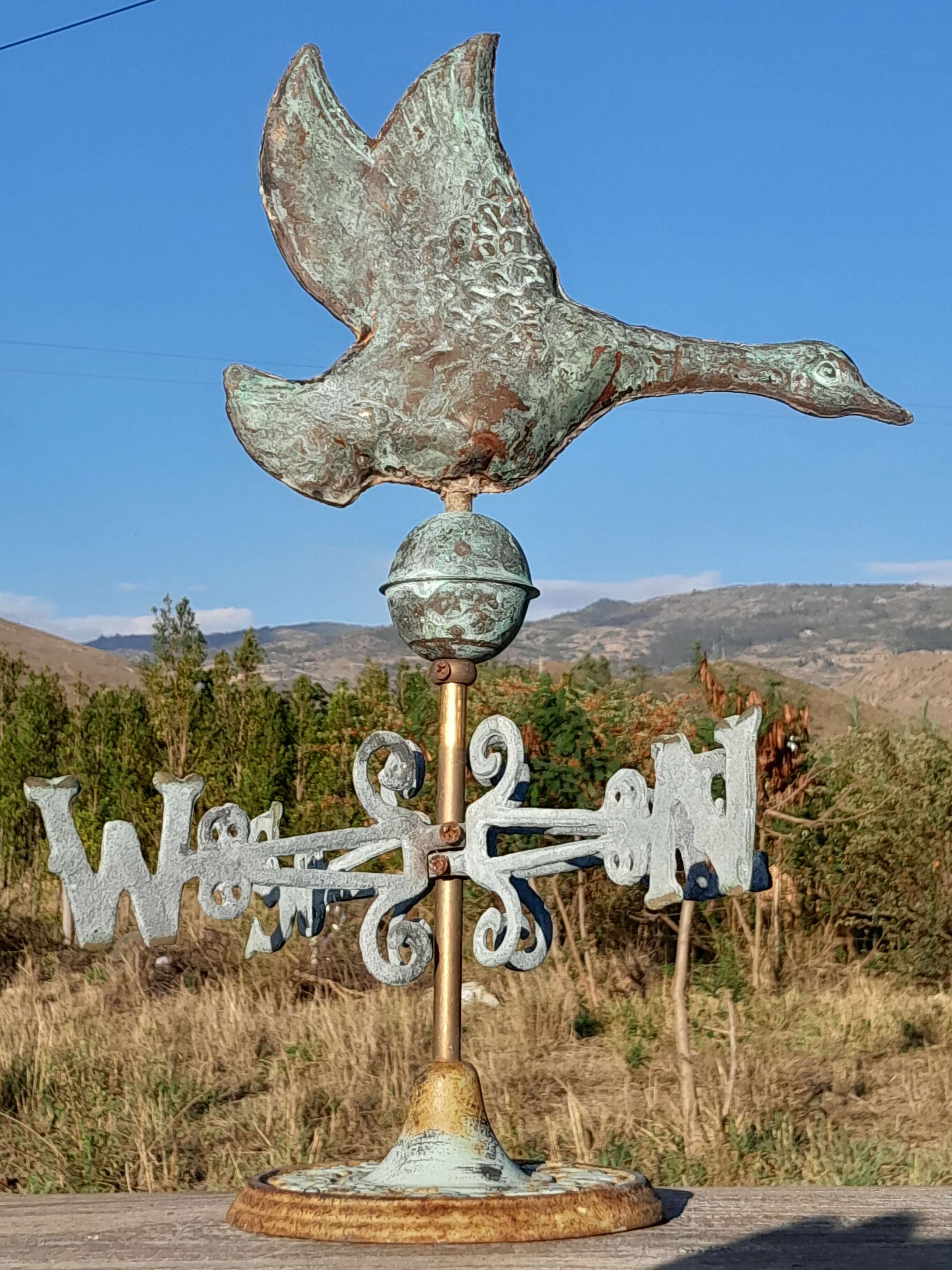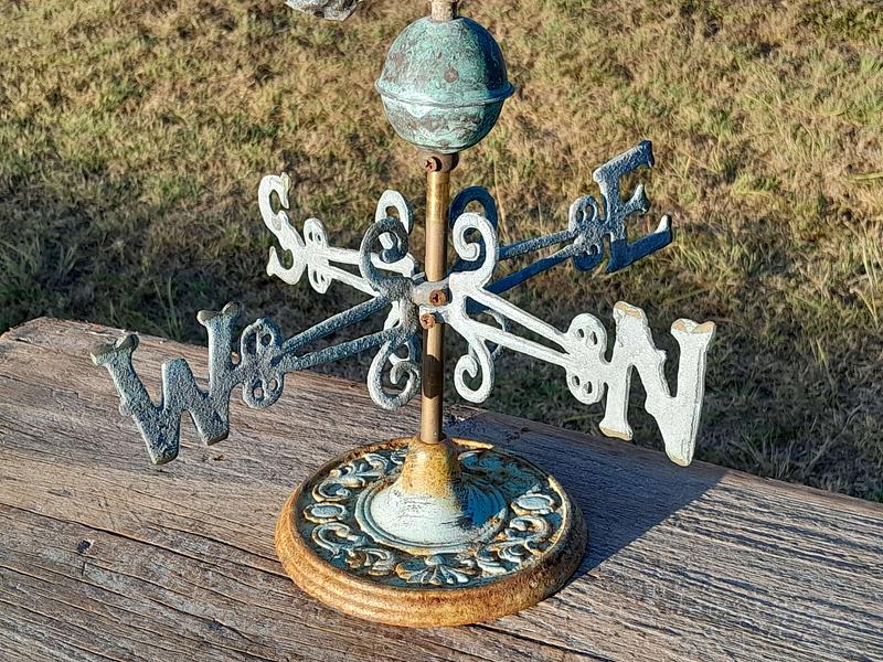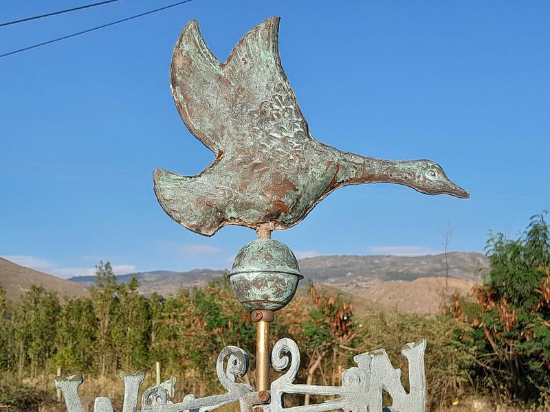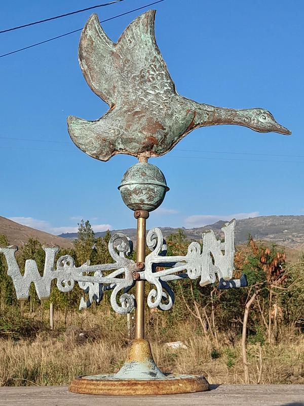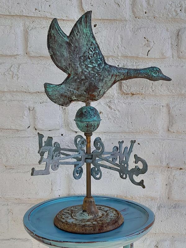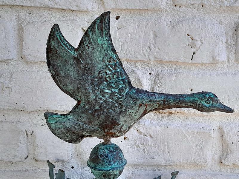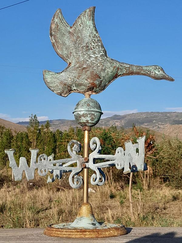 Veleta decorativa de mesa con un pato salvaje de cobre en la parte superior con base y puntos cardinales de hierro. Decorada con pintura verde patinada dándole apariencia antigua.