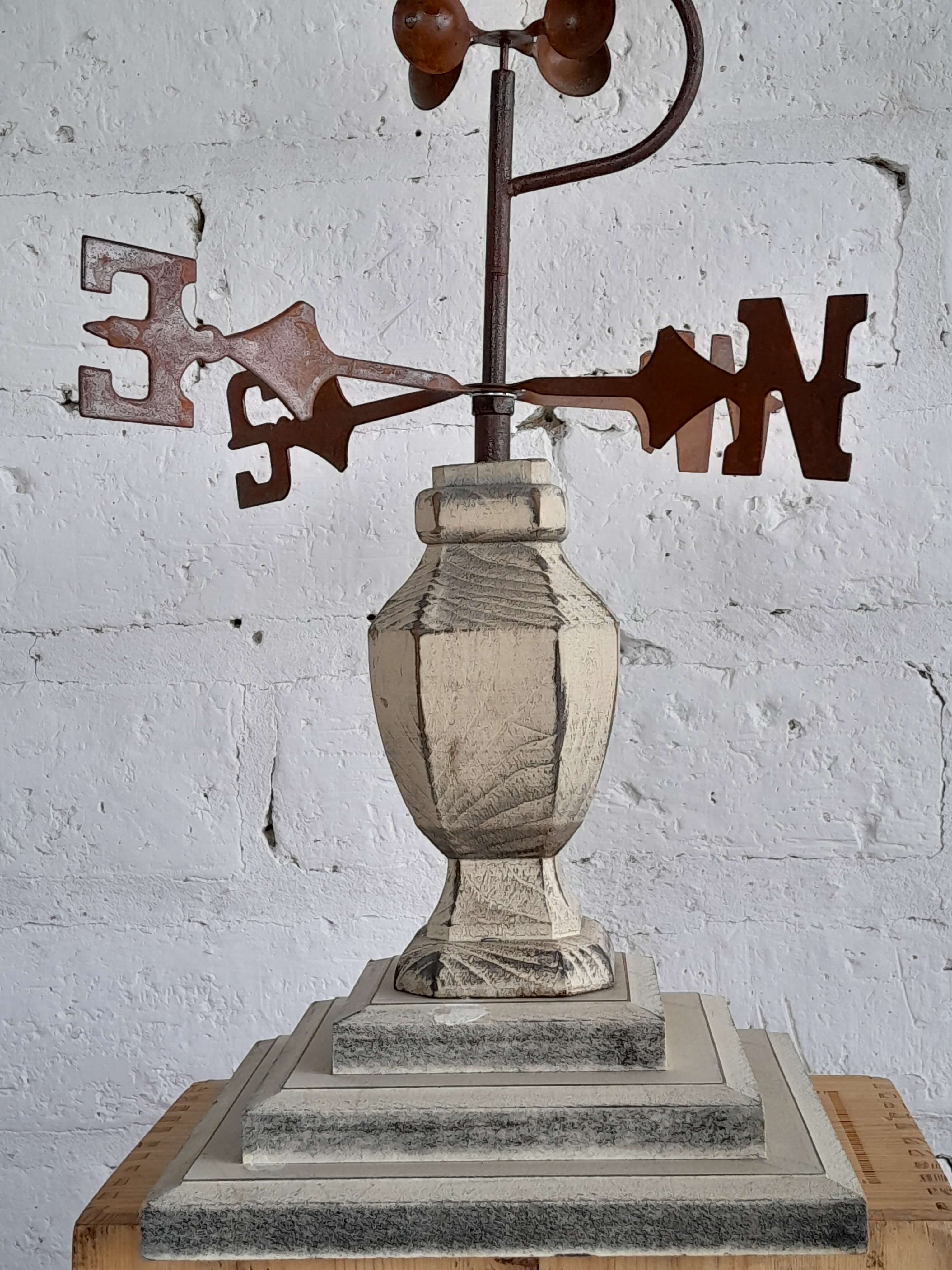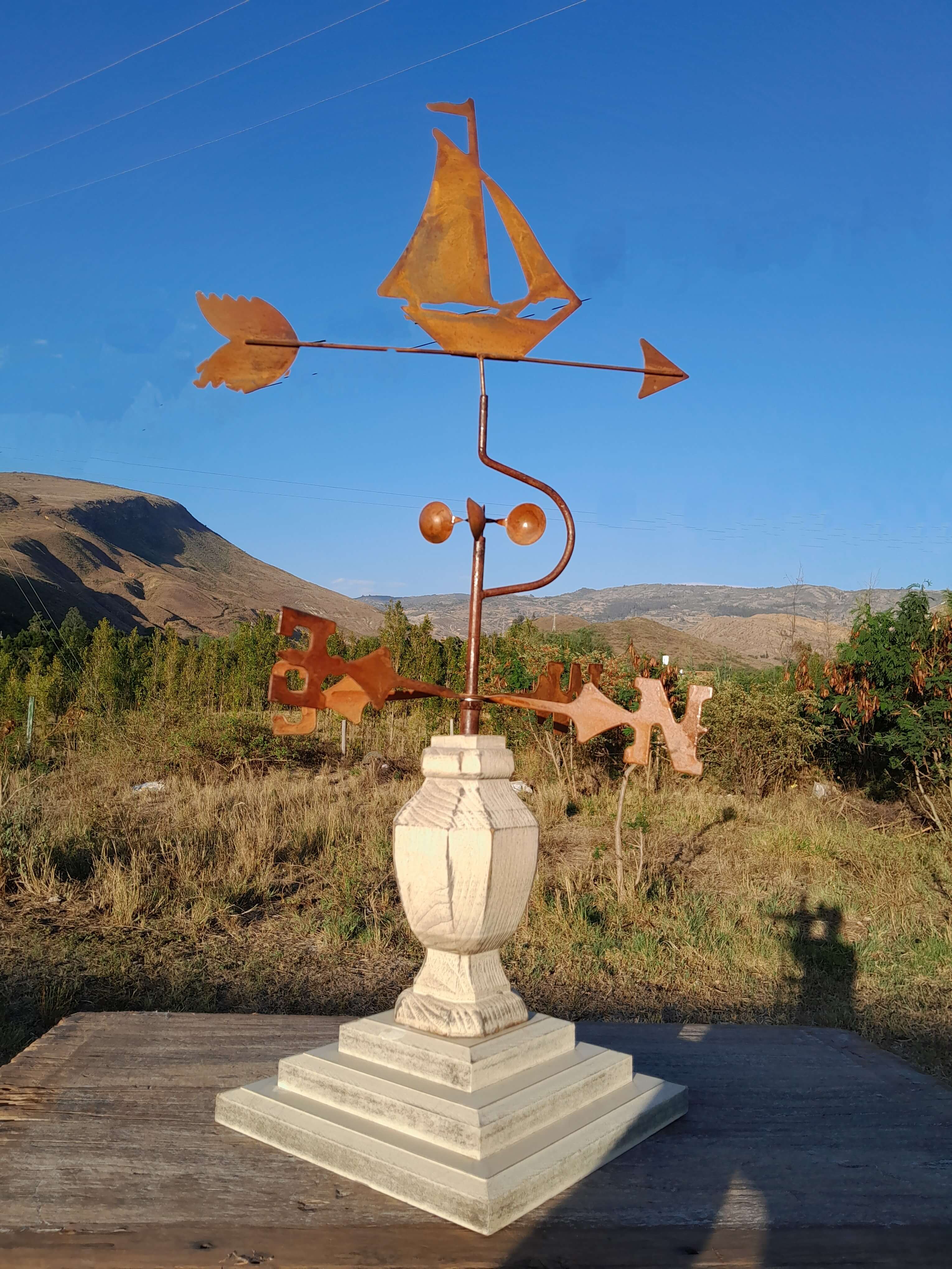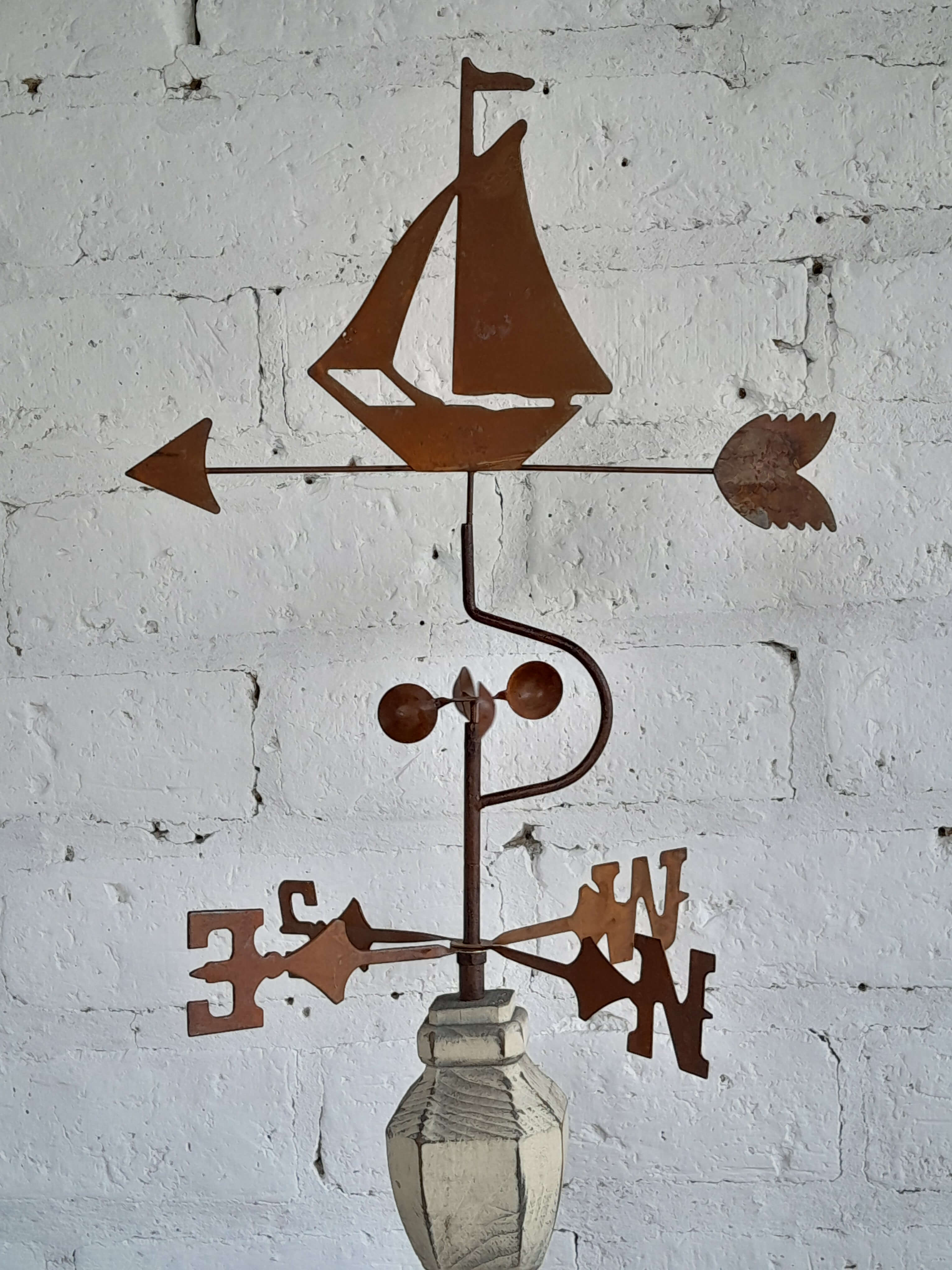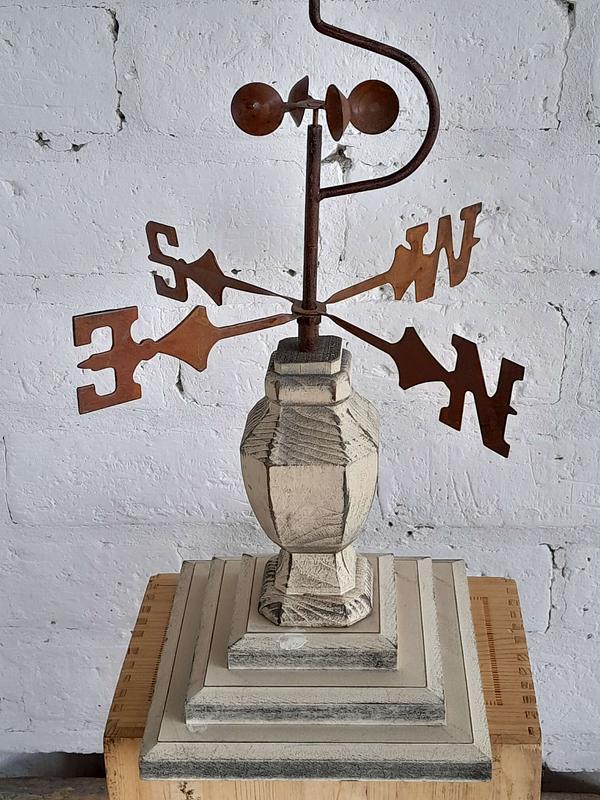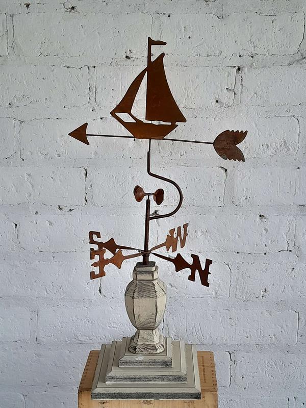 Veleta decorativa de sobre mesa elaborada recientemente con apariencia de una veleta costera antigua. El velero y los putos cardinales son metálicos decorados con pintura patinada de óxido, la base es de madera pintada en blanco desgastado.