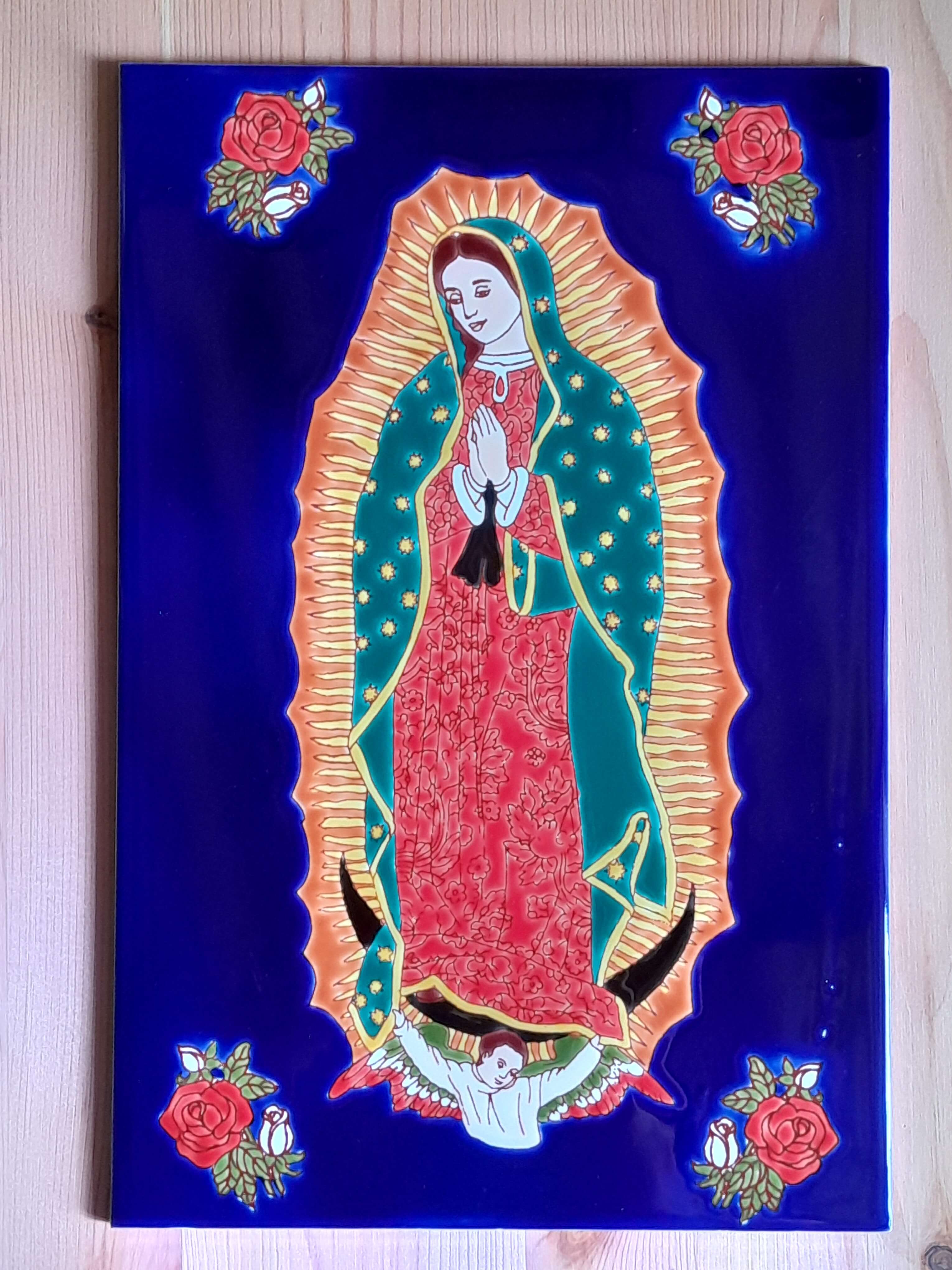 Pintada a mano sobre baldosa y quemadas a alta temperatura. Apta para exteriores. Elaborada con barnices de calidad para garantizar su exposición a la intemperie, sol, lluvia, etc., sin desteñirse. Colores garantizados de por vida. Ideal para empotrar en la pared, decorar fachadas y portales.