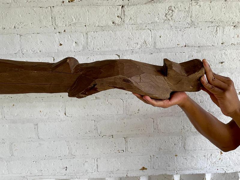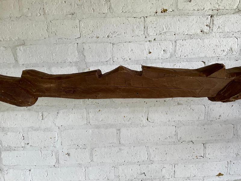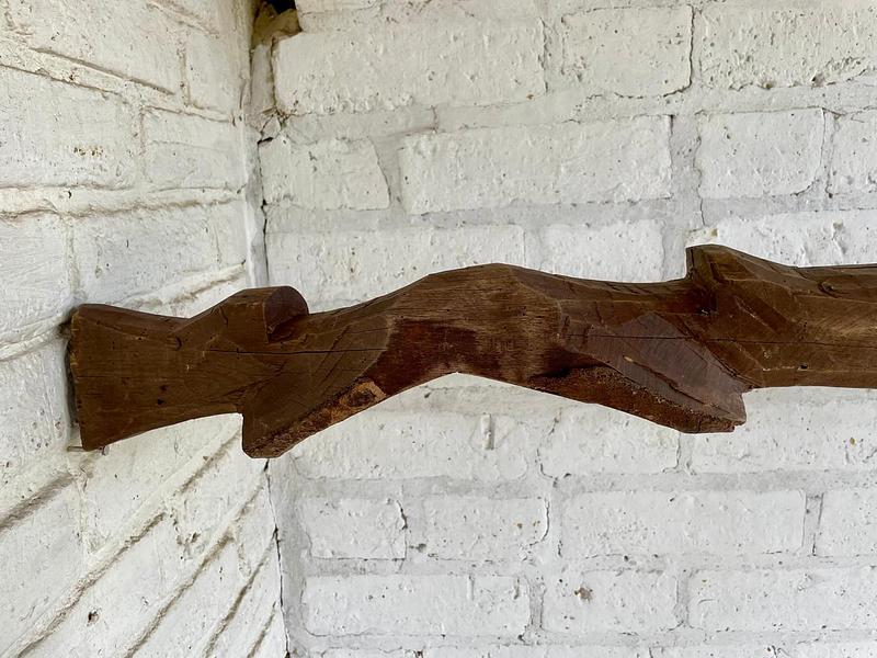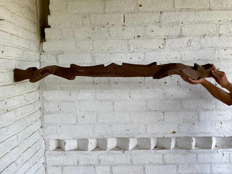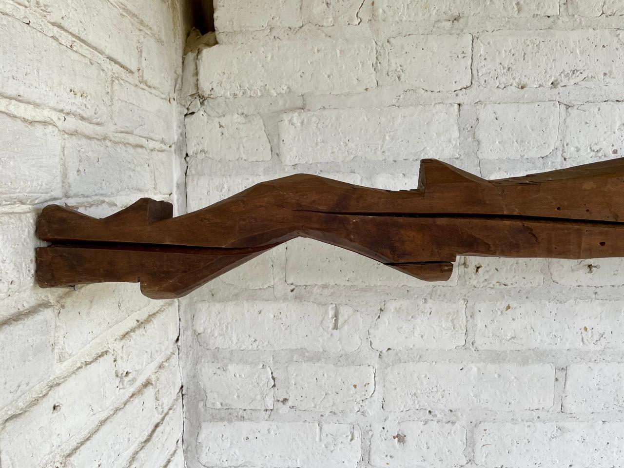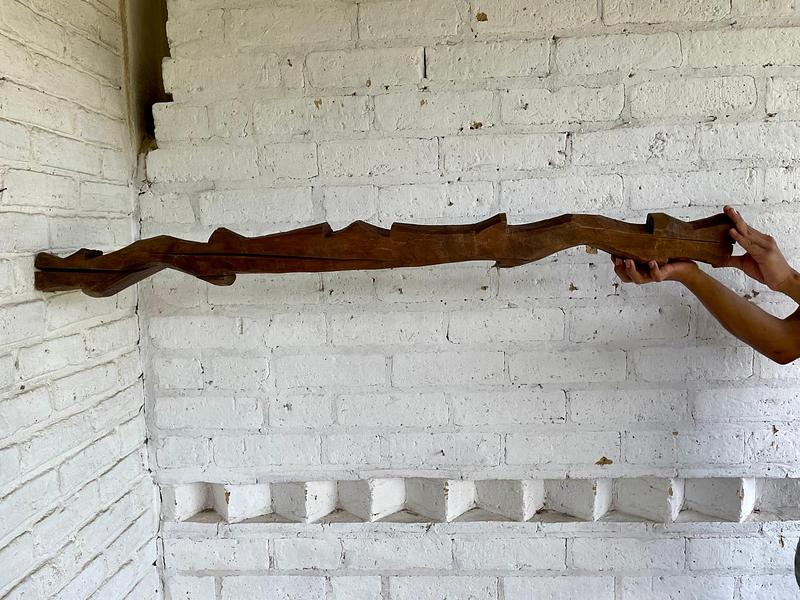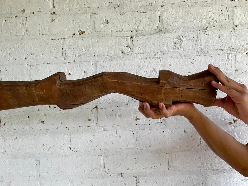 Yugo artesanal de madera de mediados del S XX elaborado en la zona agrícola de Samacá para arar la tierra con una yunta de bueyes. La madera presenta rajaduras y desastilladuras.