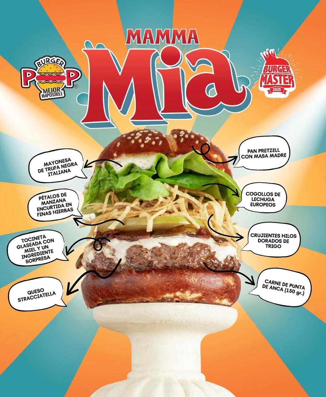 punta de anca con queso straciatela y una tocineta glaseada en miel, en pan pretzel, acompañado de mayonesa de truja, manaza encurtida y hilos trigo