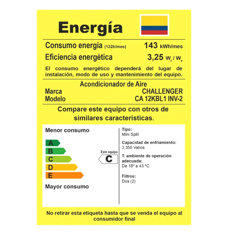 Capacidad de refrigeración: 12000 Btu/h (3350 W) / 1 Ton