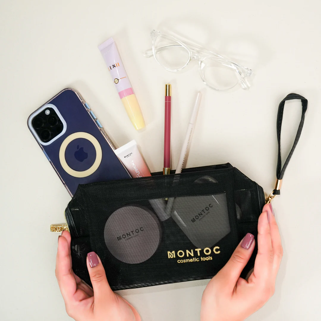 Una cosmetiquera negra con textura de malla y cierre dorado que aporta un toque elegante.