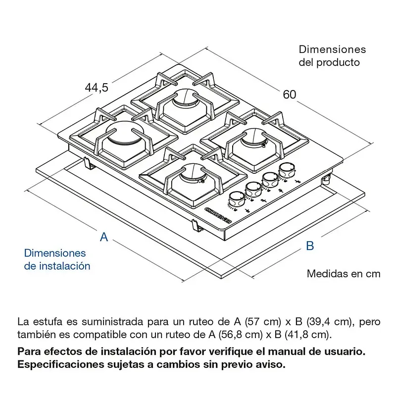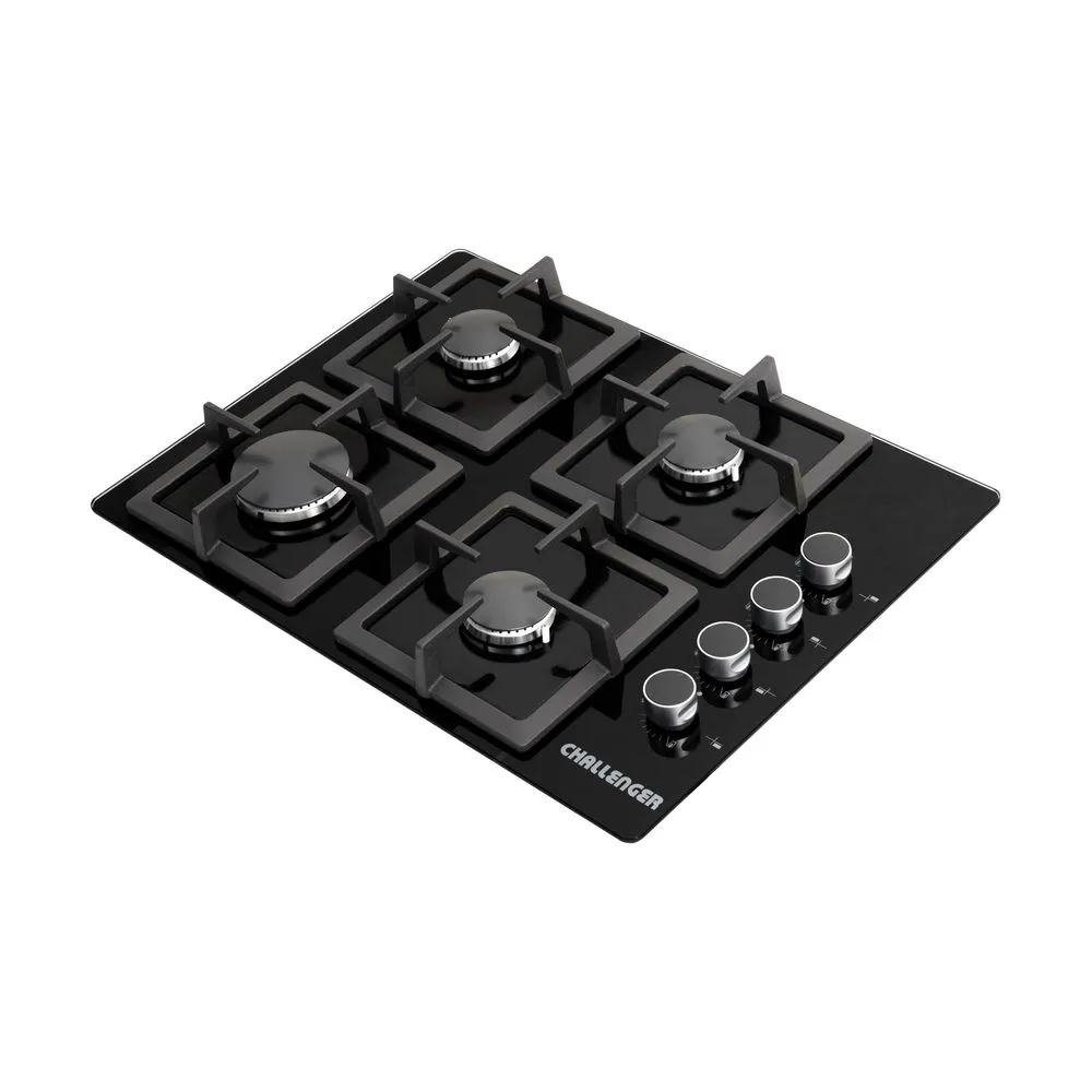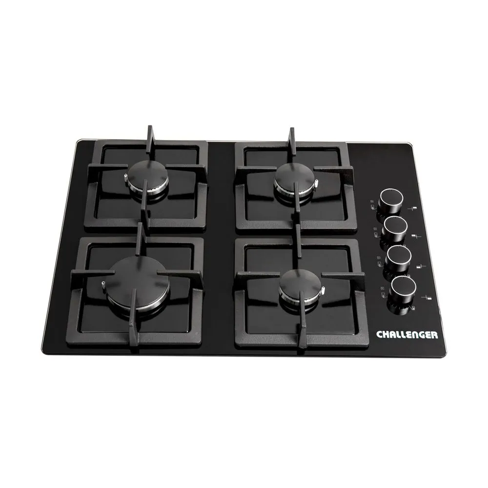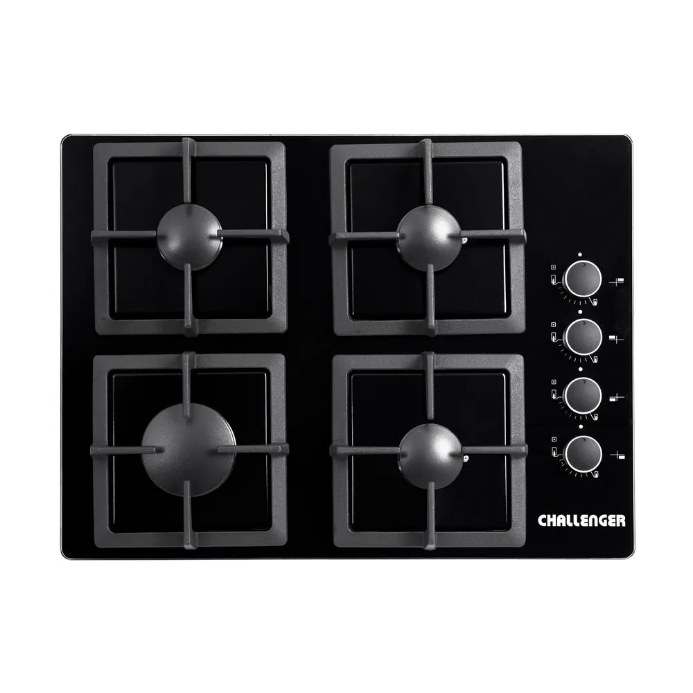 Estufa de empotrar SQ6759 Challenger 60 cm en vidrio templado negro. 4 puestos SABAF, encendido electrónico y parrillas en hierro fundido resistentes.